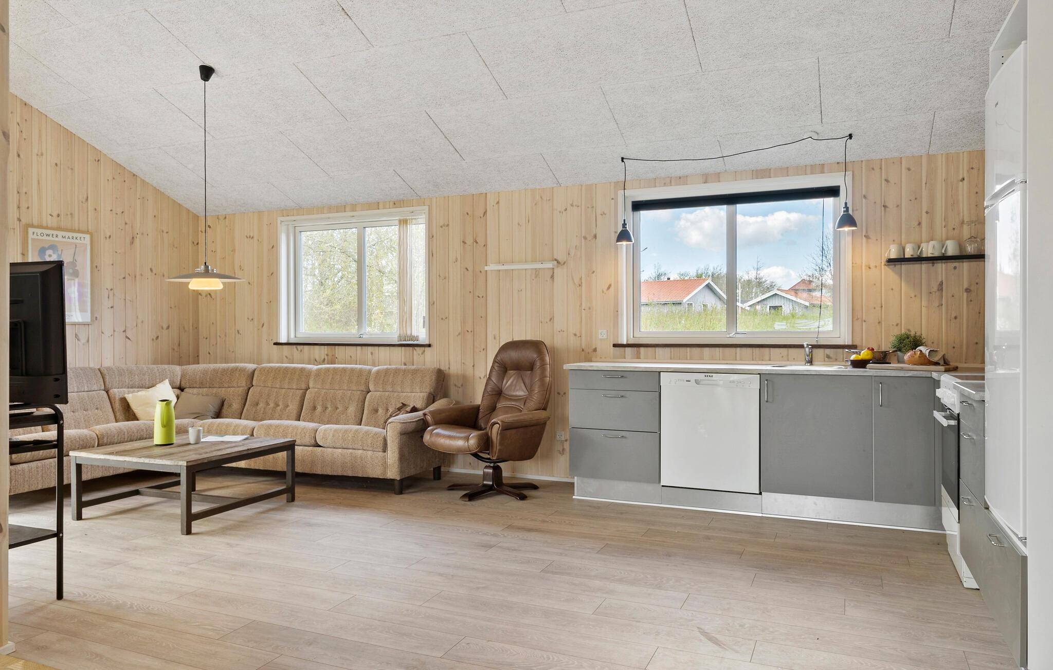 Moderne træhus ved Handbjerg Strand med lys og åben indretning nær Limfjorden.
