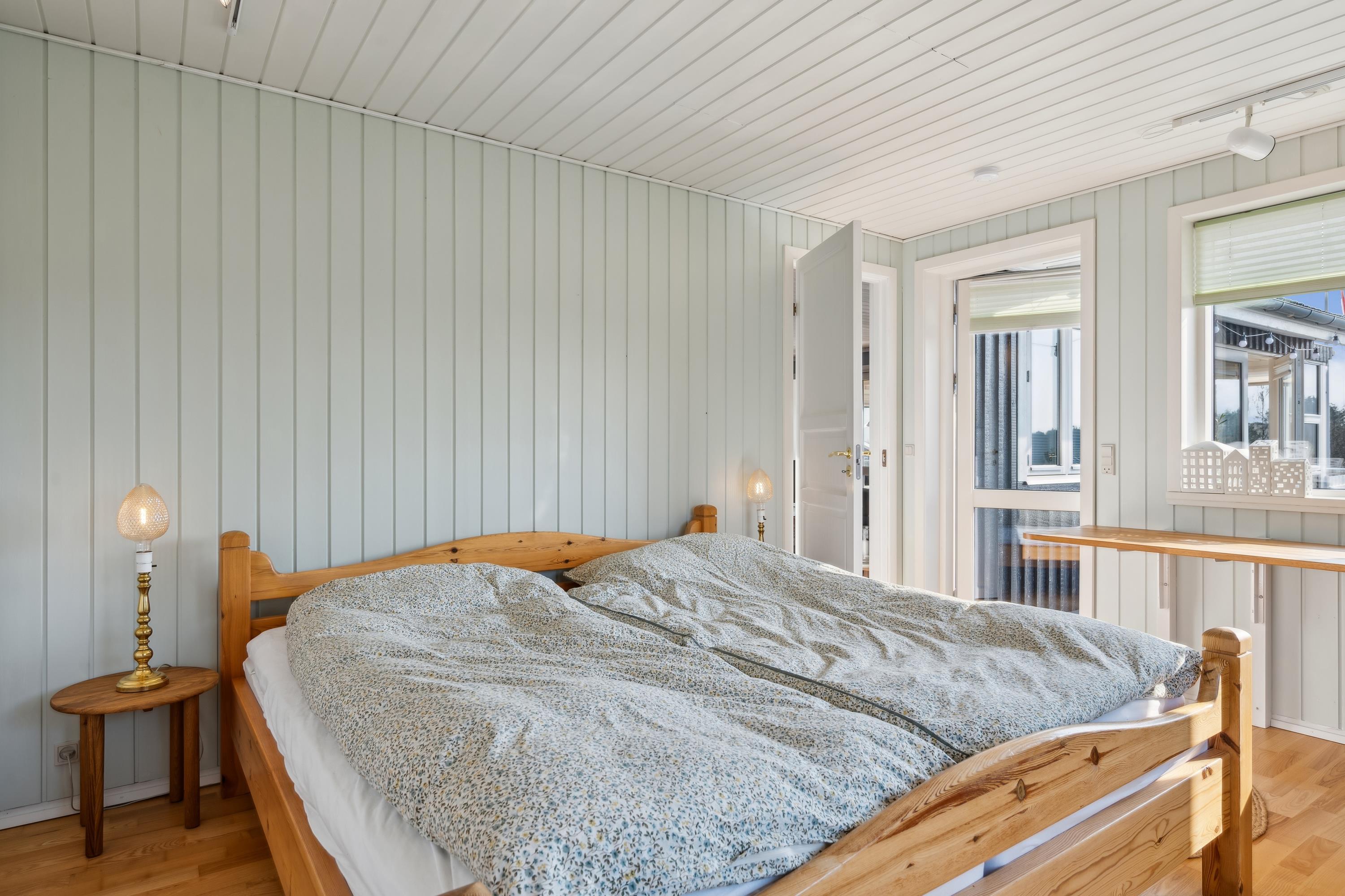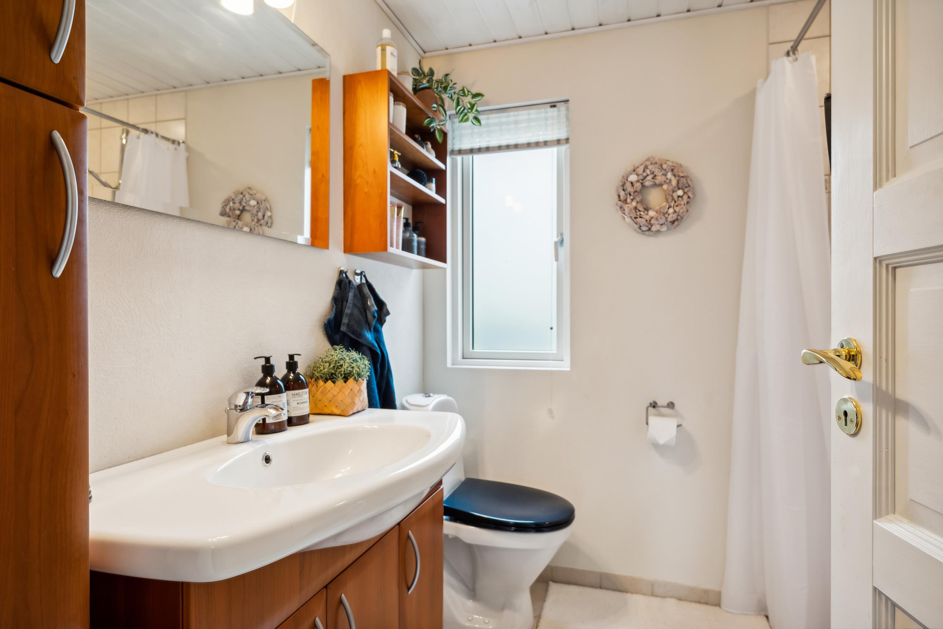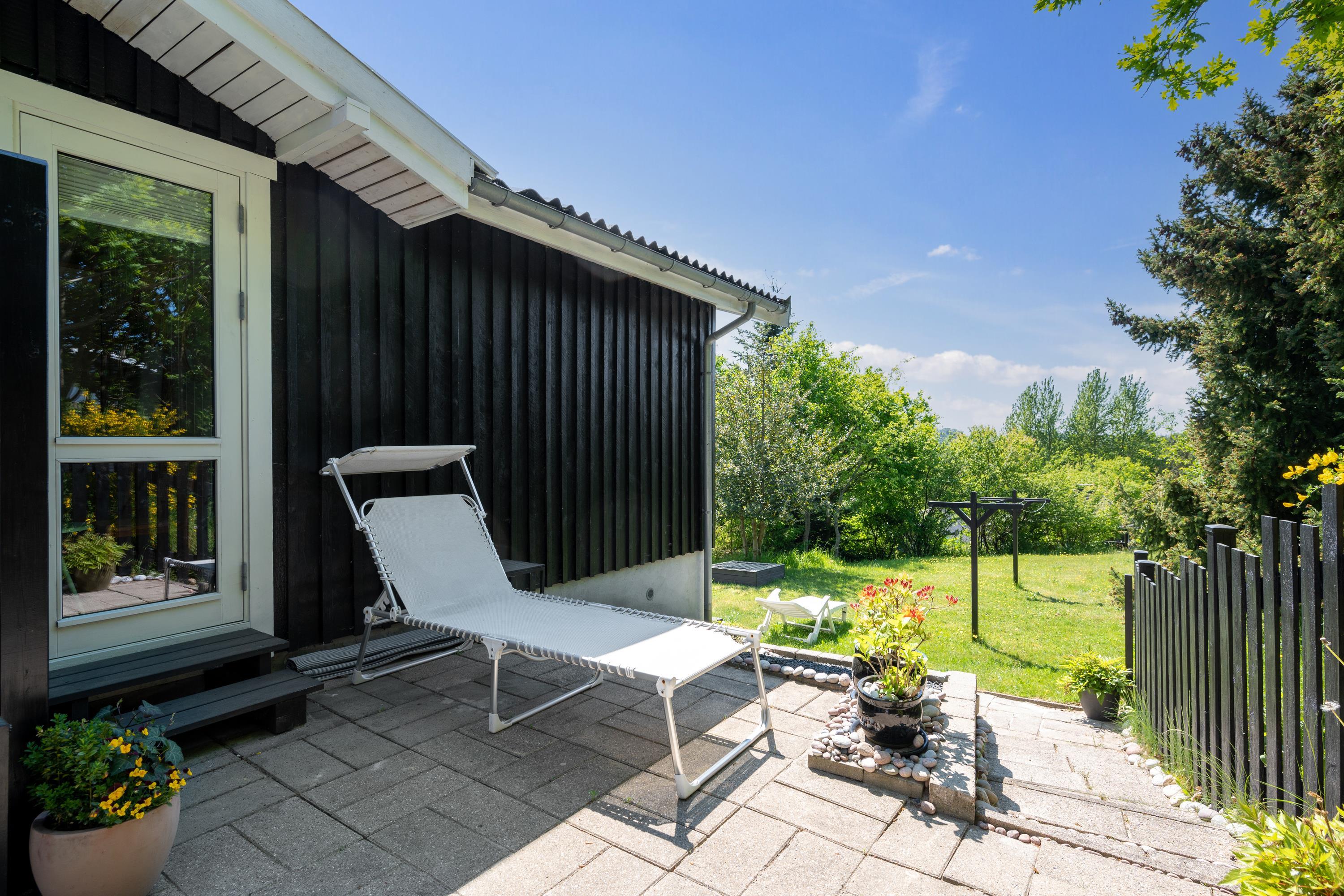 Til de små feriegæster er der babybadekar, høj stol, puslebord og barneseng til rådighed. Ved huset er der store terrassearealer med havemøbler og der findes også en udendørsbruser. Ved indgangspartiet er der en stor overdækket terrasse, hvor man kan trække om på en kølig aften og samtidig være ude. Udendørs er der også tænkt på de små feriegæster med en sandkasse. Huset er beliggende på en skrånende grund med stor græsplæne, velegnet til leg og udendørs hygge. Et "rigtigt" feriehus i hyggelige omgivelser og på en meget børnevenlig vej.