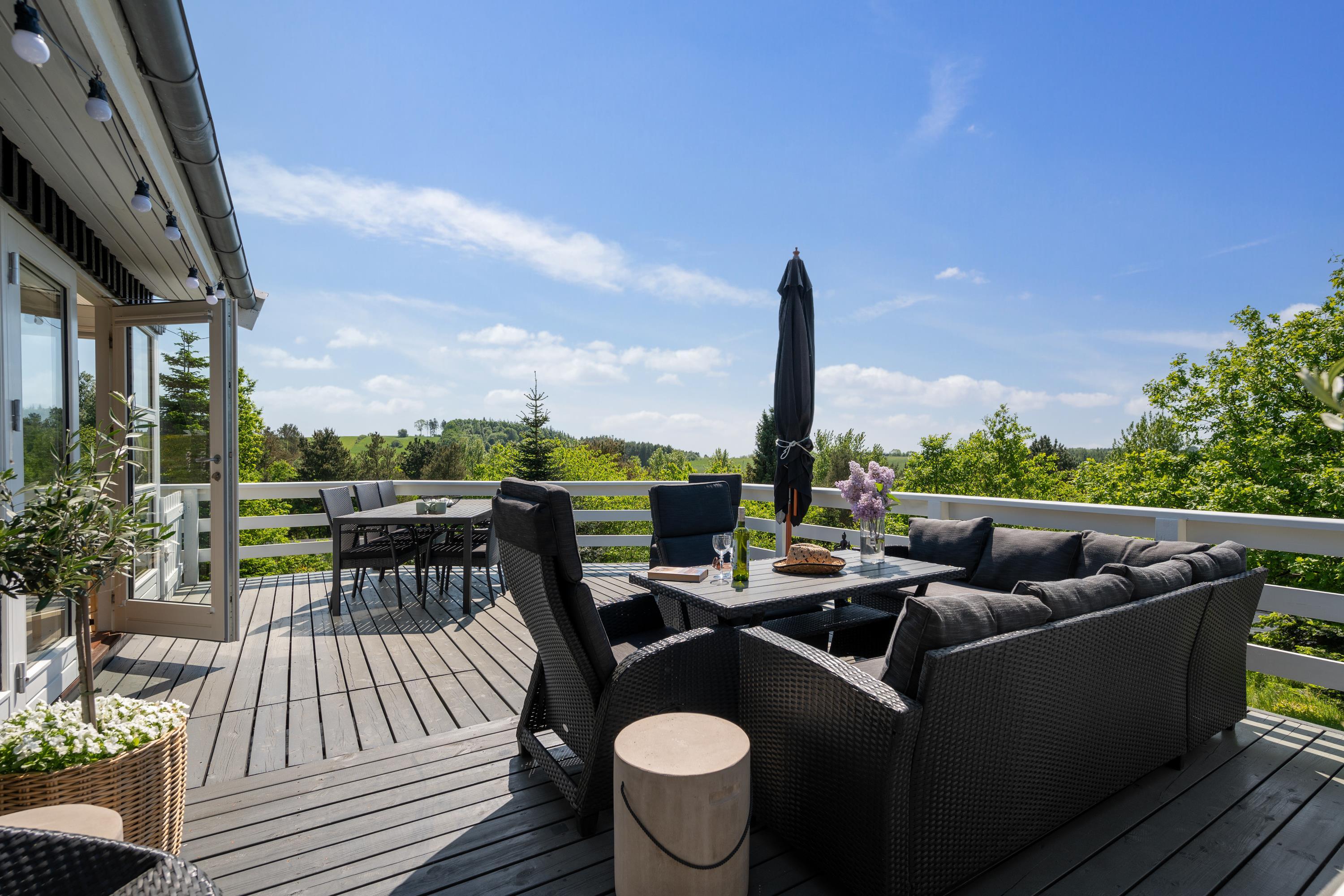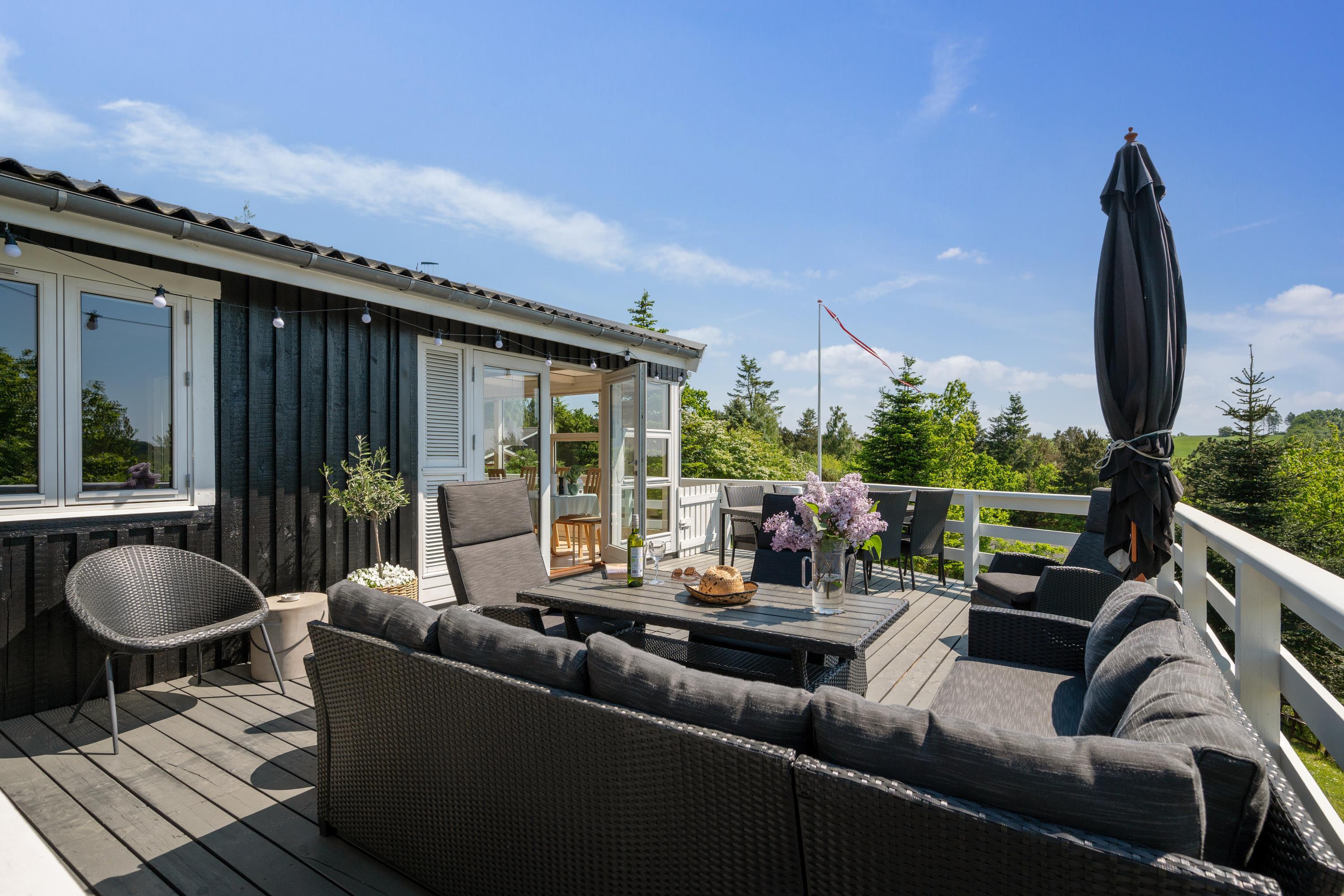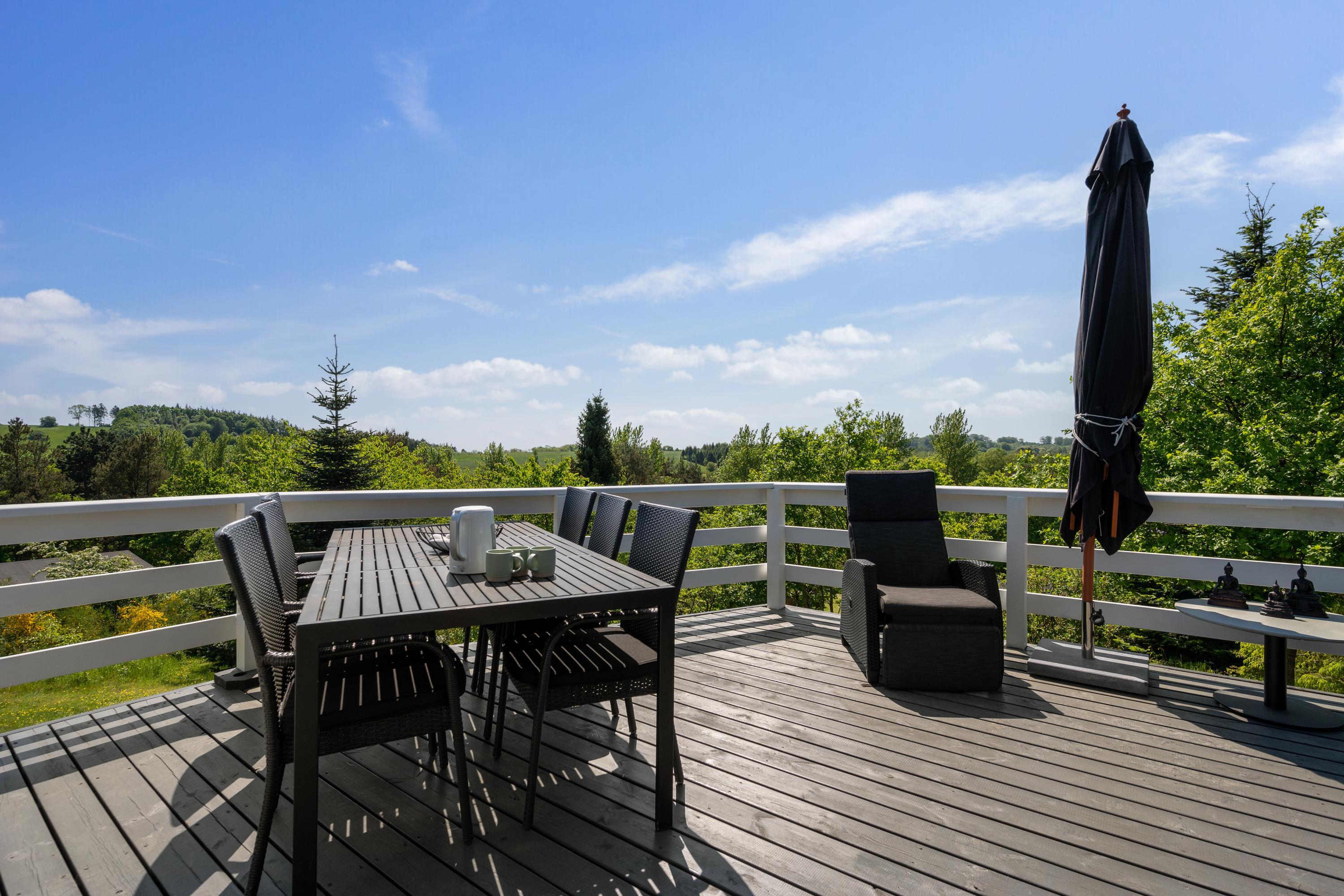 Lad ferien og afslapningen begynde i dette flotte feriehus, hvor der såvel inde som ude er kræset for alle detaljer. Her ankommer man til et overdækket indgangsparti, hvorfra der er indgang til det flotte og velfungerende køkken. Hyggelig velindrettet og indbydende stue med bl.la varmepumpe og et dejligt fjernsyns hjørne. Her er der en integreret udestue, hvor man finder spisestuen og hvorfra der er udgang til en fantastisk nylavet terrasse. Terrassen er indrettet med masser af gode havemøbler, og hvorfra der er en flot udsigt over Handrup Bakker. Husets sovepladser fordeler sig på tre hyggelige værelser, hvoraf de to er med dobbeltsenge og et værelse med to enkelt senge. To af værelserne har egen udgang til terrasse. Dejligt badeværelse med gulvvarme. Der findes et lille bryggers med adgang til både vaskemaskine og tørretumbler. Ved indgangspartiet findes et integreret rum, hvor man finder mikrobølgeovn m.m.