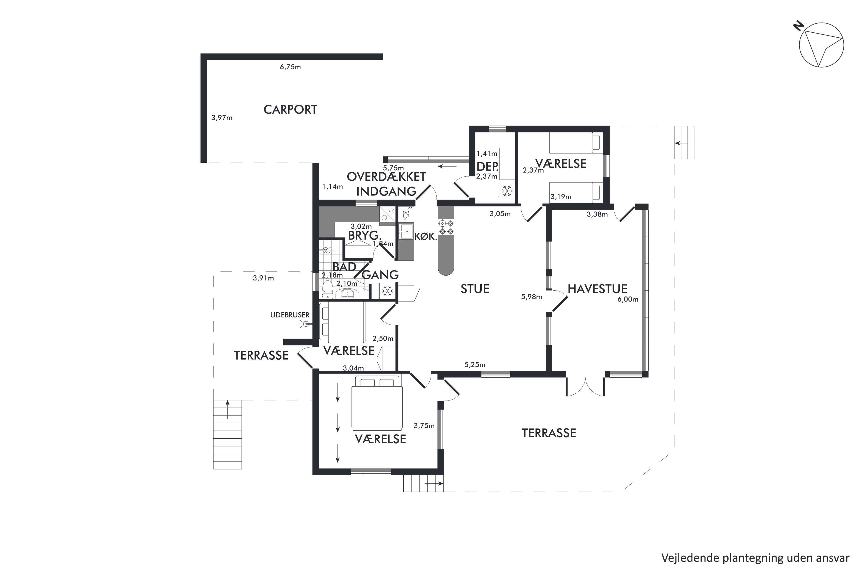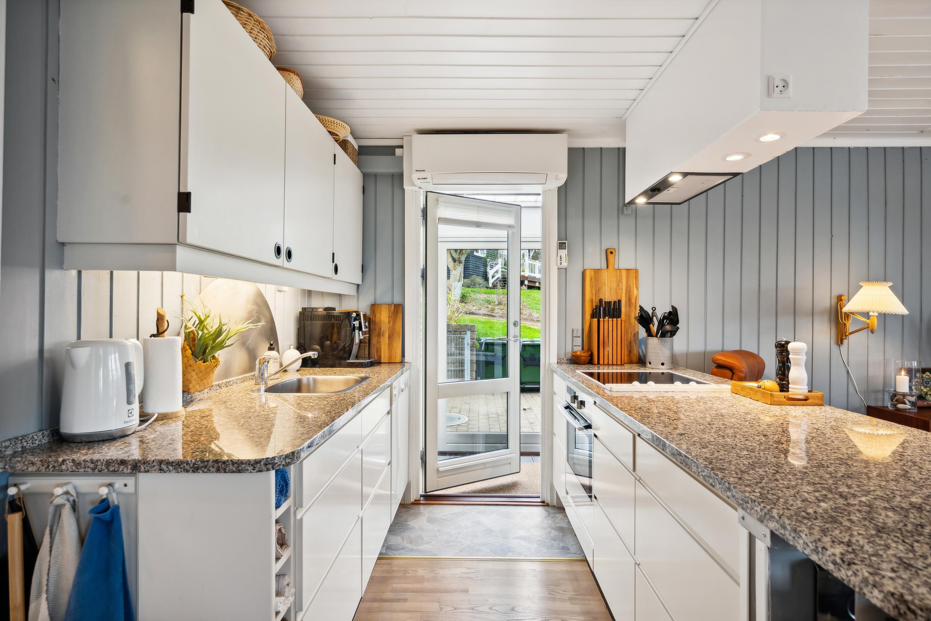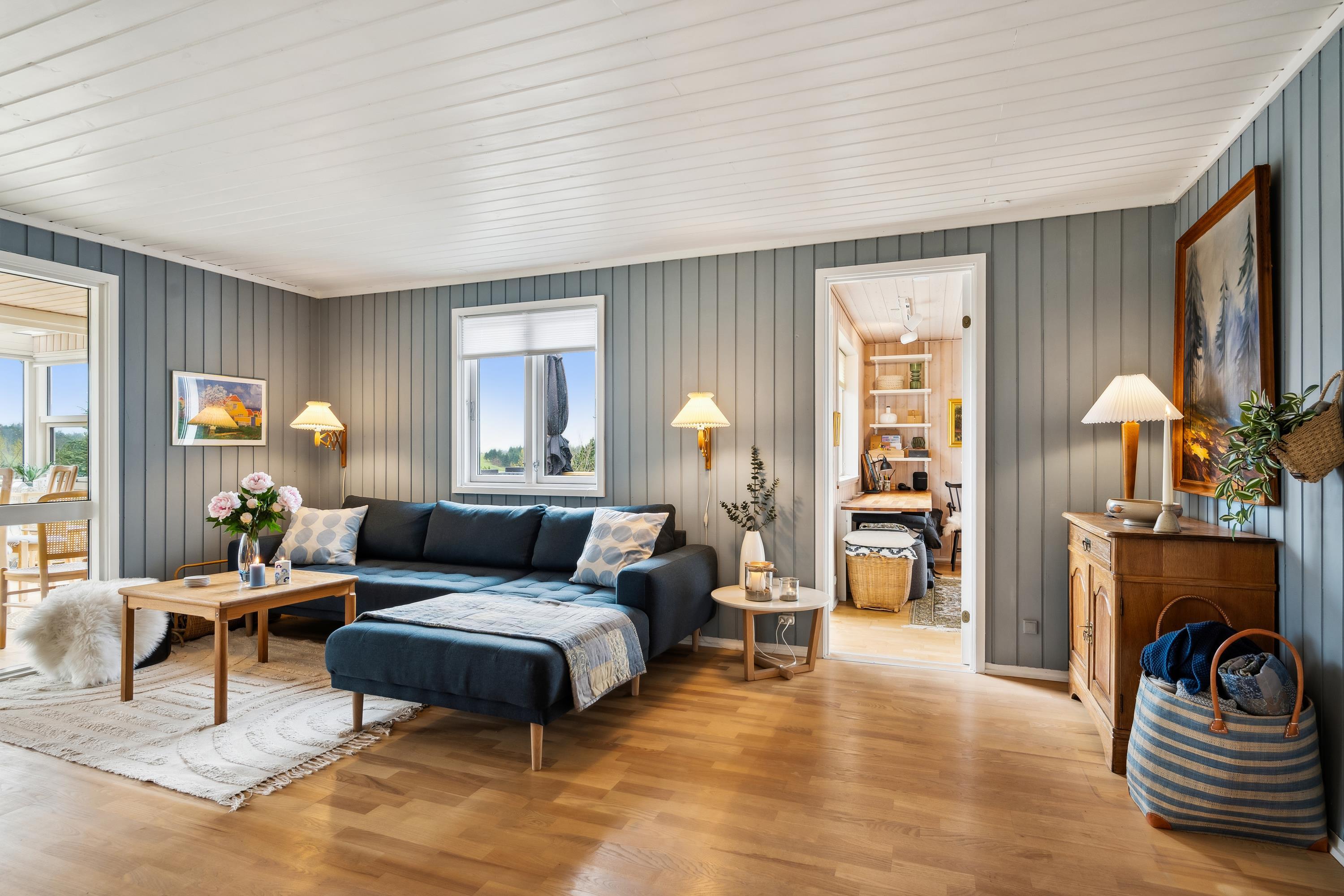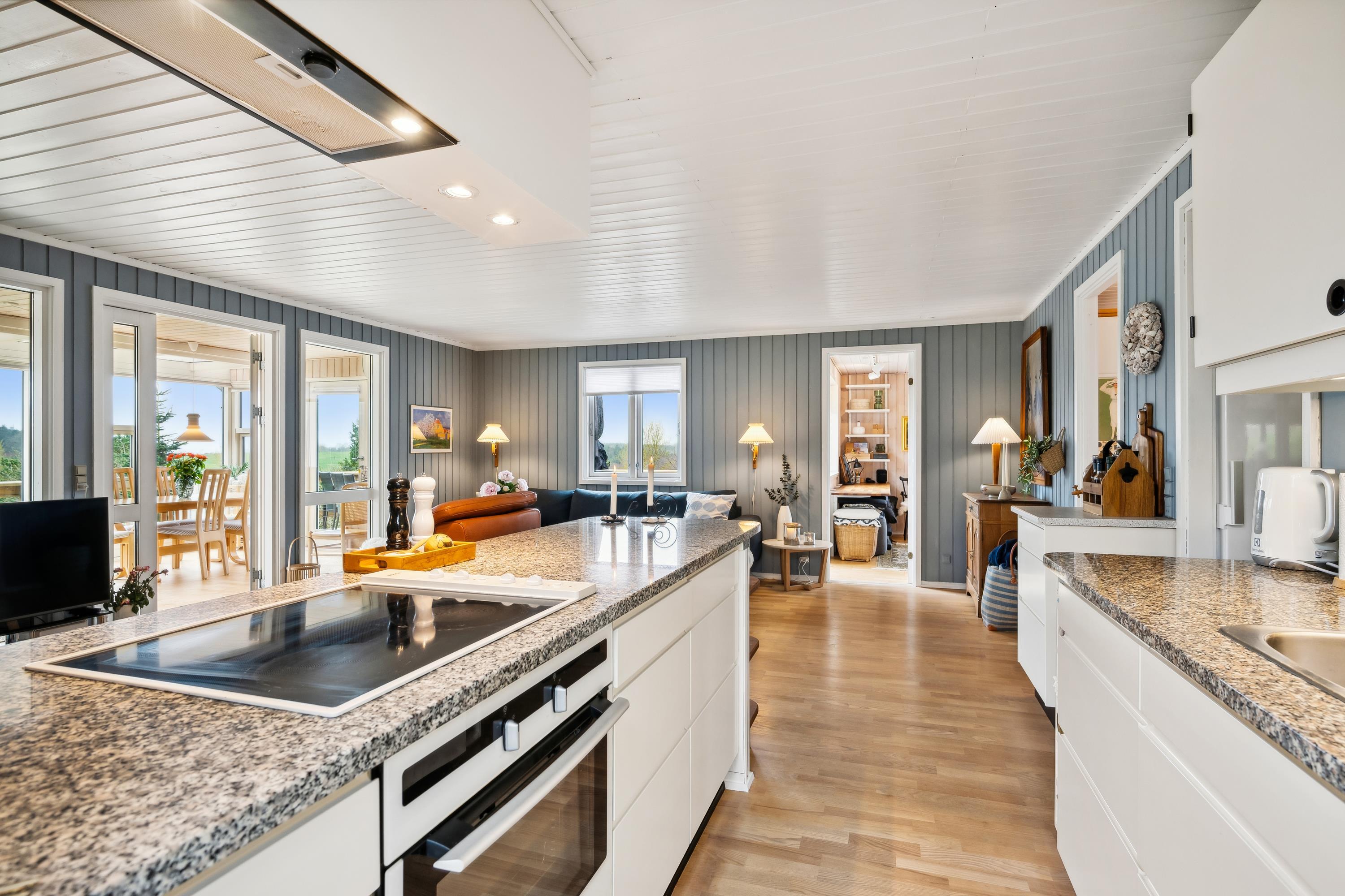 Lad ferien og afslapningen begynde i dette flotte feriehus, hvor der såvel inde som ude er kræset for alle detaljer. Her ankommer man til et overdækket indgangsparti, hvorfra der er indgang til det flotte og velfungerende køkken. Hyggelig velindrettet og indbydende stue med bl.la varmepumpe og et dejligt fjernsyns hjørne. Her er der en integreret udestue, hvor man finder spisestuen og hvorfra der er udgang til en fantastisk nylavet terrasse. Terrassen er indrettet med masser af gode havemøbler, og hvorfra der er en flot udsigt over Handrup Bakker. Husets sovepladser fordeler sig på tre hyggelige værelser, hvoraf de to er med dobbeltsenge og et værelse med to enkelt senge. To af værelserne har egen udgang til terrasse. Dejligt badeværelse med gulvvarme. Der findes et lille bryggers med adgang til både vaskemaskine og tørretumbler. Ved indgangspartiet findes et integreret rum, hvor man finder mikrobølgeovn m.m.