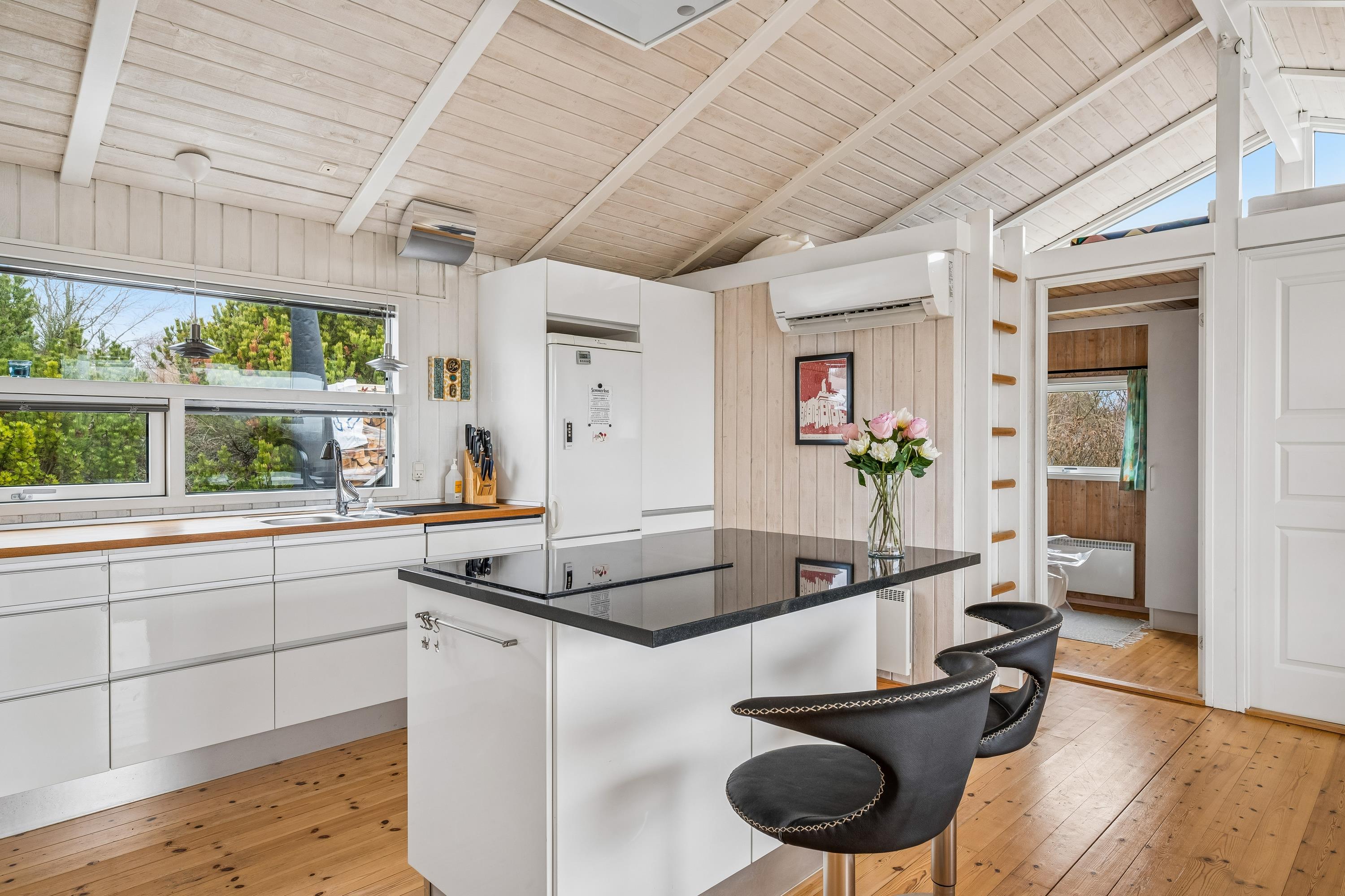 Køkkenet er flot og veludstyret, blandt andet med opvaskemaskine og en god spiseafdeling, perfekt til hyggelige måltider med familie eller venner. Huset har tre soveværelser med dobbeltsenge:
