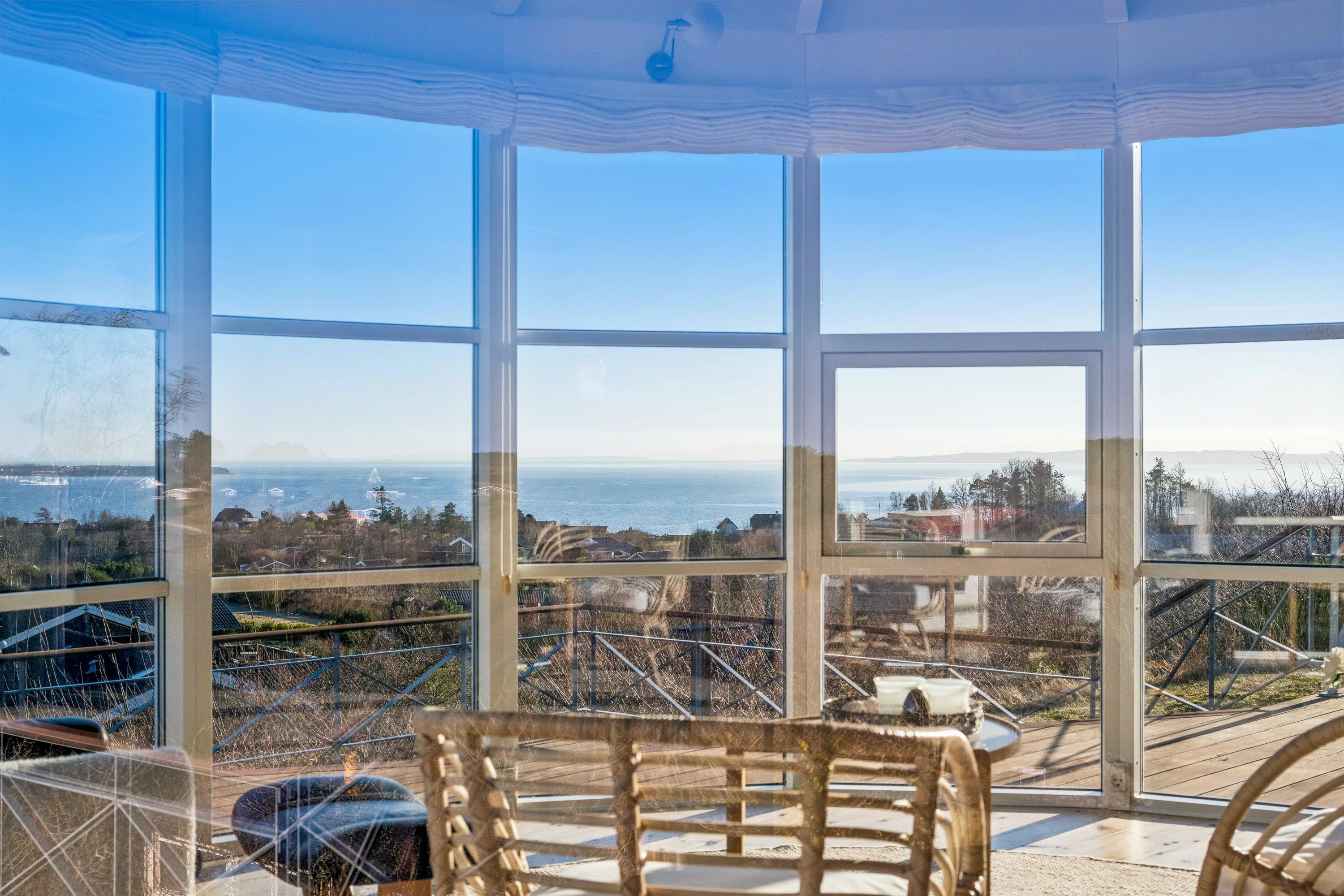Det store badeværelse har gulvvarme, bruseniche samt vaskesøjle med vaskemaskine og tørretumbler. Den forsænkede opholdsstue med komfortable møbler og brændeovn giver hygge og varme, og herfra er der direkte adgang til en dejlig terrasse med havemøbler, hvorfra man kan nyde den smukke udsigt til vandet.