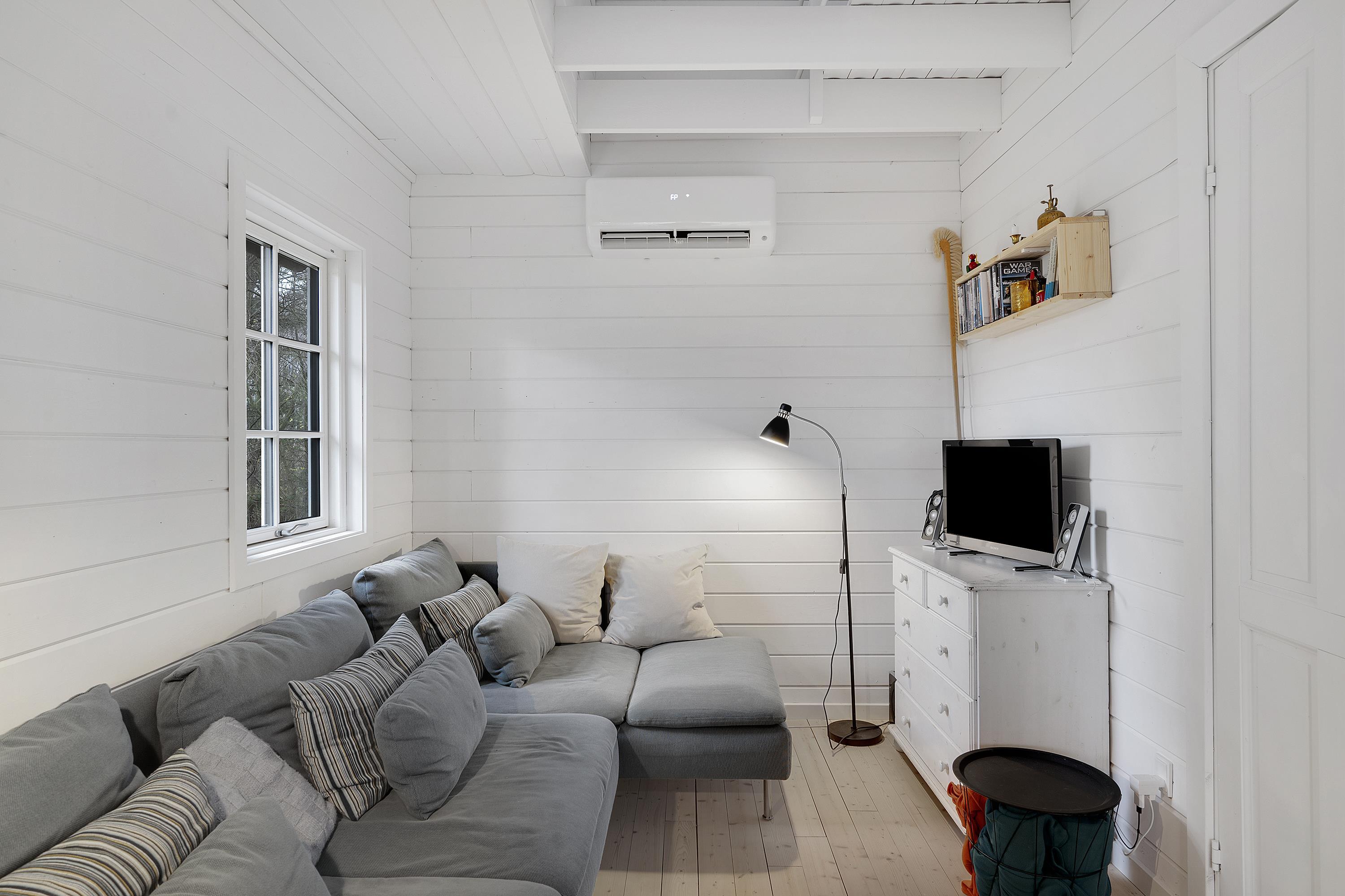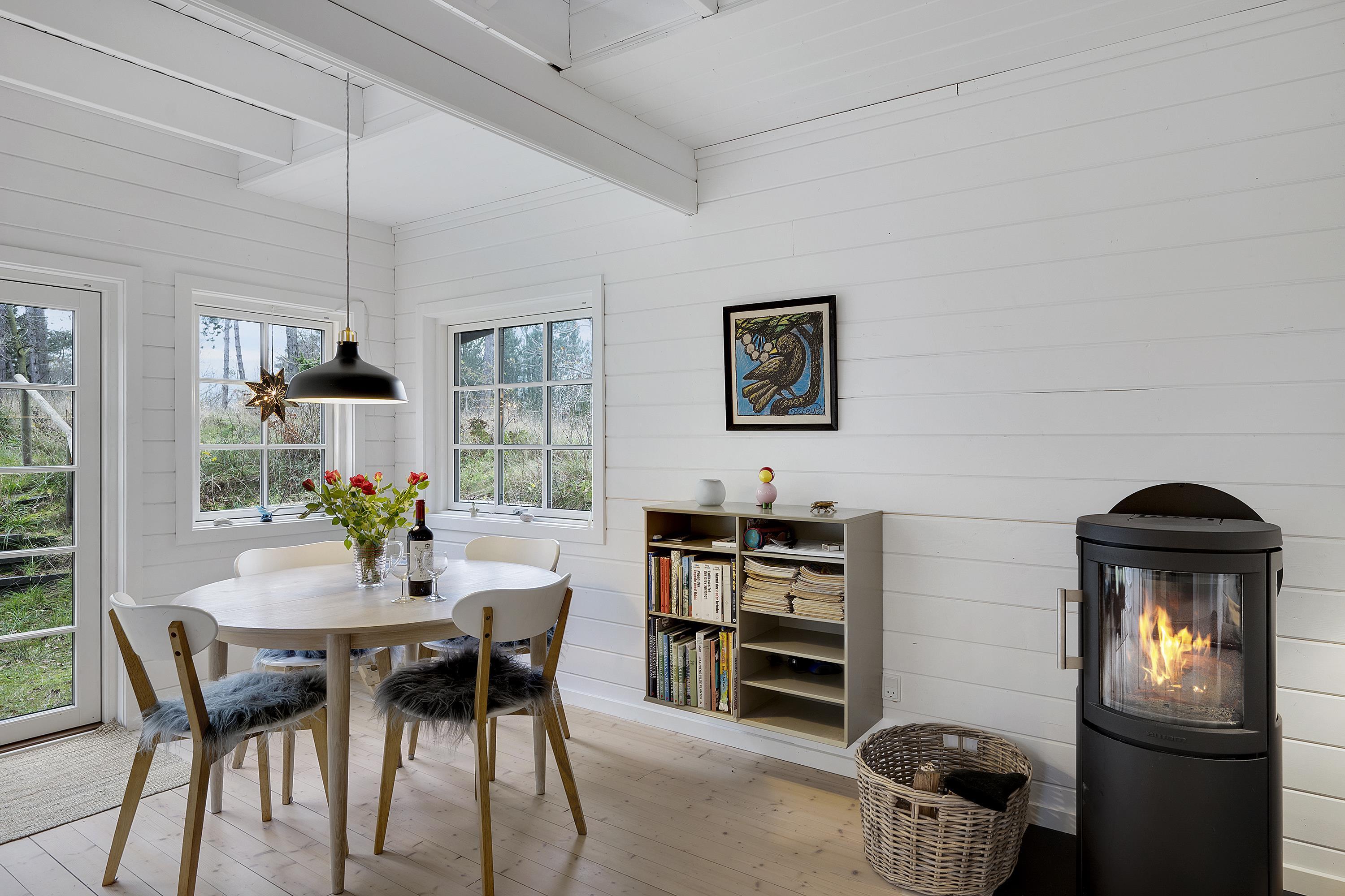Hyggeligt og totalrenoveret feriehus ved Handrup Strand med brændeovn, varmepumpe og adgang til vaskefaciliteter.