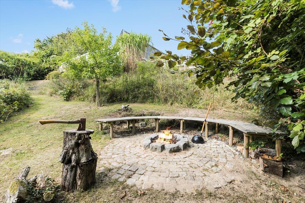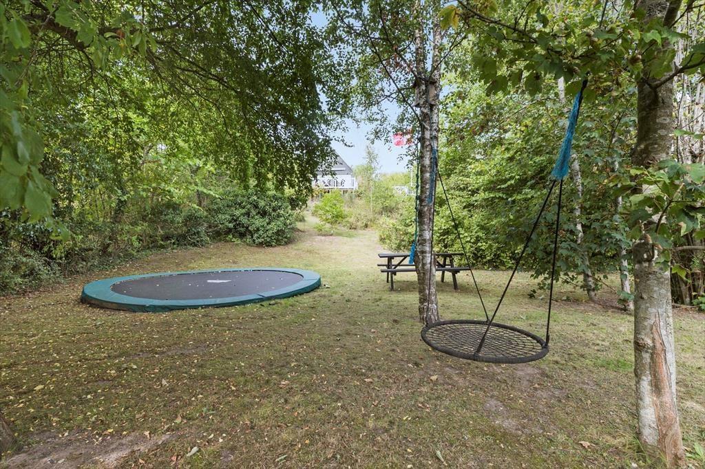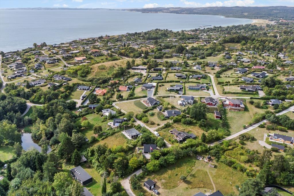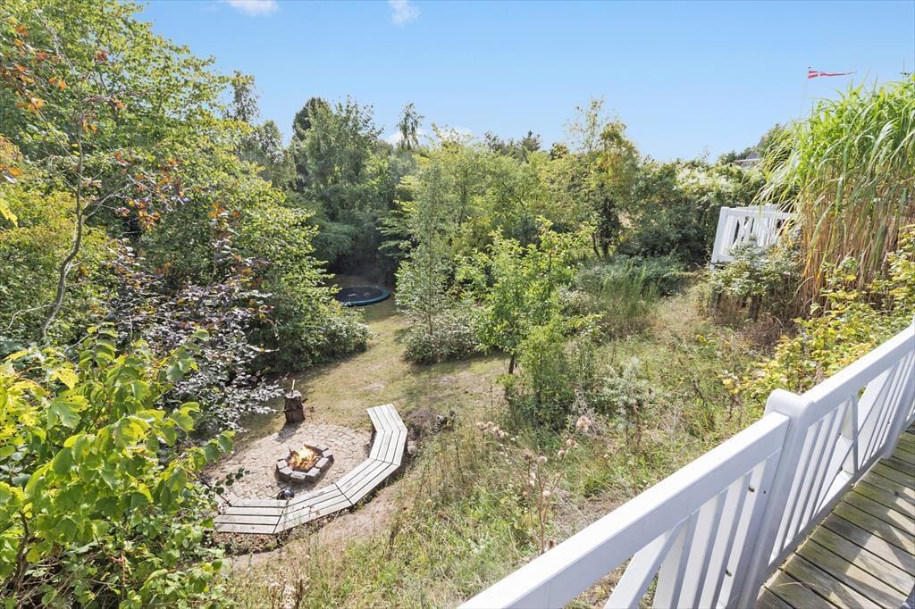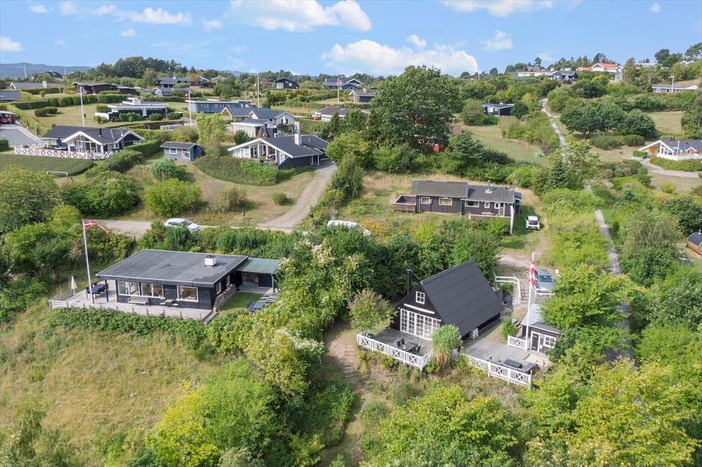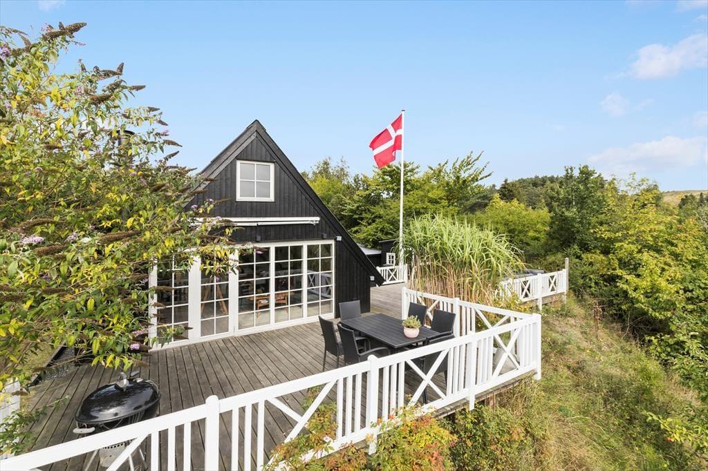 Feriehuset ligger for enden af en lukket vej og har en smuk udsigt over det bakkede landskab. Den høje beliggenhed giver en dejlig fornemmelse af ro, og samtidig er du kun 600 meter fra den børnevenlige badestrand i Ebeltoft Vig. Udenfor venter en fantastisk grund med en stor terrasse, hvor du kan nyde solen, mens børnene leger i legehuset eller sandkassen. Fra terrassen fører en trappe ned til haven, der er ”vild med vilje” – en skøn, lukket oase, hvor du kan nyde lange eftermiddage og lune aftener omkring bålet. Her er også en trampolin til børnene og en sømblok til de voksne, der vil dyste på deres hammerfærdigheder.