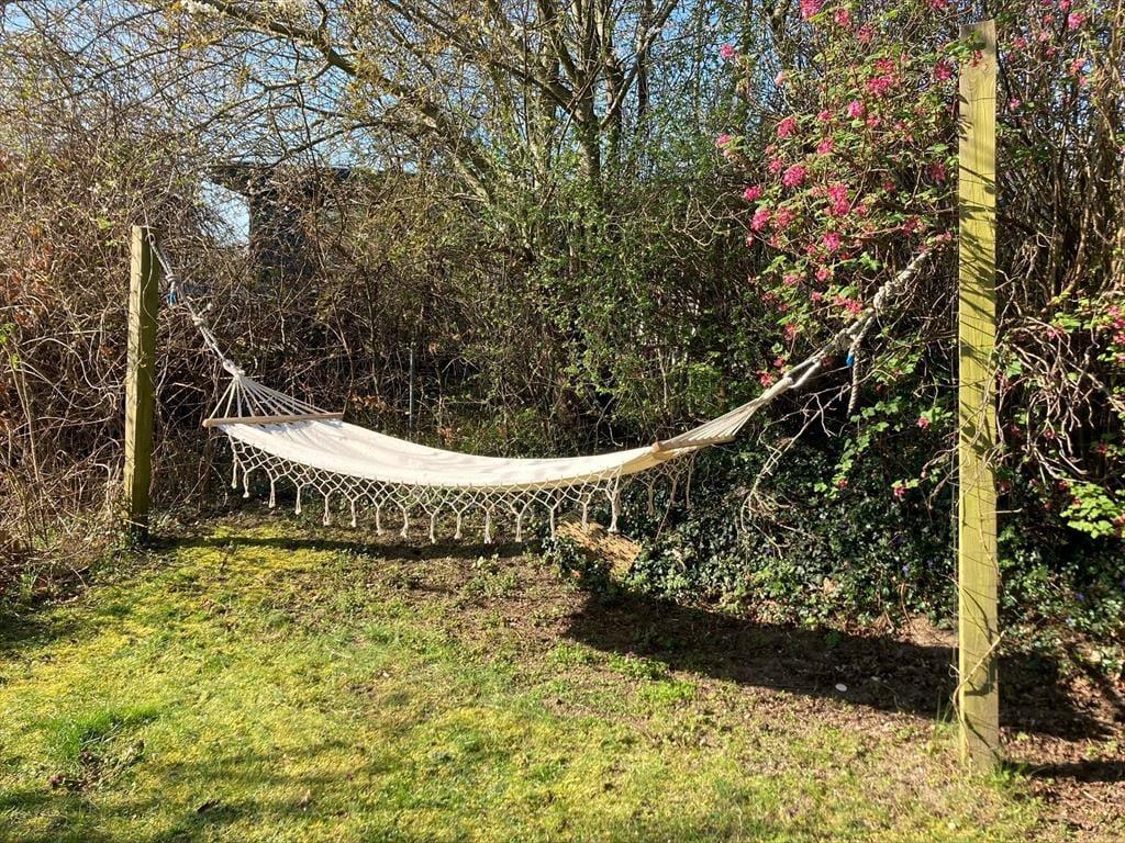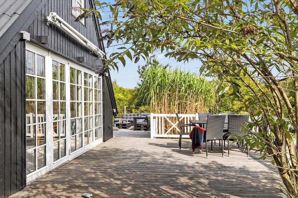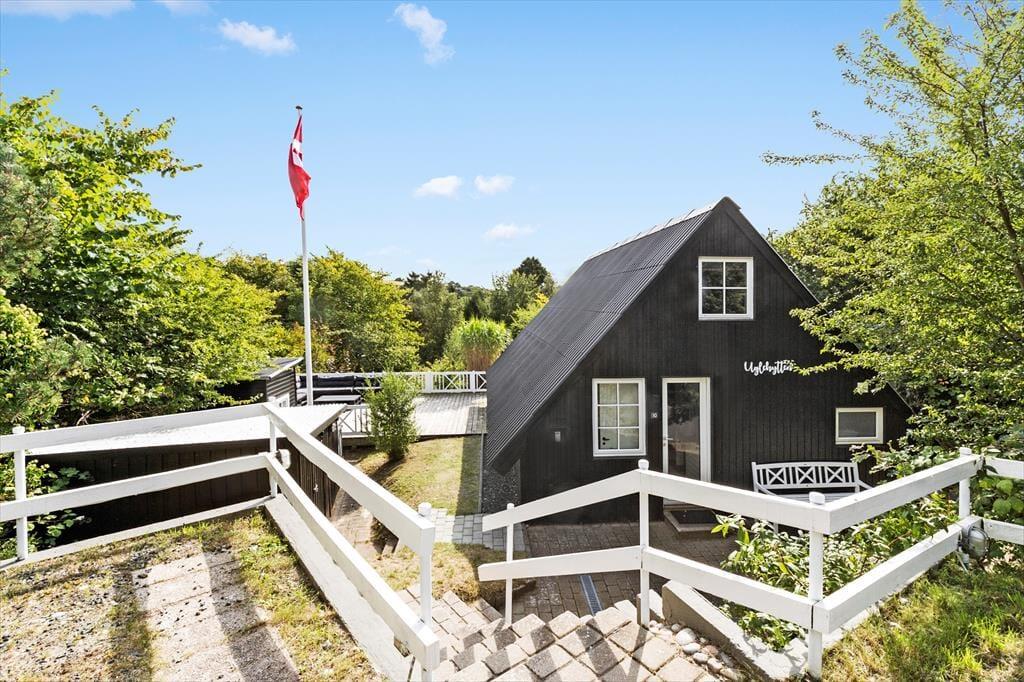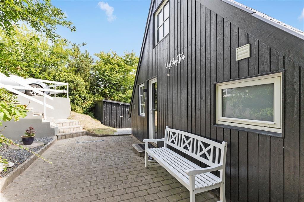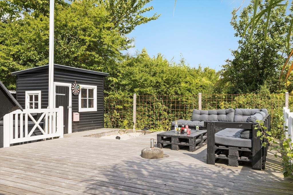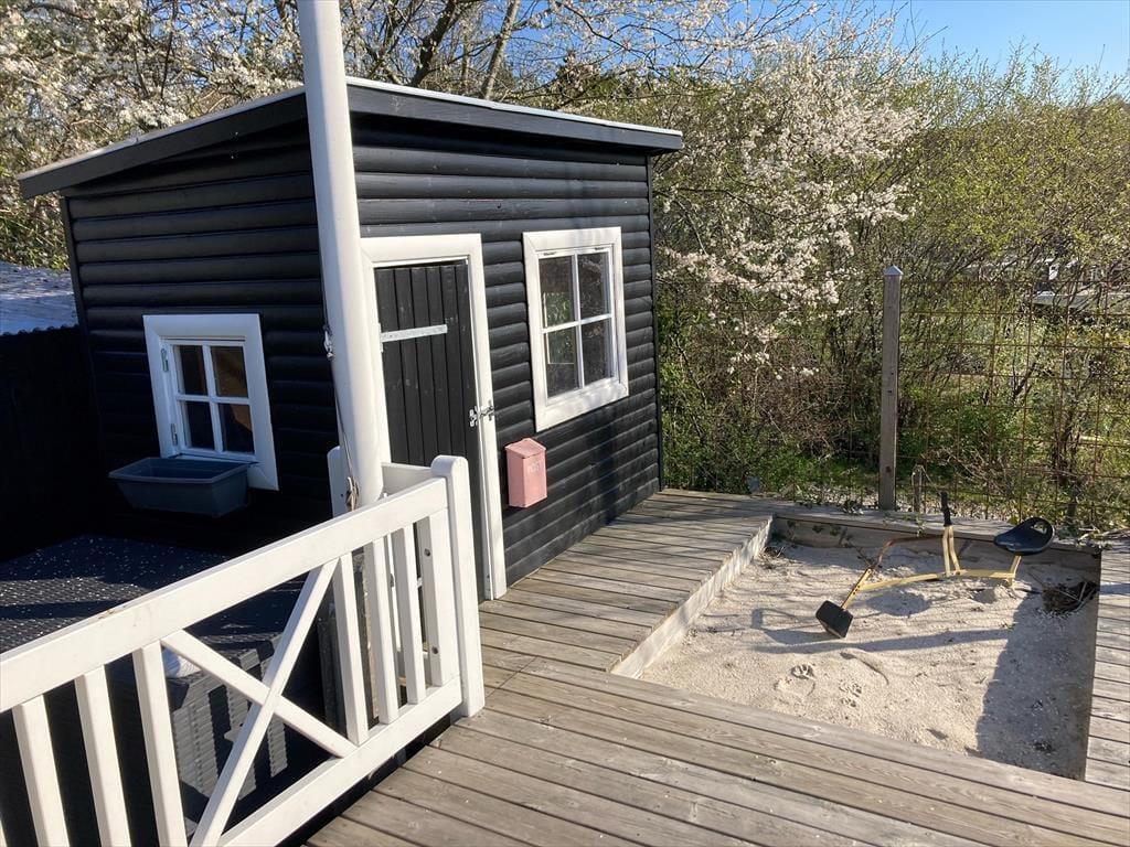 Feriehuset ligger for enden af en lukket vej og har en smuk udsigt over det bakkede landskab. Den høje beliggenhed giver en dejlig fornemmelse af ro, og samtidig er du kun 600 meter fra den børnevenlige badestrand i Ebeltoft Vig. Udenfor venter en fantastisk grund med en stor terrasse, hvor du kan nyde solen, mens børnene leger i legehuset eller sandkassen. Fra terrassen fører en trappe ned til haven, der er ”vild med vilje” – en skøn, lukket oase, hvor du kan nyde lange eftermiddage og lune aftener omkring bålet. Her er også en trampolin til børnene og en sømblok til de voksne, der vil dyste på deres hammerfærdigheder.