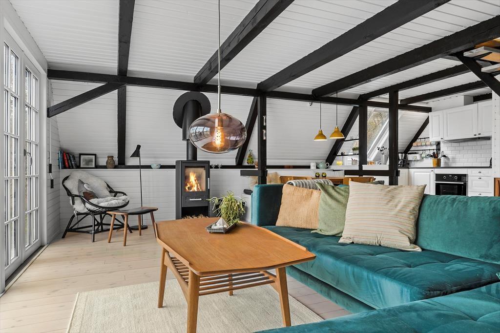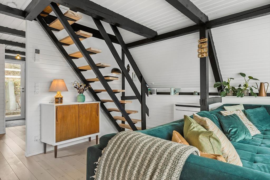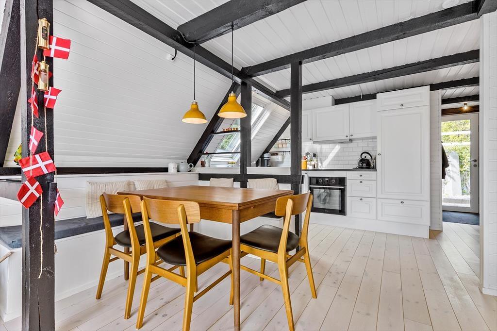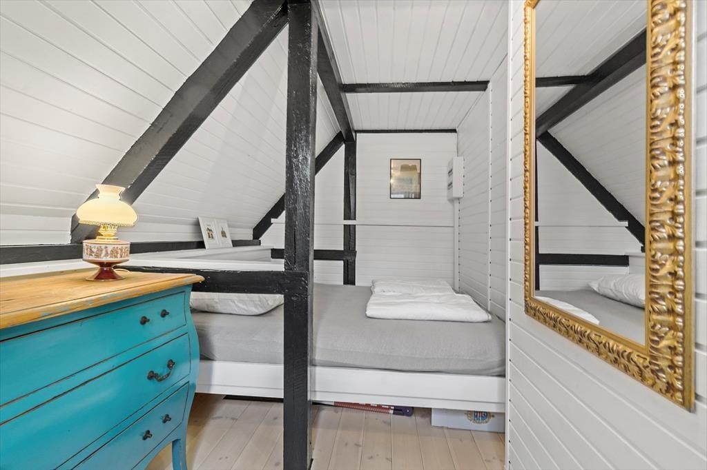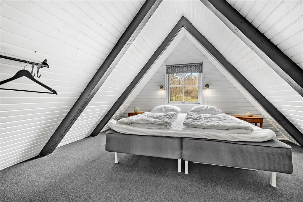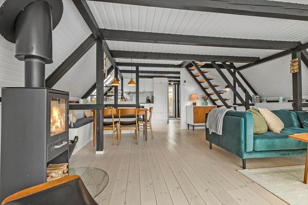 Stemningen i dette skønne feriehus er helt unik – her er der tænkt over hver eneste detalje. Huset er lyst og venligt med smukke, synlige bjælker og hanebånd, der tilføjer en charmerende atmosfære. Indretningen kombinerer hygge og stilren elegance, så du straks føler dig hjemme. Du bliver budt velkommen i en entre, der fører videre til det hyggelige køkken med halvmur til spisehjørnet. Herfra er der åbent til den skønne stue med brændeovn, stort vinduesparti og direkte udgang til den dejligste solterrasse. Stueetagen rummer også et pænt badeværelse med bruseniche og vaskemaskine samt et charmerende soveværelse med dobbeltseng. Fra stuen fører en trappe til 1. sal, hvor du finder yderligere to fine soveværelser – det ene med dobbeltseng og det andet med to enkeltsenge, der kan skubbes sammen