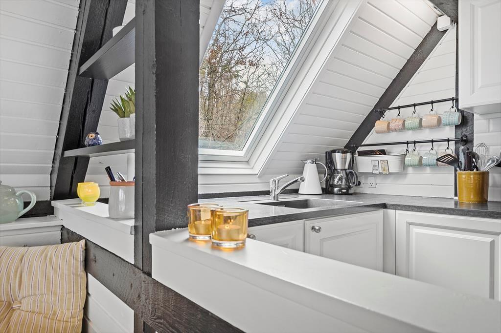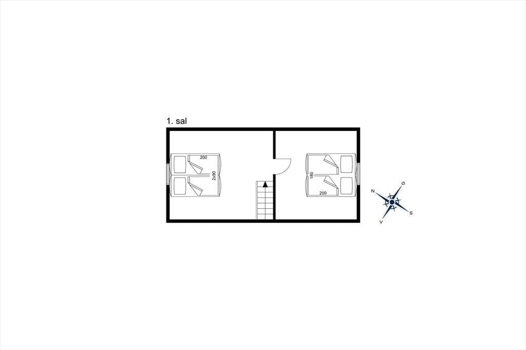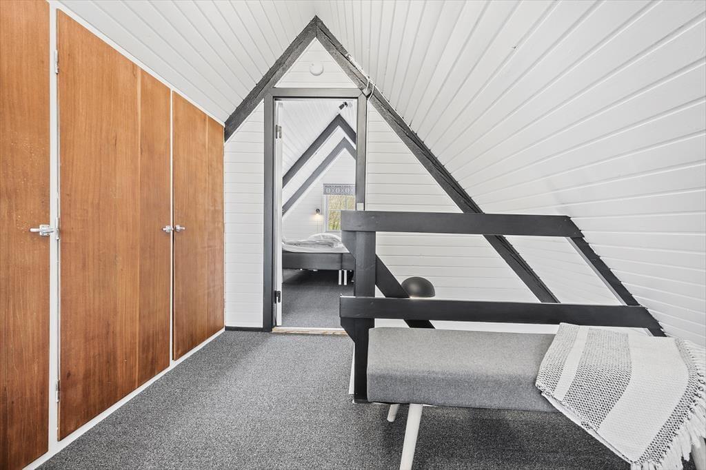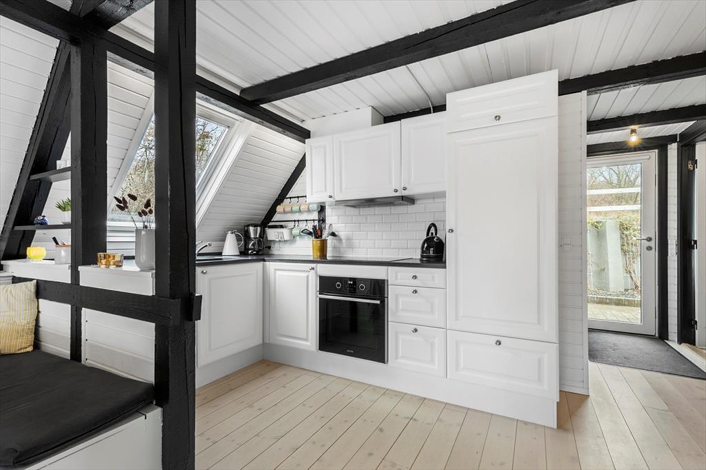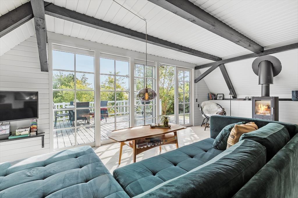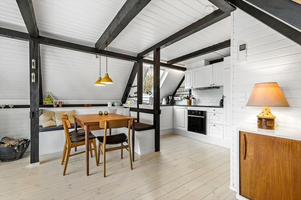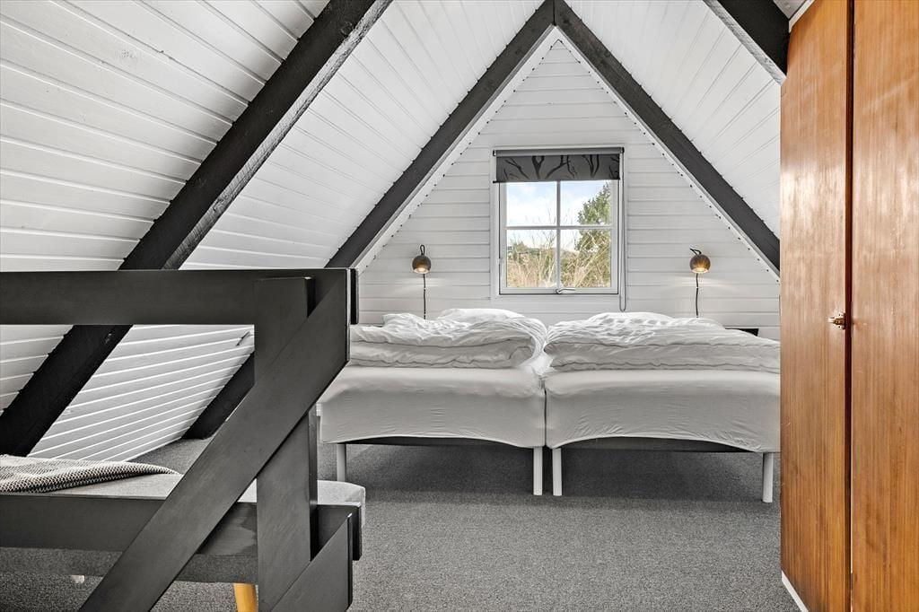 Stemningen i dette skønne feriehus er helt unik – her er der tænkt over hver eneste detalje. Huset er lyst og venligt med smukke, synlige bjælker og hanebånd, der tilføjer en charmerende atmosfære. Indretningen kombinerer hygge og stilren elegance, så du straks føler dig hjemme. Du bliver budt velkommen i en entre, der fører videre til det hyggelige køkken med halvmur til spisehjørnet. Herfra er der åbent til den skønne stue med brændeovn, stort vinduesparti og direkte udgang til den dejligste solterrasse. Stueetagen rummer også et pænt badeværelse med bruseniche og vaskemaskine samt et charmerende soveværelse med dobbeltseng. Fra stuen fører en trappe til 1. sal, hvor du finder yderligere to fine soveværelser – det ene med dobbeltseng og det andet med to enkeltsenge, der kan skubbes sammen
