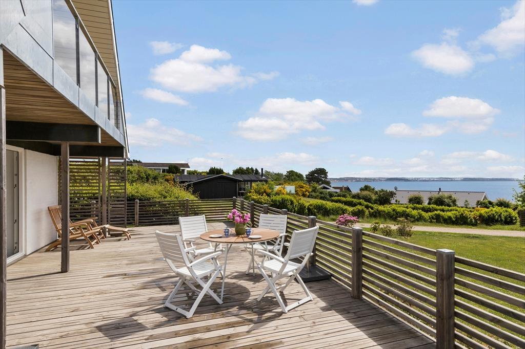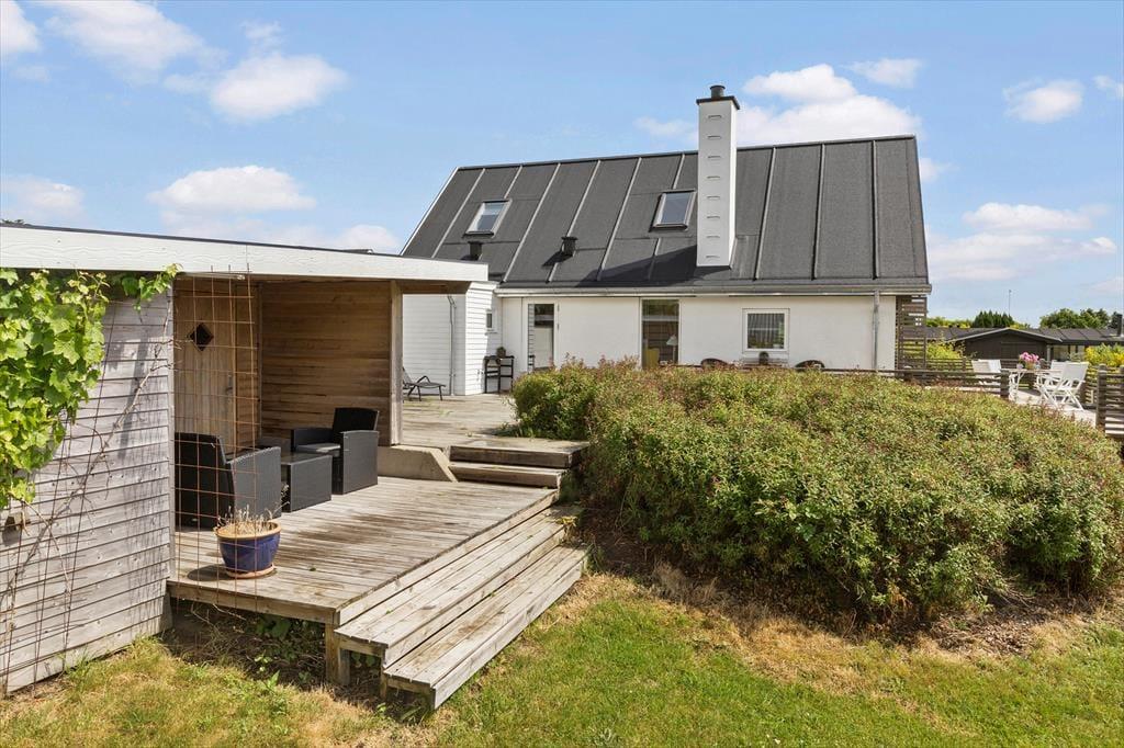 Huset er beliggende på en skrånende grund med en stor græsplæne, der giver masser af plads til leg og aktiviteter for både store og små. Omkring huset strækker sig et imponerende terrasseareal på cirka 130 m² med gode havemøbler og en grill, der indbyder til hyggelige måltider under åben himmel. Her kan du slappe af i både morgen- og aftensolen, alt imens du nyder den smukkeste udsigt over Ebeltoft Vig. Fra grunden er der adgang til et stisystem, der fører dig til en dejlig sandstrand – blot 250 meter væk, eller cirka 10 minutters gang.