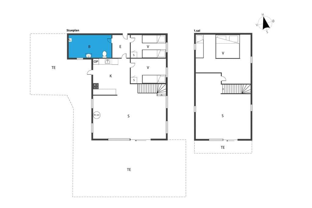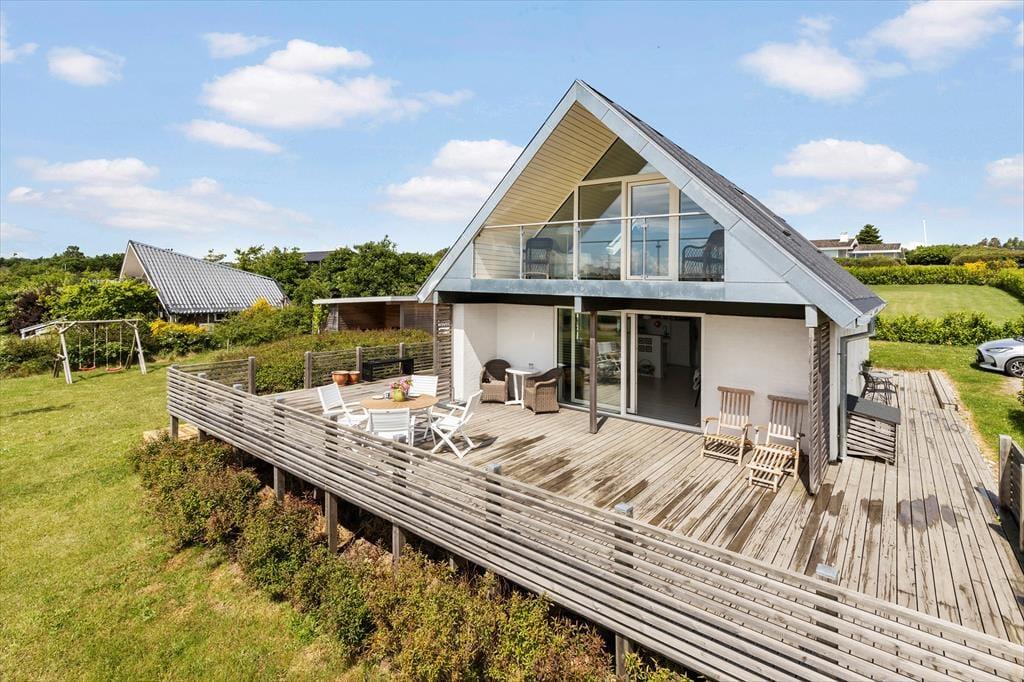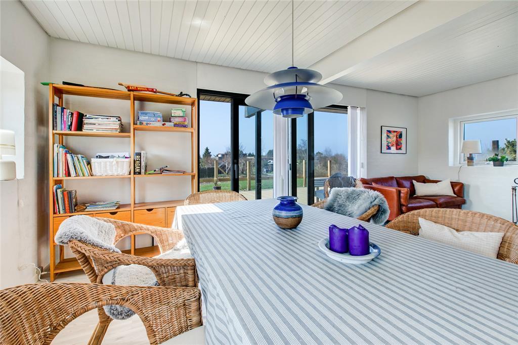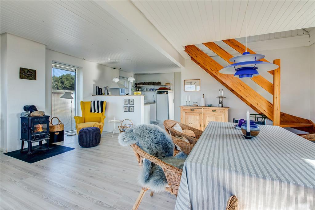 På 1. salen finder du den hyggelige opholdsstue med adgang til en svalegang, hvorfra du kan lade dig betage af udsigten over Ebeltoft Vig. 1. salen er renoveret i 2025 med nyt vinduesparti, som gør udsigten endnu mere fantastisk. Her ligger også husets tredje soveværelse, som er udstyret med en dobbeltseng og en enkeltseng. For de små feriegæster er der både barnestol og barneseng, og hele familien kan holde sig opdateret med husets internet.