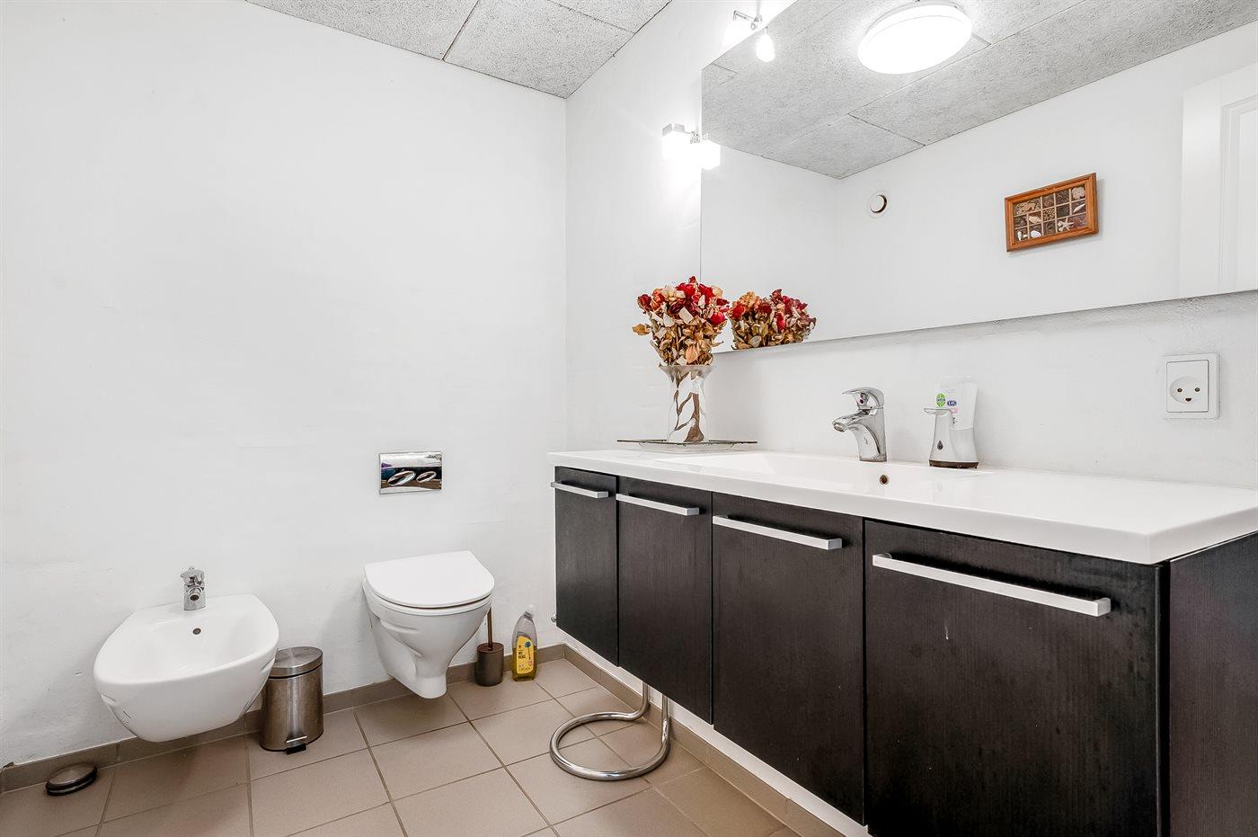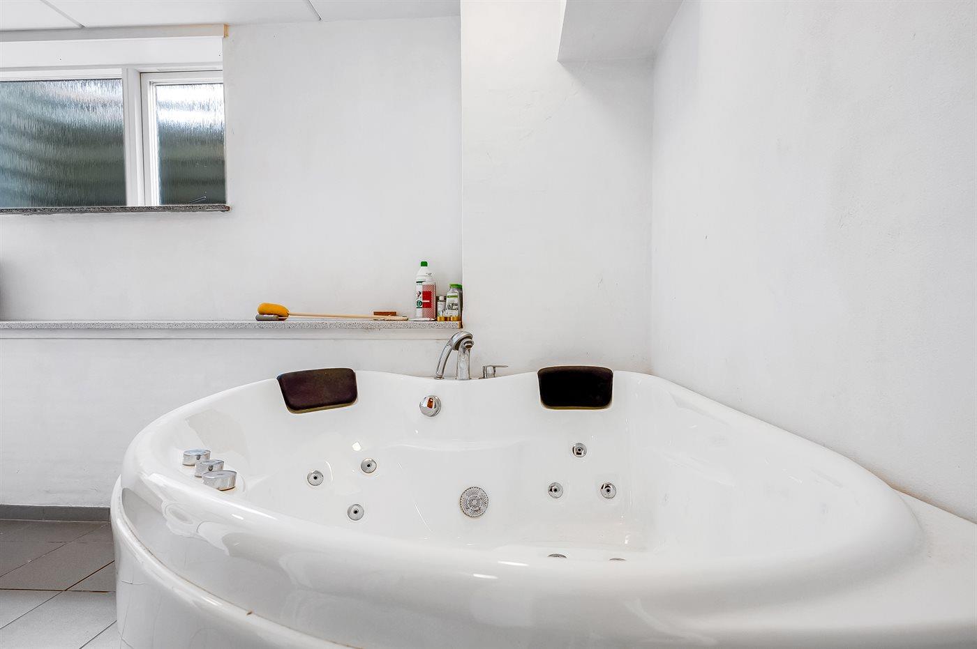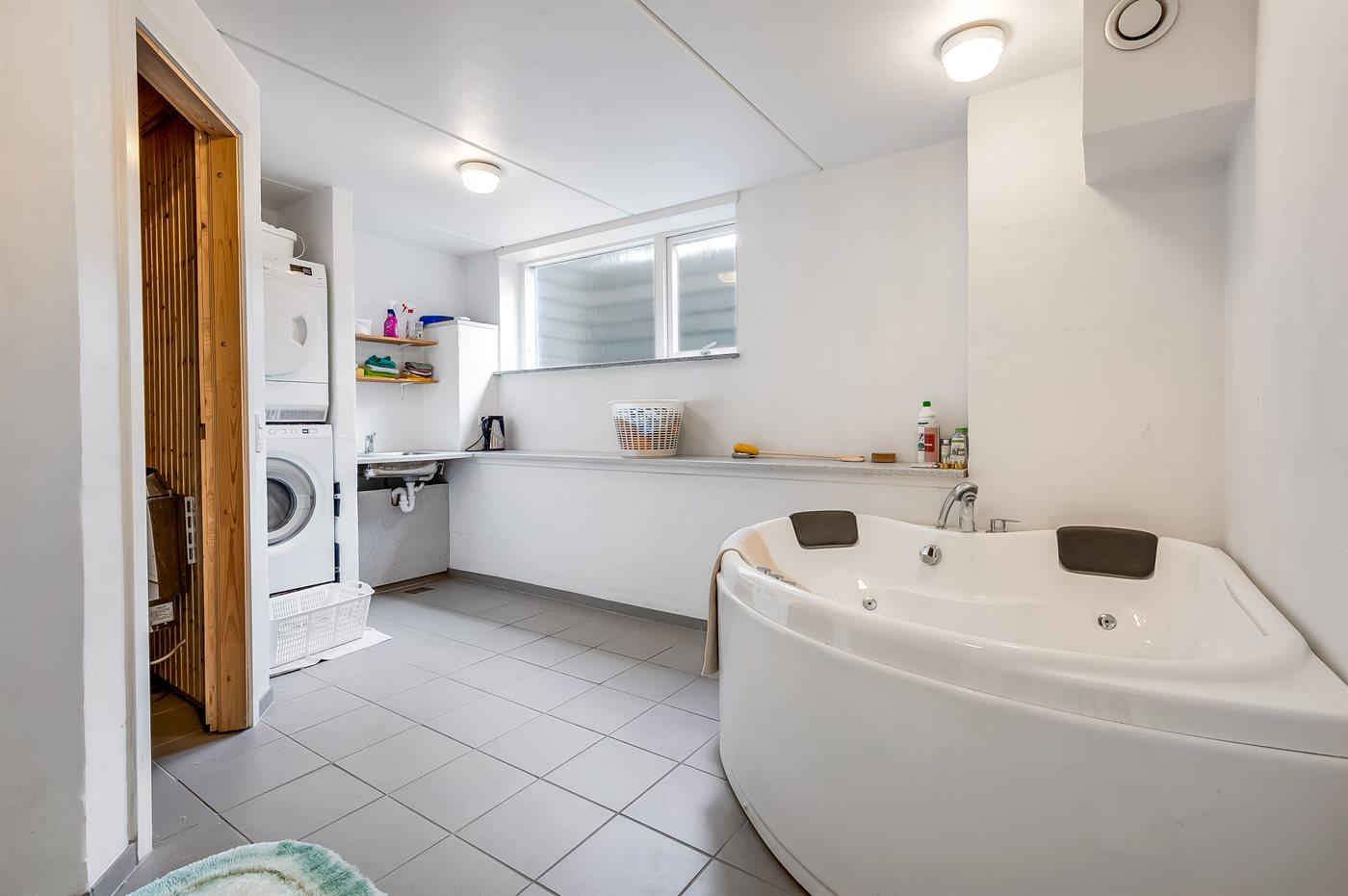 Der er 2 badeværelser med bruseniche og 2 toiletter. Der er gulvvarme på 2 badeværelser. I saunaen er der mulighed for afslapning.