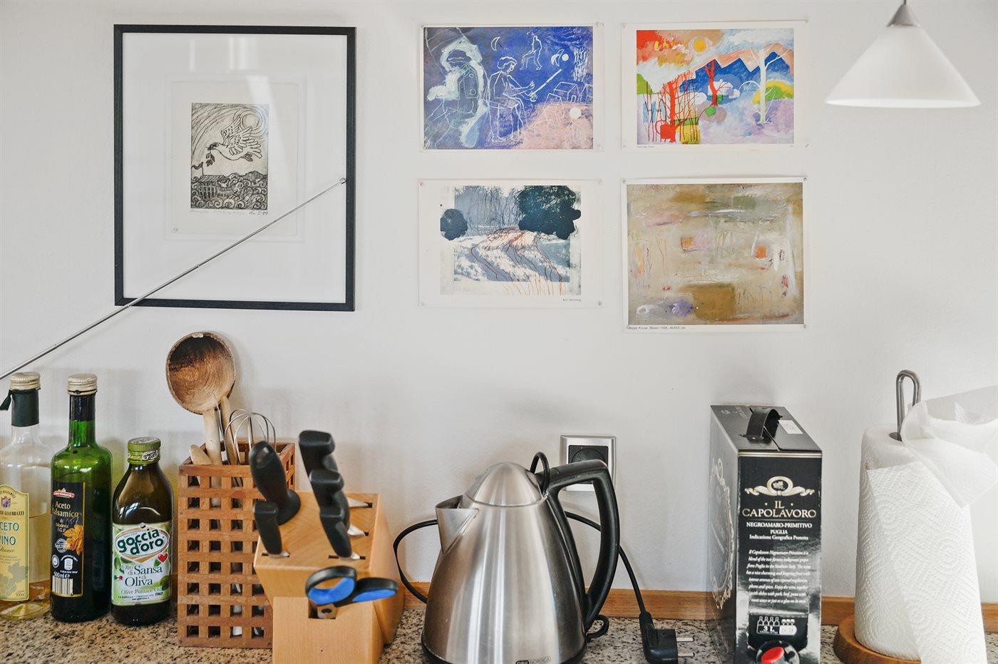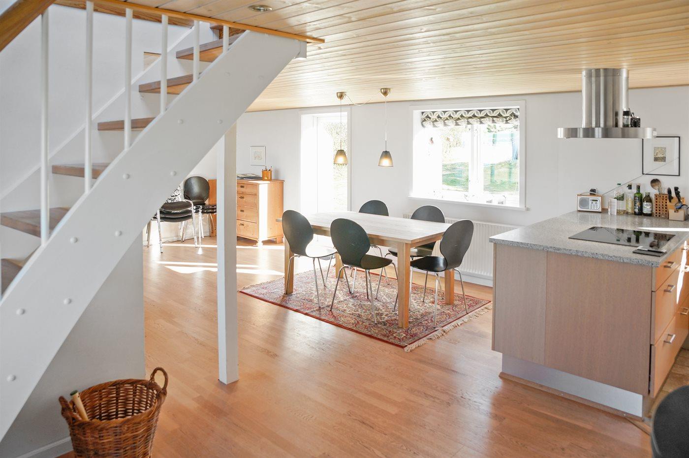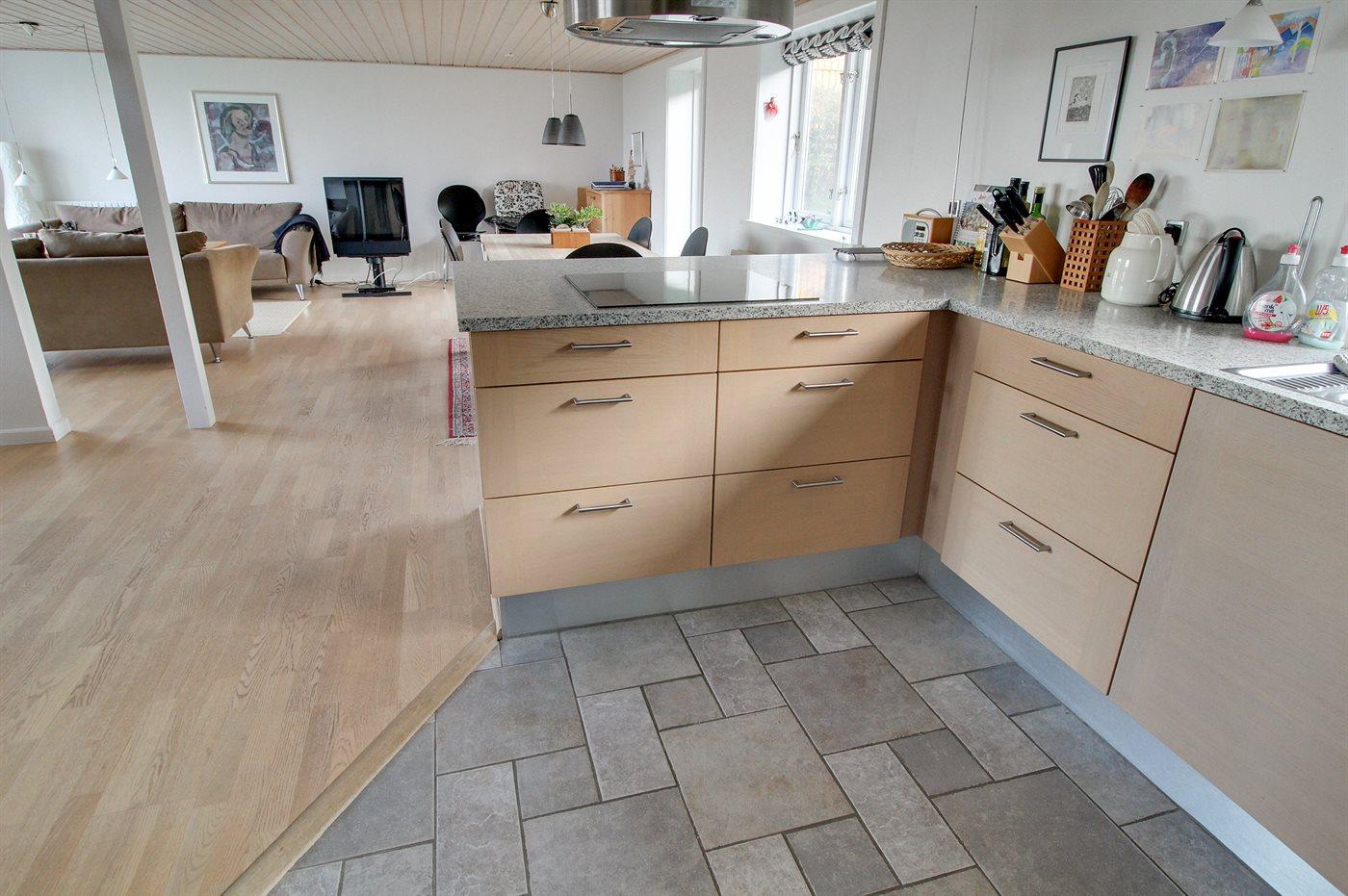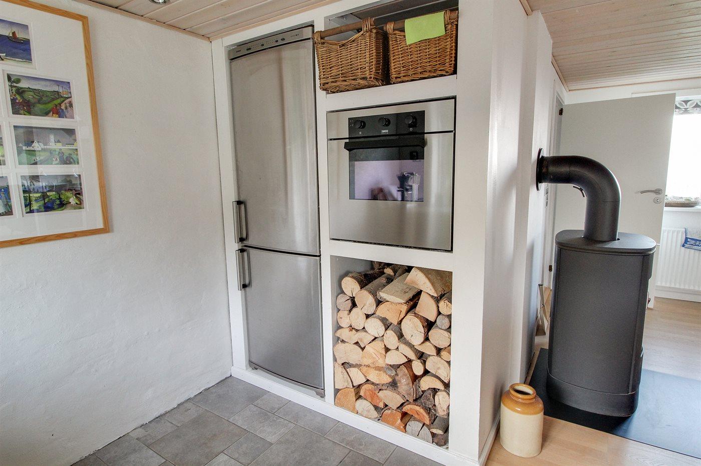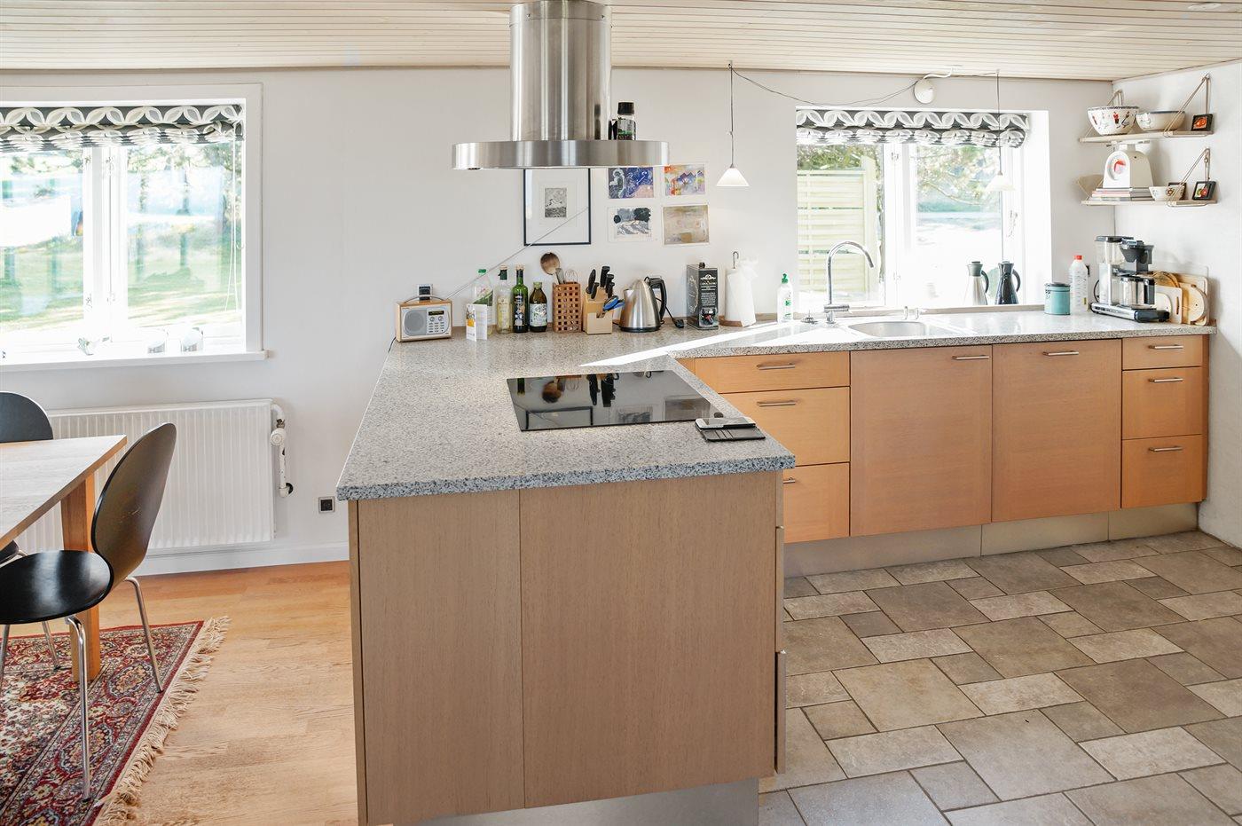 Køkkenet er udstyret med 1 køleskab. Der er 4 induktionskogeplader, varmluftovn samt opvaskemaskine.