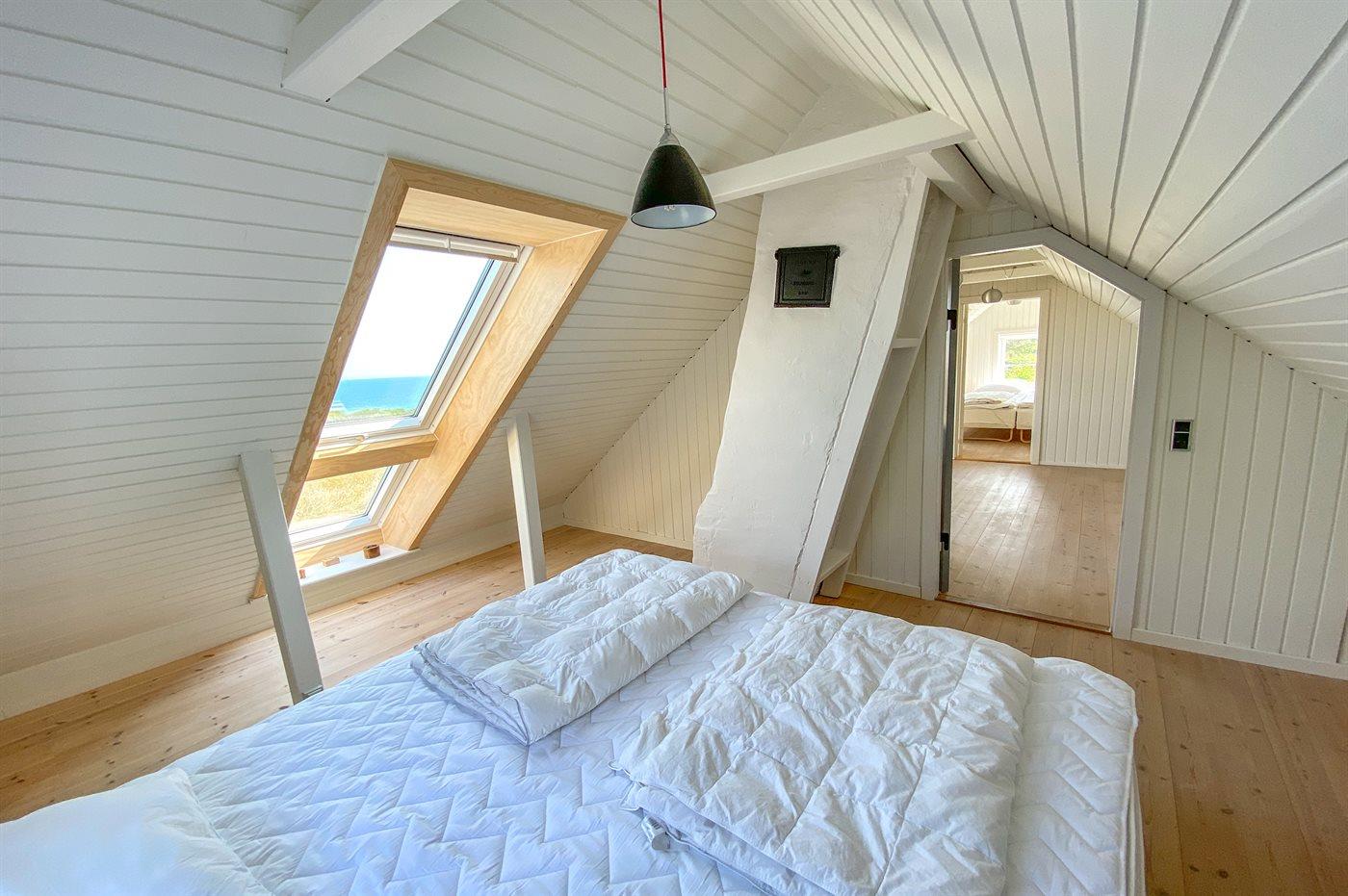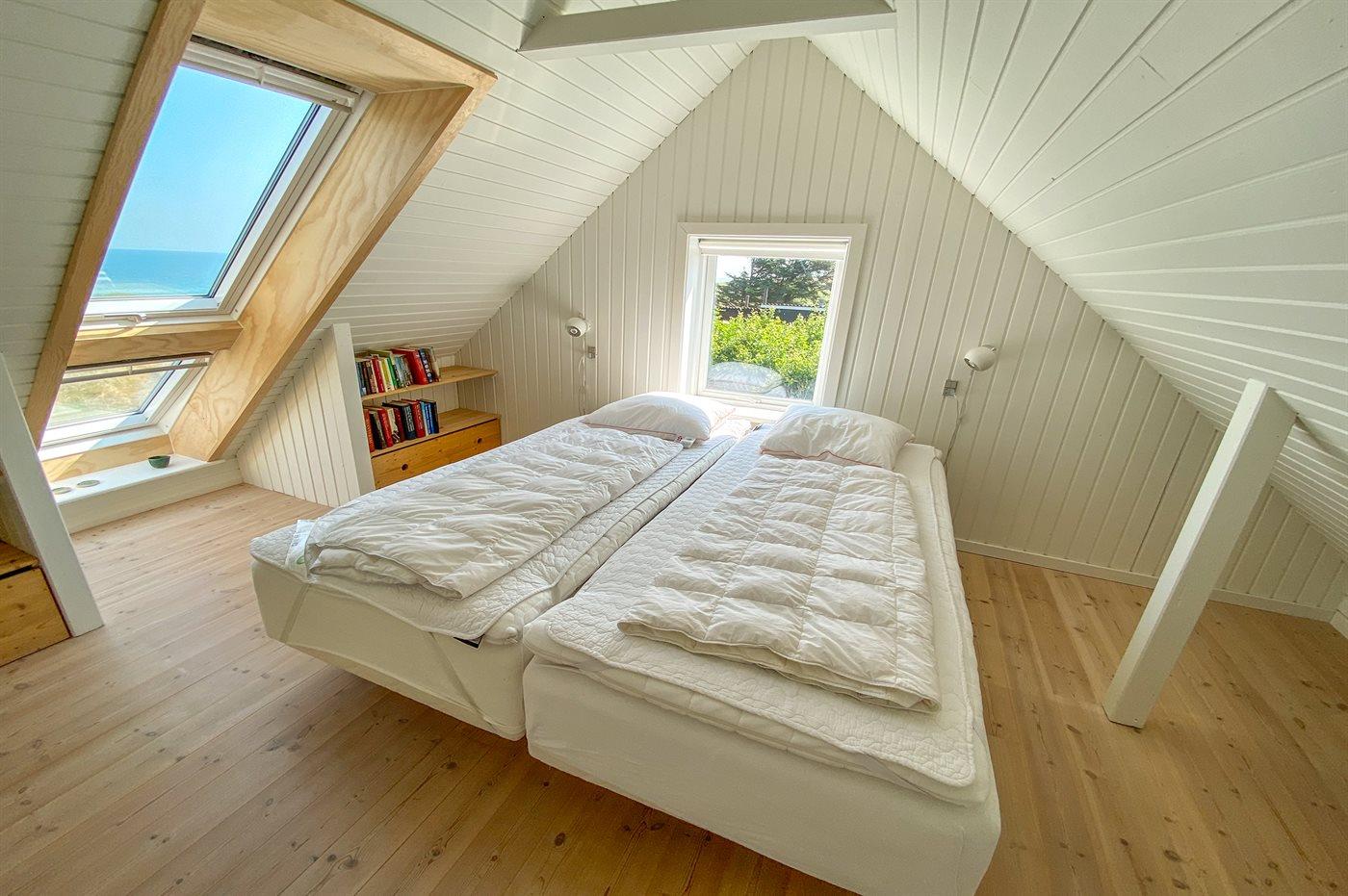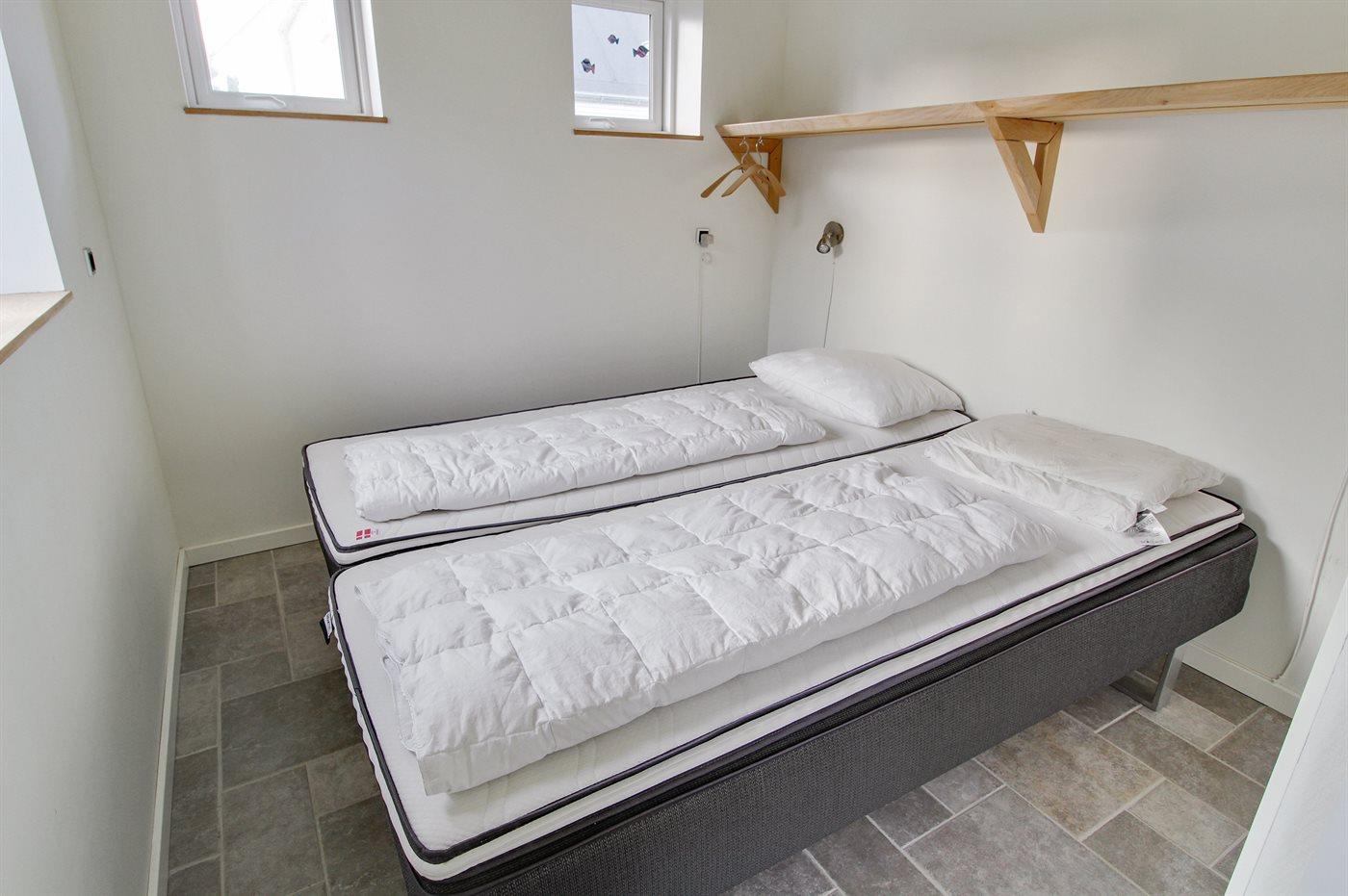 Der er i alt 3 soveværelser. Sovepladserne fordeler sig på: 6 sovepladser i dobbeltsenge. 2 sovepladser på madrasser. 2 sovepladser i alkove. 2 af disse sovepladser befinder sig i opholdsstuen og 2 af dem befinder sig på hemsen.