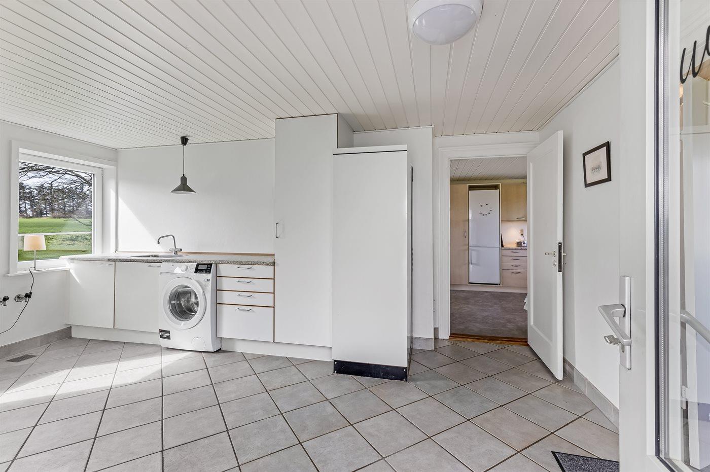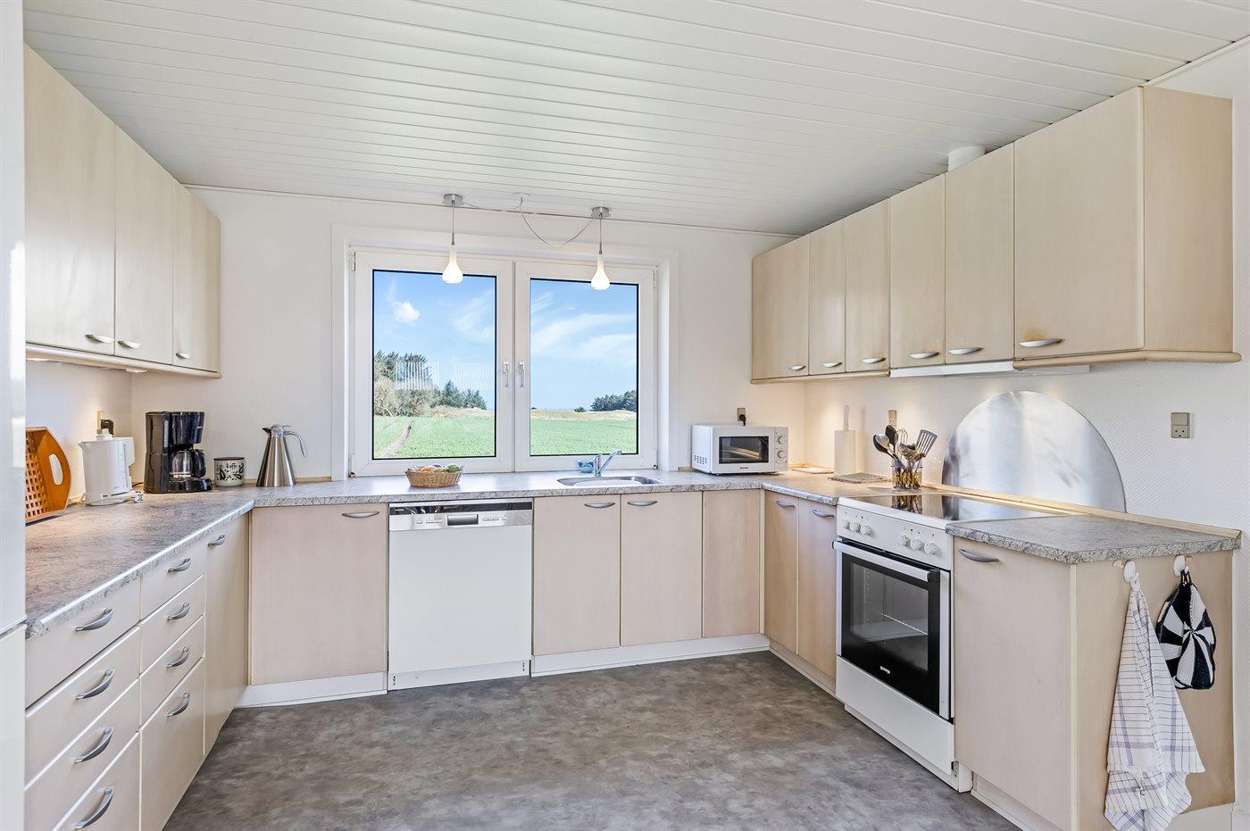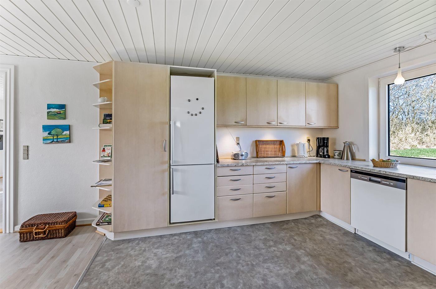 Køkkenet er udstyret med 1 køleskab. Der er 4 keramiske kogeplader, varmluftovn, mikrobølgeovn samt opvaskemaskine.
