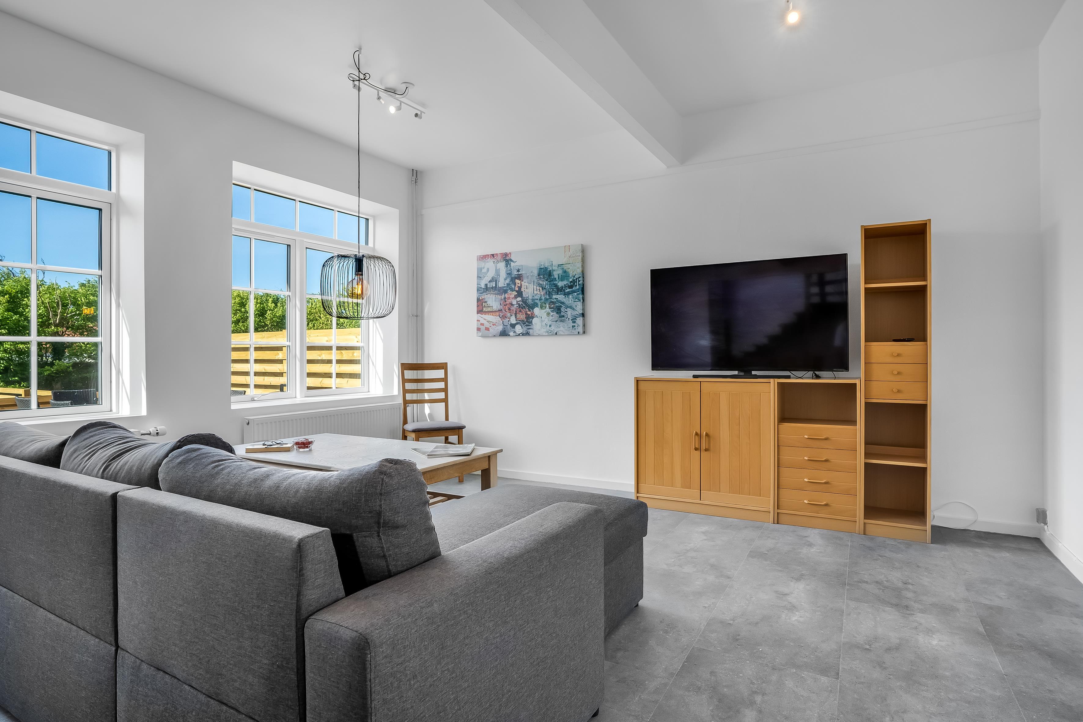 Indenfor finder du et lyst og luftigt opholdsområde, der er perfekt til at samles med familie og venner. Stuen er udstyret med et fjernsyn, der tilbyder dansk TV og Chromecast, så du kan nyde dine yndlingsprogrammer og film. Det trådløse internet gør det nemt at holde kontakten med verden, hvis du ønsker det.