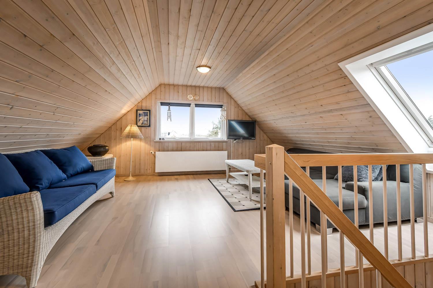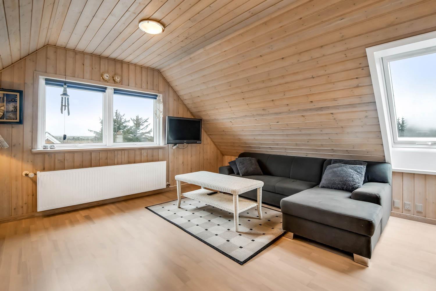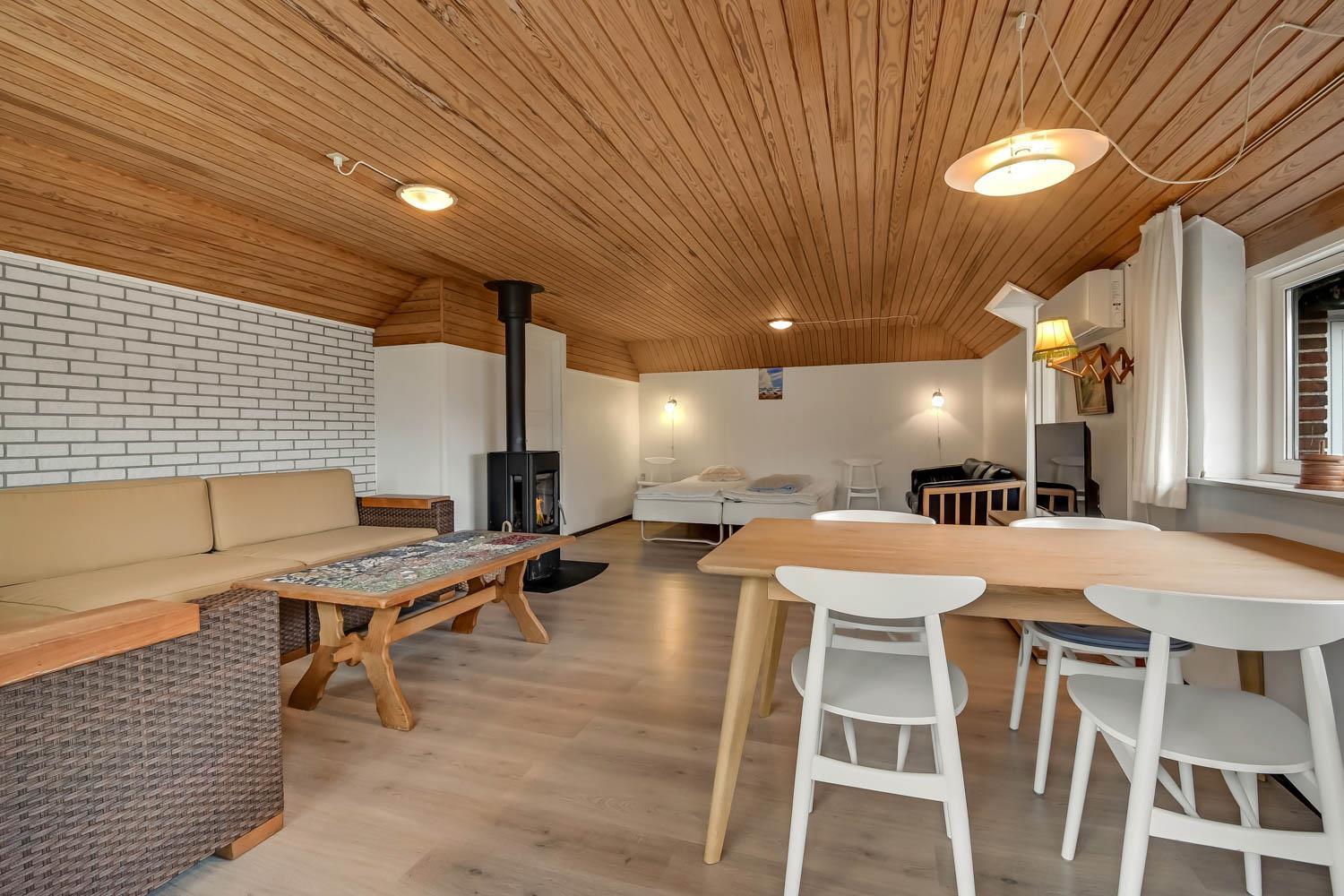 Overetagen består også af en mindre stue med udsigt over naturgrunden. Her er sofagruppe, sofabord og fladskærm med danske og tyske kanaler. Heroppe er der også et soveværelse med dobbeltseng plus et par ekstra løse madrasser. Hus nummer 2 har et køkken med mikroovn, ovn og køleskab med fryseboks på 20 liter. Her er ligeledes komfur og emhætte samt et hyggebord hvor 2 med plads til 2 personer. Fra køkkenet kan man gå ind i stuen og her er både brændeovn, fladskærm med dansk tv samt sofagruppe med bord samt en mindre sofa med plads til 3 personer. Der er også et spisebord til 4 personer og 2 sengepladser. Fra stuen kan man gå ud i en lækker havestue hvor der kommer masser af lys ind. Her er sofaer og og borde til 5 personer. Hus 2 har endvidere et rum med dobbeltseng, som man kommer ind fra via stuen. Går man et rum videre kommer man til et værelse med køjesenge. Da man er nødt til at passere dobbeltsengsværelset for at komme ind til køjesengsværelset anbefaler vi dette hus 2 til familien med mindre børn. Der findes naturligvis også et badeværelse med toilet, bruser og vask. Der er også installeret varmepumpe