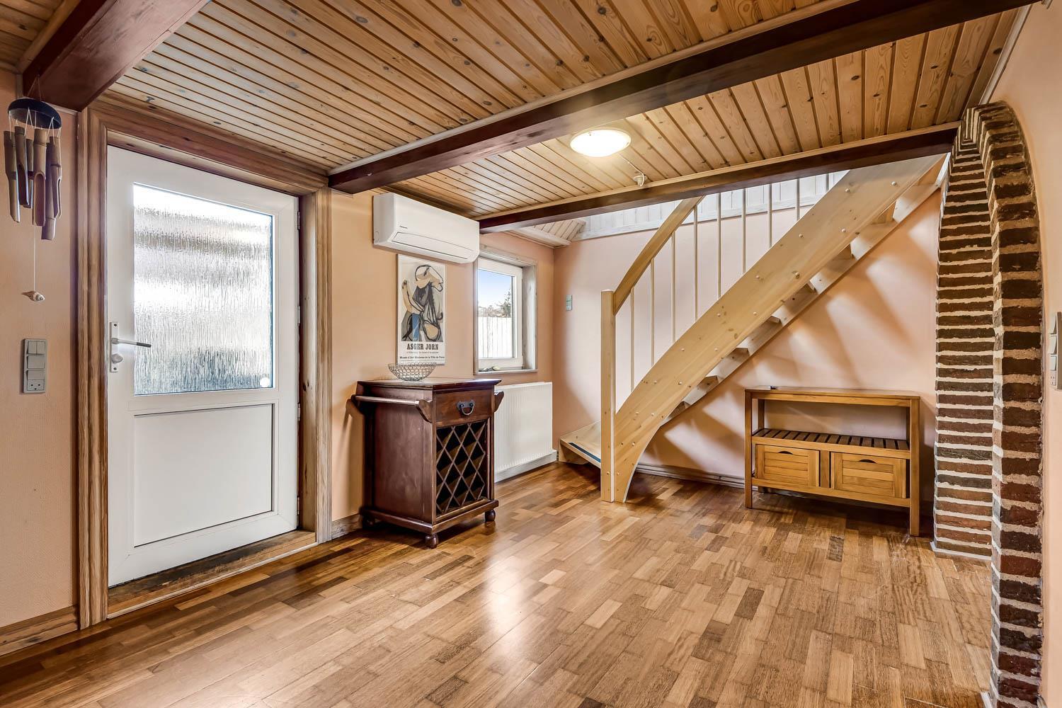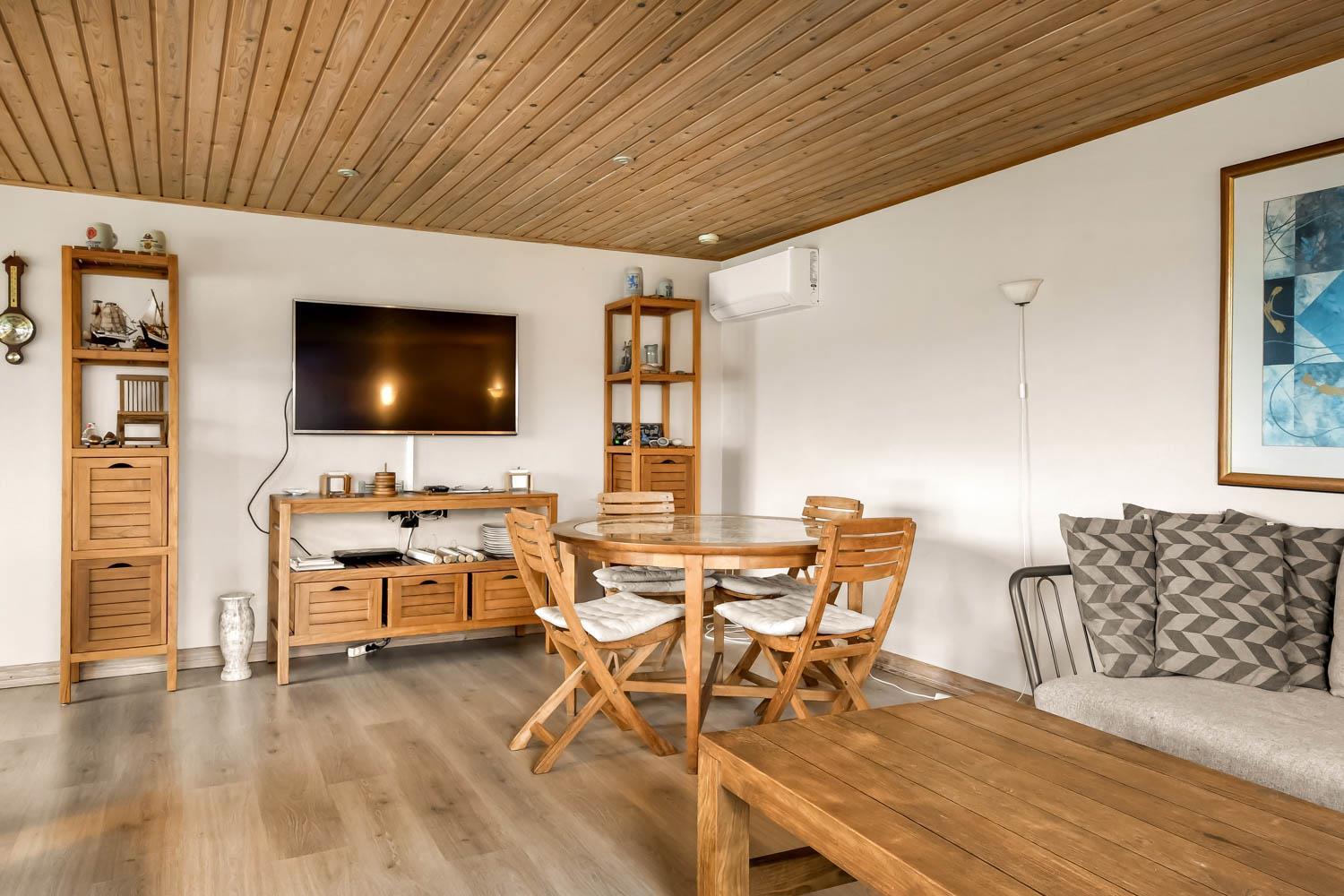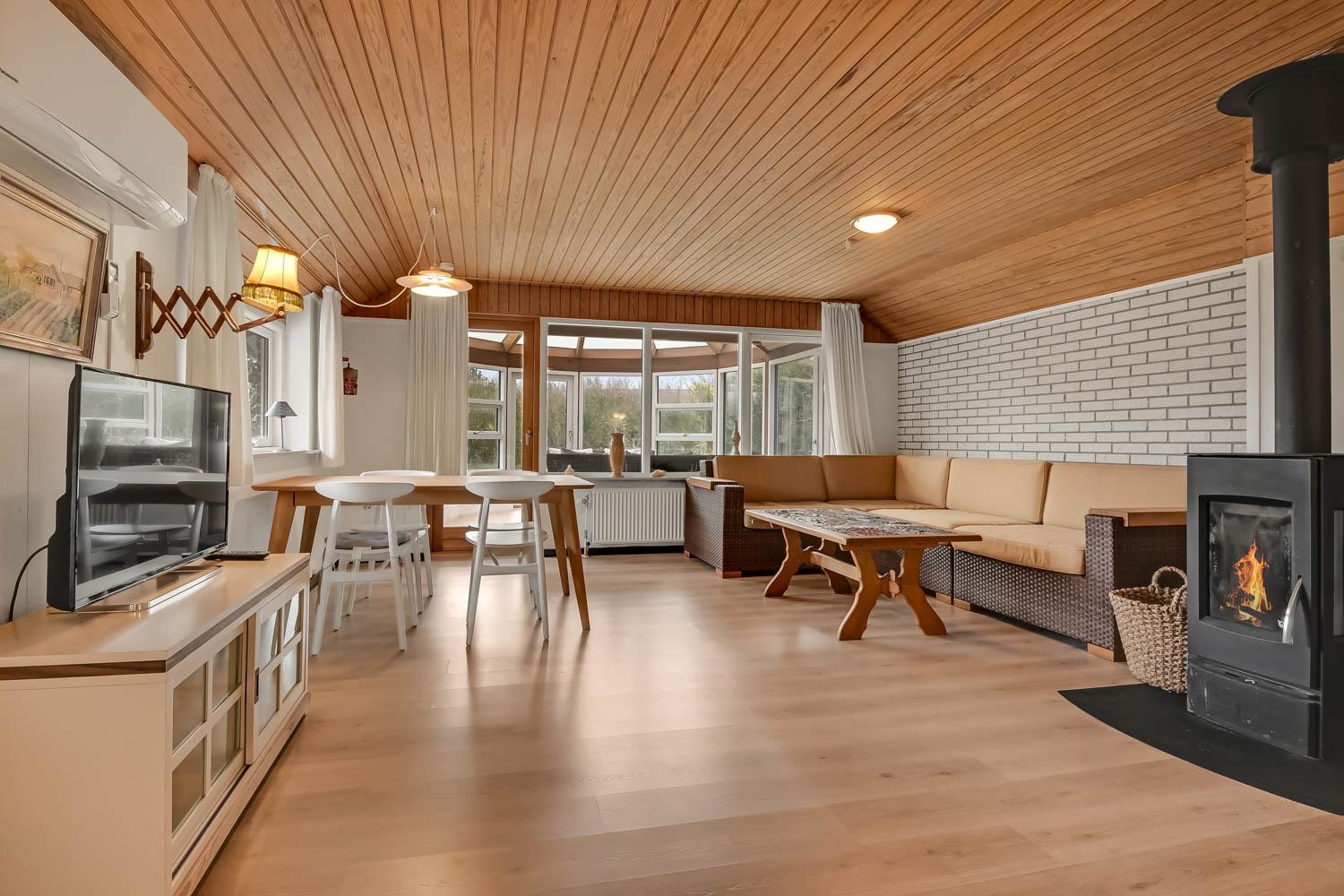 Overetagen består også af en mindre stue med udsigt over naturgrunden. Her er sofagruppe, sofabord og fladskærm med danske og tyske kanaler. Heroppe er der også et soveværelse med dobbeltseng plus et par ekstra løse madrasser. Hus nummer 2 har et køkken med mikroovn, ovn og køleskab med fryseboks på 20 liter. Her er ligeledes komfur og emhætte samt et hyggebord hvor 2 med plads til 2 personer. Fra køkkenet kan man gå ind i stuen og her er både brændeovn, fladskærm med dansk tv samt sofagruppe med bord samt en mindre sofa med plads til 3 personer. Der er også et spisebord til 4 personer og 2 sengepladser. Fra stuen kan man gå ud i en lækker havestue hvor der kommer masser af lys ind. Her er sofaer og og borde til 5 personer. Hus 2 har endvidere et rum med dobbeltseng, som man kommer ind fra via stuen. Går man et rum videre kommer man til et værelse med køjesenge. Da man er nødt til at passere dobbeltsengsværelset for at komme ind til køjesengsværelset anbefaler vi dette hus 2 til familien med mindre børn. Der findes naturligvis også et badeværelse med toilet, bruser og vask. Der er også installeret varmepumpe