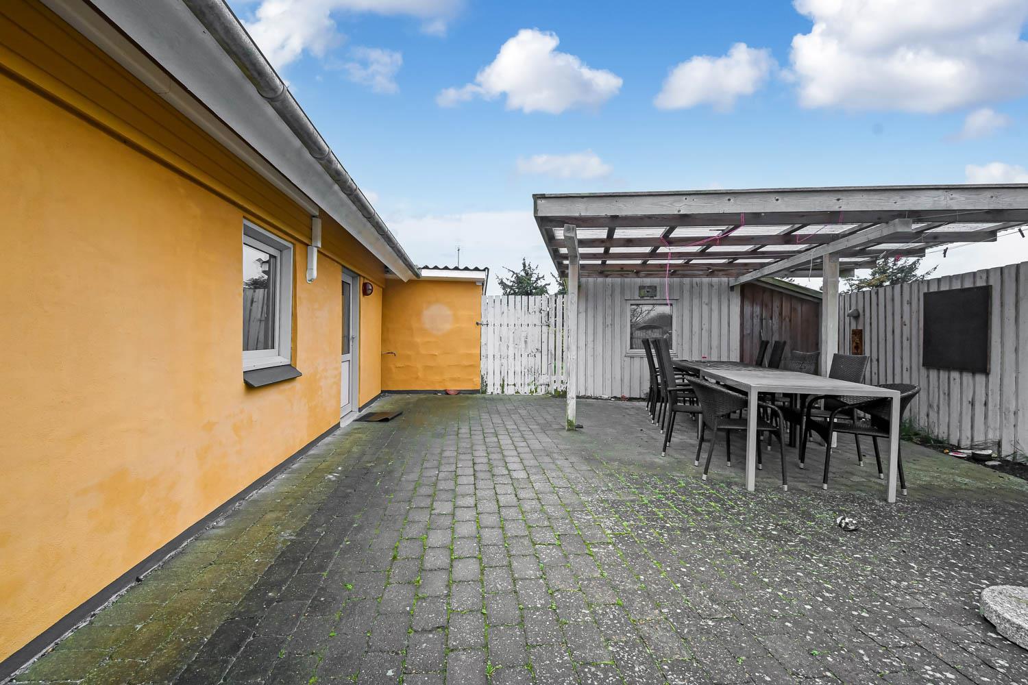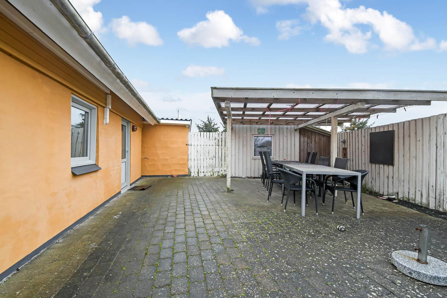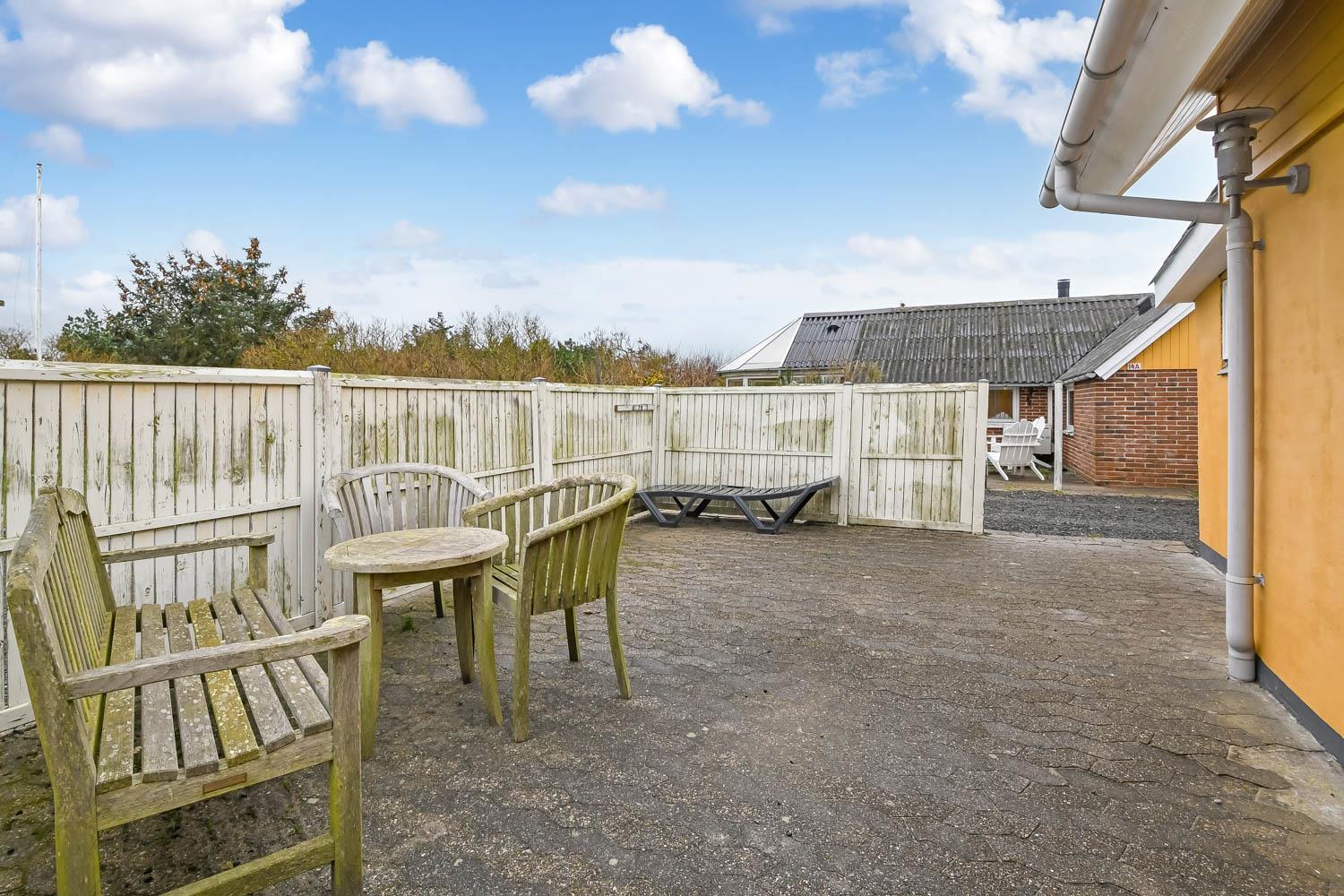På nordsiden af det ene hus bør den indhegnede gårdhave fremhæves. Her er næsten altid læ og halvtaget gør at man altid kan sidde komfortabelt her og her kan mange sommeraftener nydes, mens man griller maden. Til huset hører naturligvis parasol, havemøbler, 4 solvogne og grill.