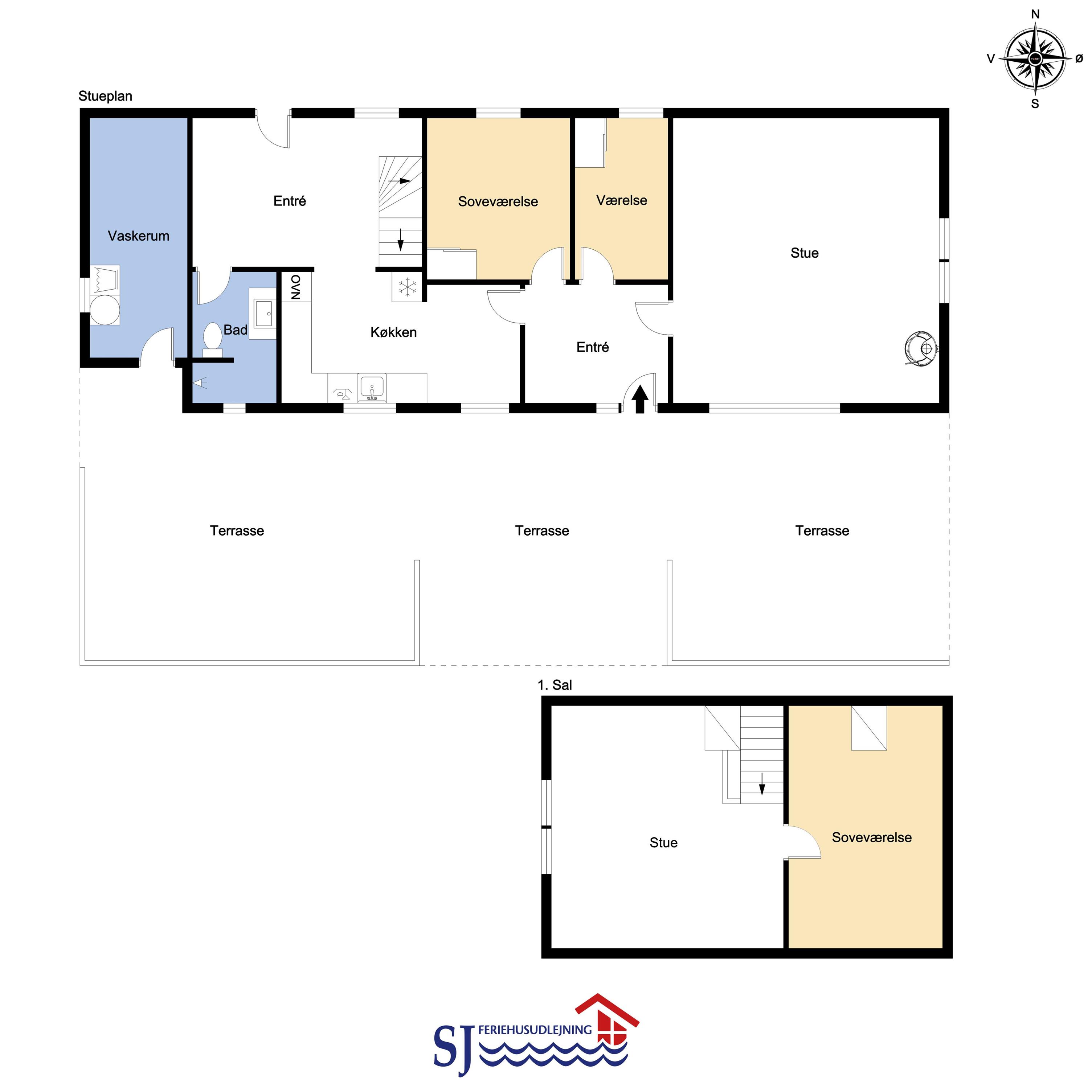 Det første hus har faktisk 2 stuer. Stuen nedenunder kan betegnes som spisestuen og herfra har man en god udsigt over haven, så man kan holde øje med børnene. Her er der 2 spiseborde til henholdsvis 6 og 4 personer, brændeovn, sofagruppe med sofabord samt fladskærm med både dansk og tysk TV. Internet. Køkkenet har opvaskemaskine, ovn, mikrobølgeovn, køle-fryseskab samt komfur og emhætte. Hertil er der også et køkkenbord hvor man kan sidde at hyggesnakke. I stueetagen er der endvidere et badeværelse med gulvvarme som indeholder en bruser, håndvask og toilet. Sovepladserne fordeler sig på 2 køjesenge og en dobbeltseng.