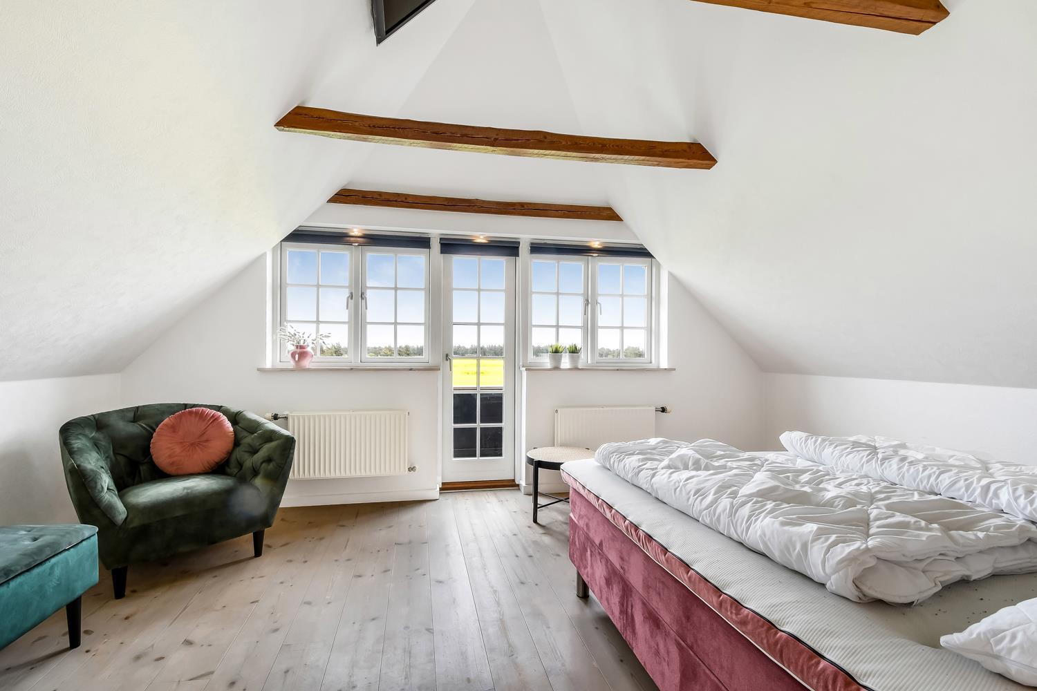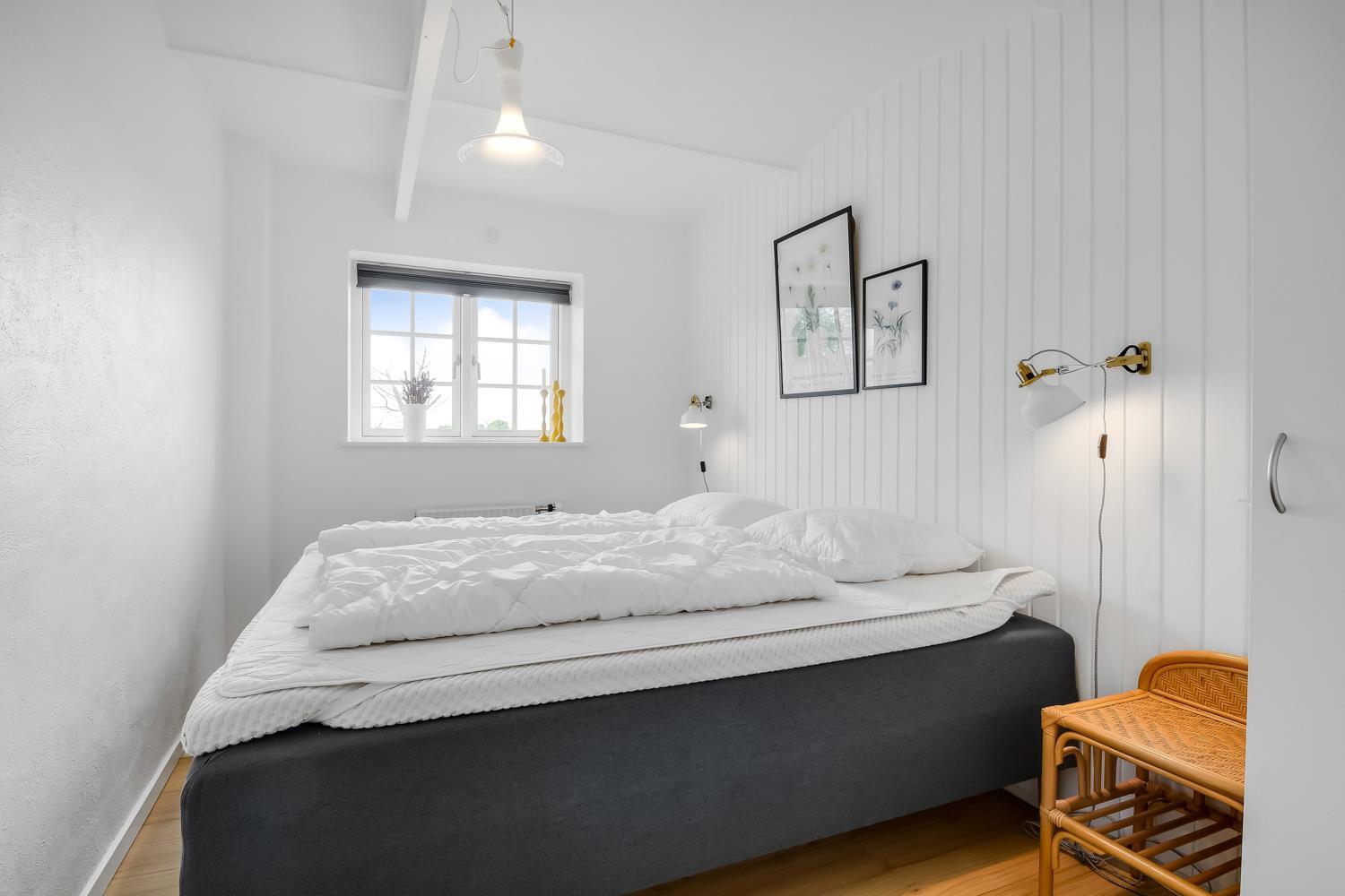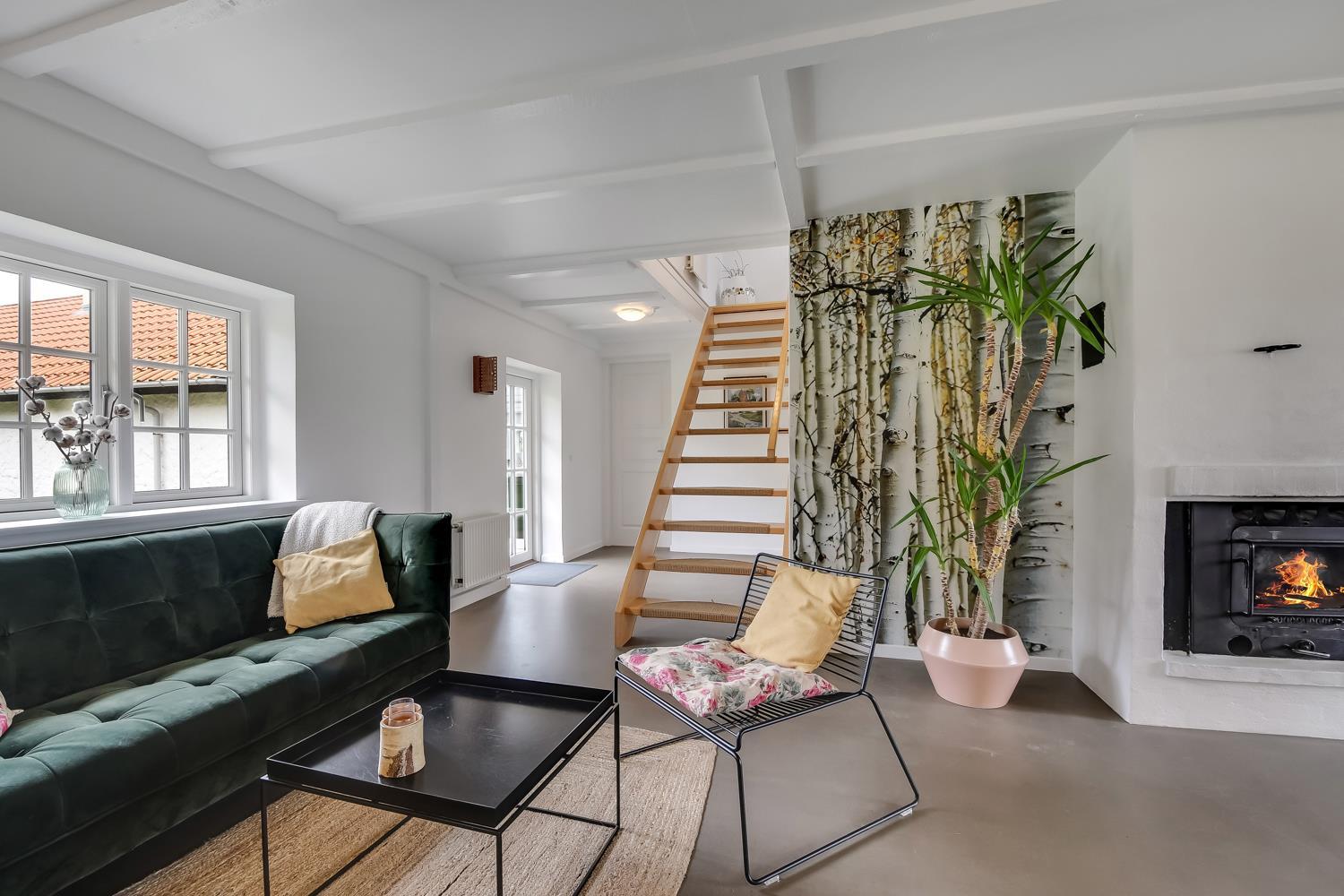Via trappen ved køkkenet kommer I op på 1. etage. Her er der en åben repos med dobbelt sovesofa (1DS). Dejlig opholdsstue med en fantastisk udsigt over landskabet og fjordkig. Opholdsstuen er indrettet med dejlige møbler, Smart-TV med danske og tyske programmer samt mulighed for streaming af TV / Radio / Apps via Chromecast. Badeværelse med toilet, håndvask og bruser. Stor soveværelse med (1DS) og TV i loftet med danske og tyske kanaler samt udgang til en pragtfuld altan med vandkig og udsigt til landskabet.