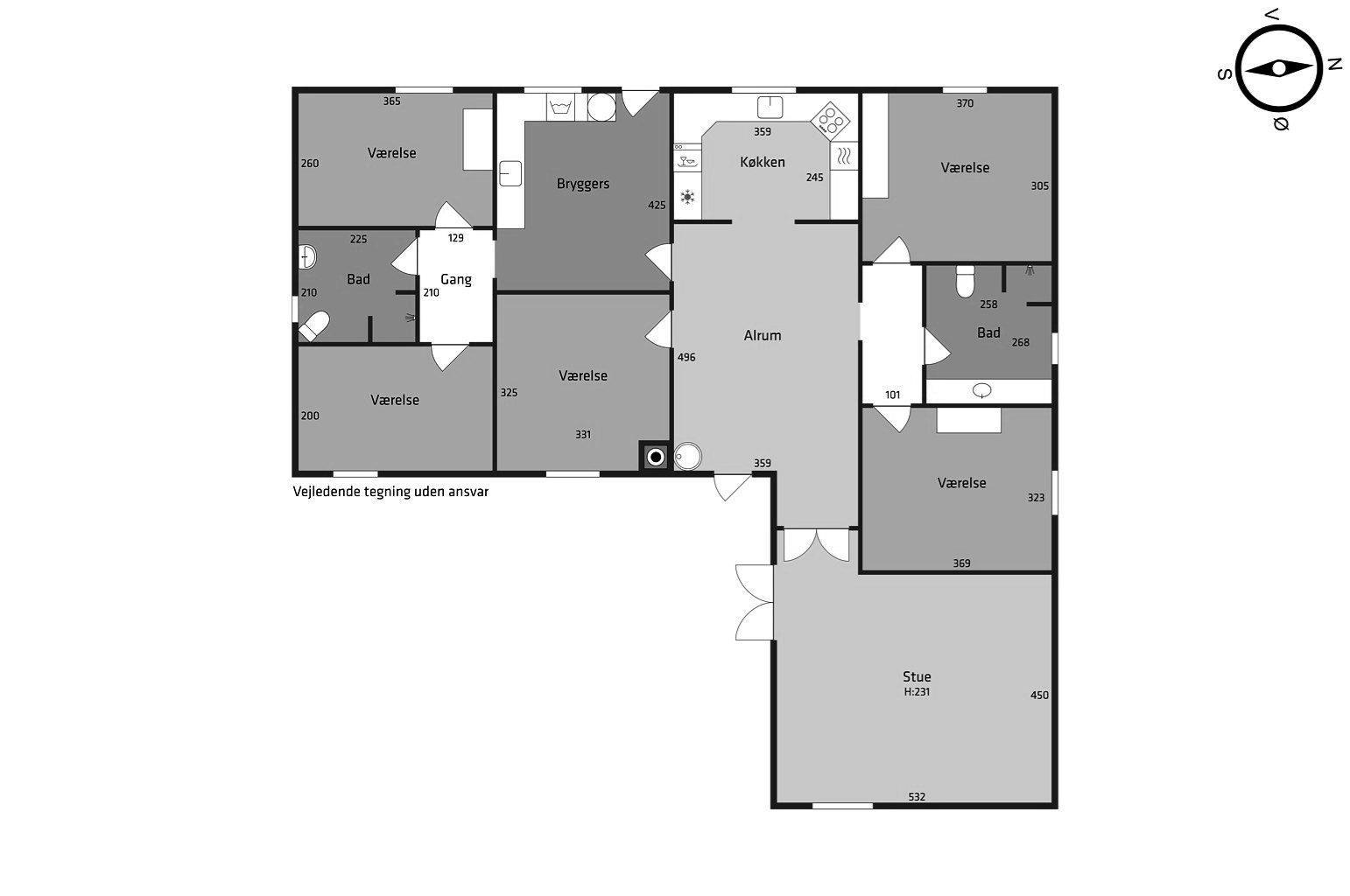 Huset er velegnet til 2 familier. I huset er der indgang via stort bryggers, køkken/alrum, 2 toiletter med bad og 5 soverum. Der er ugenert lukket have og god terrasse.