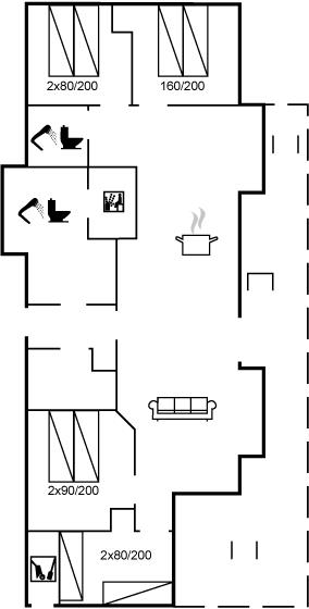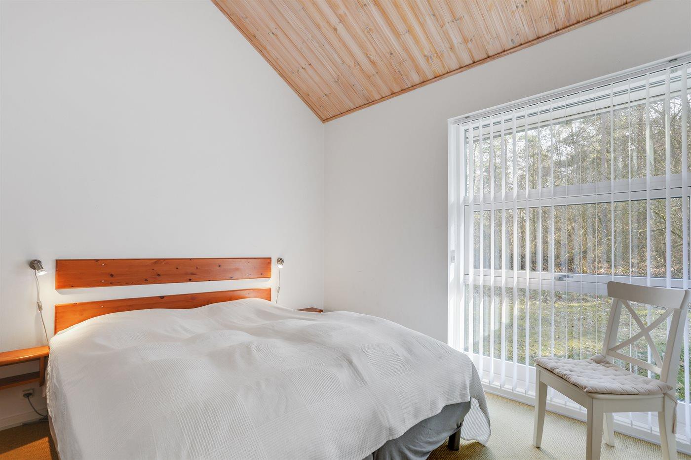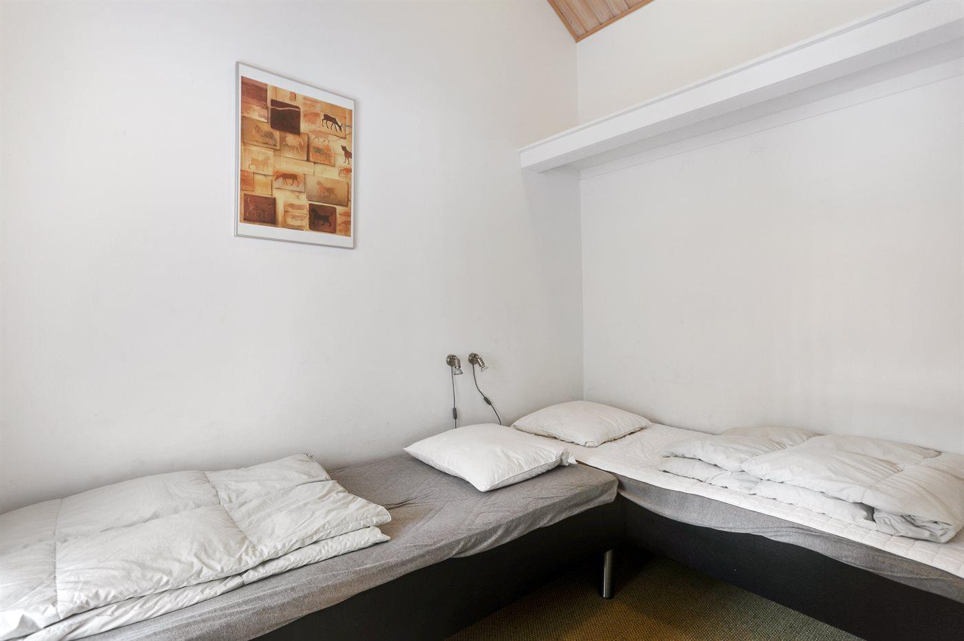 Der er i alt 4 soveværelser. Sovepladserne fordeler sig på: 6 sovepladser i dobbeltsenge. 2 sovepladser i enkeltsenge. 2 sovepladser på madrasser. 2 af disse sovepladser befinder sig på husets hems. Derudover er der 1 stk. barneseng.