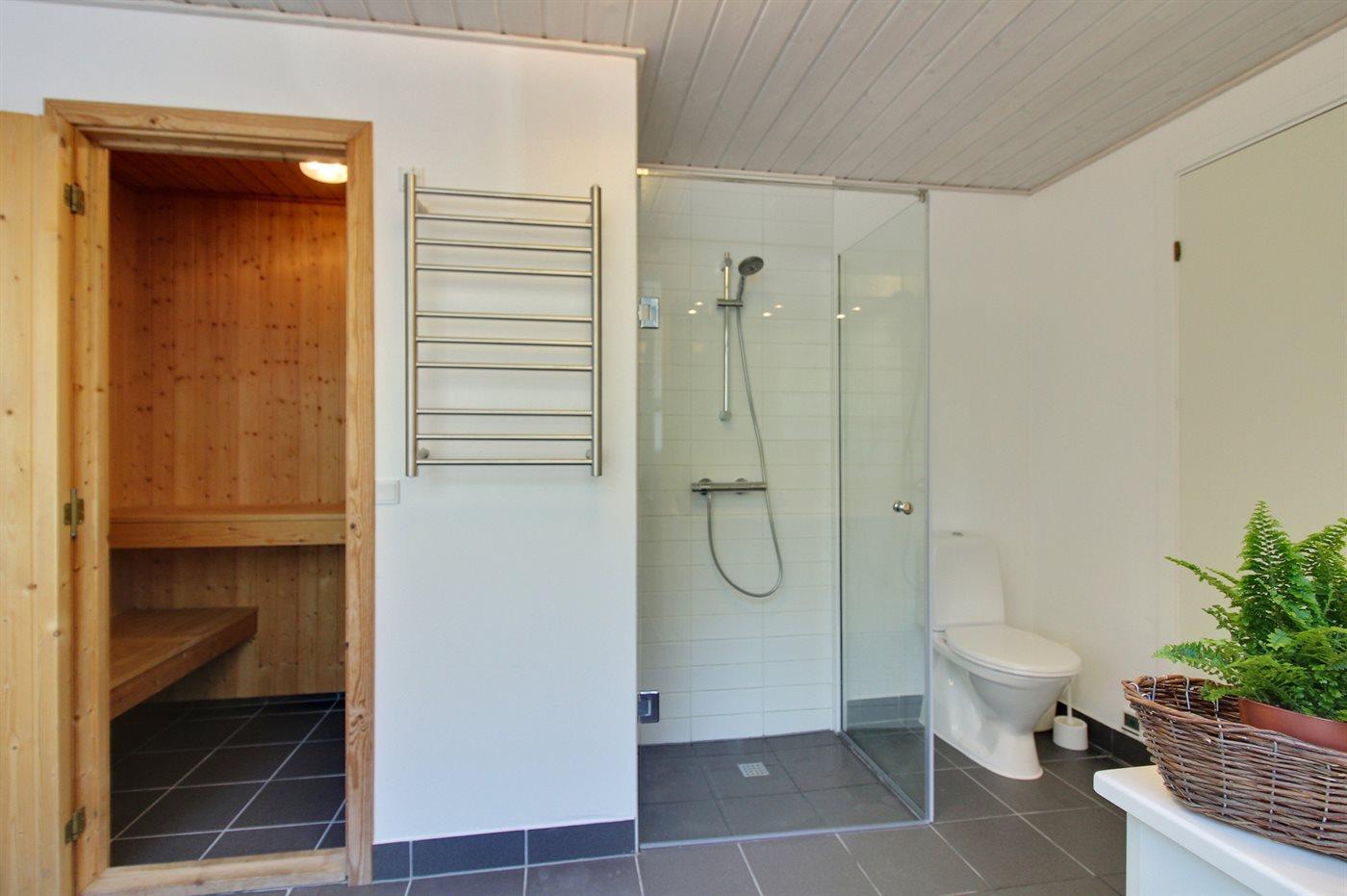 Der er 2 badeværelser med bruseniche og 2 toiletter. Der er gulvvarme på 2 badeværelser. I saunaen er der mulighed for afslapning.