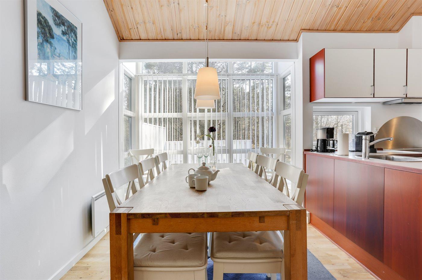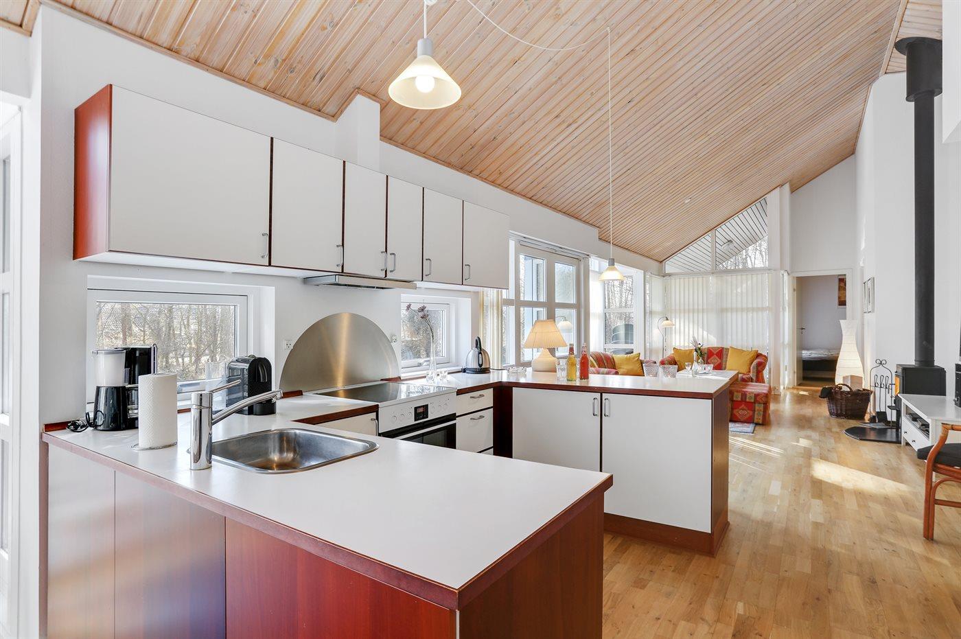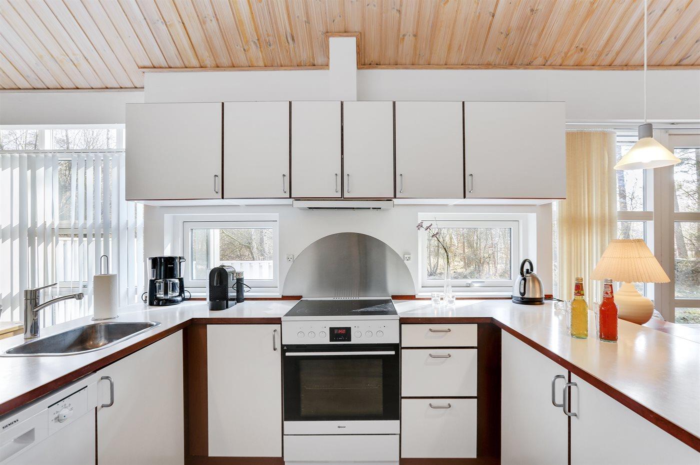 Køkkenet er udstyret med 1 køleskab. Der er 4 keramiske kogeplader, varmluftovn, mikrobølgeovn samt opvaskemaskine.