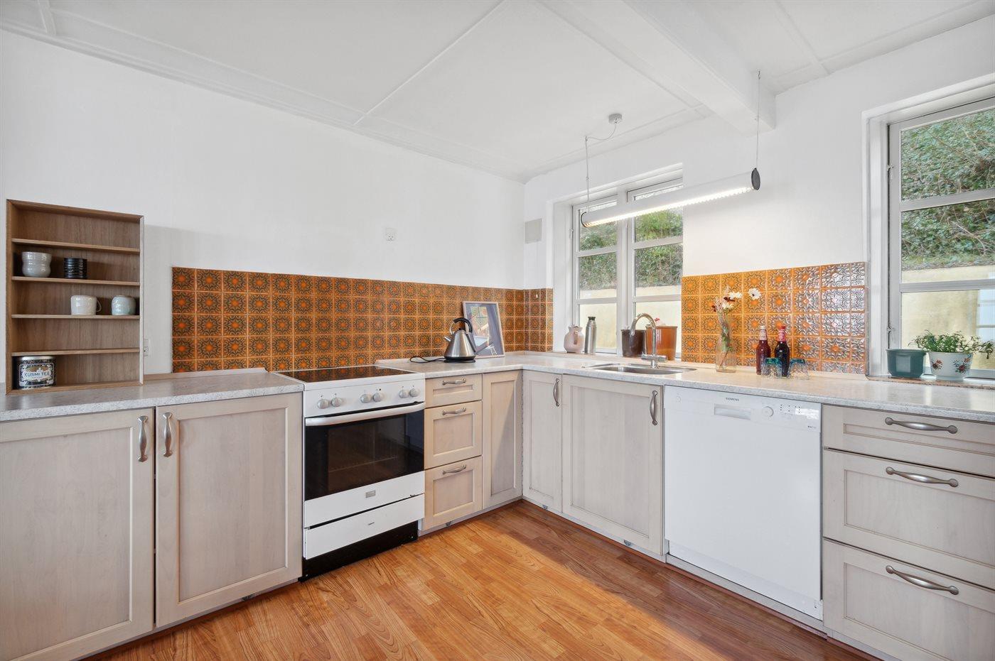 Køkkenet er udstyret med 1 køleskab. Der er 4 keramiske kogeplader, varmluftovn samt opvaskemaskine.