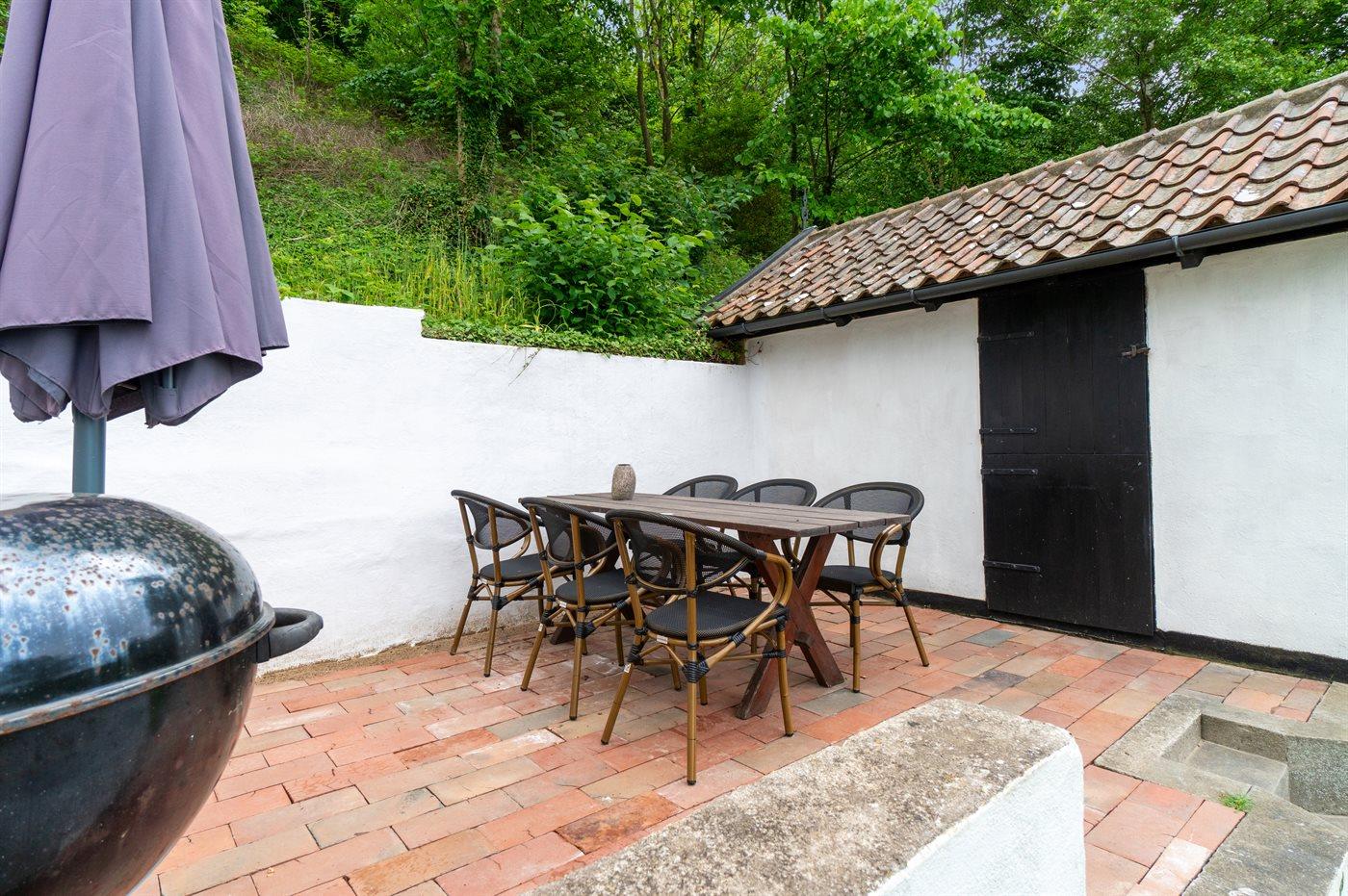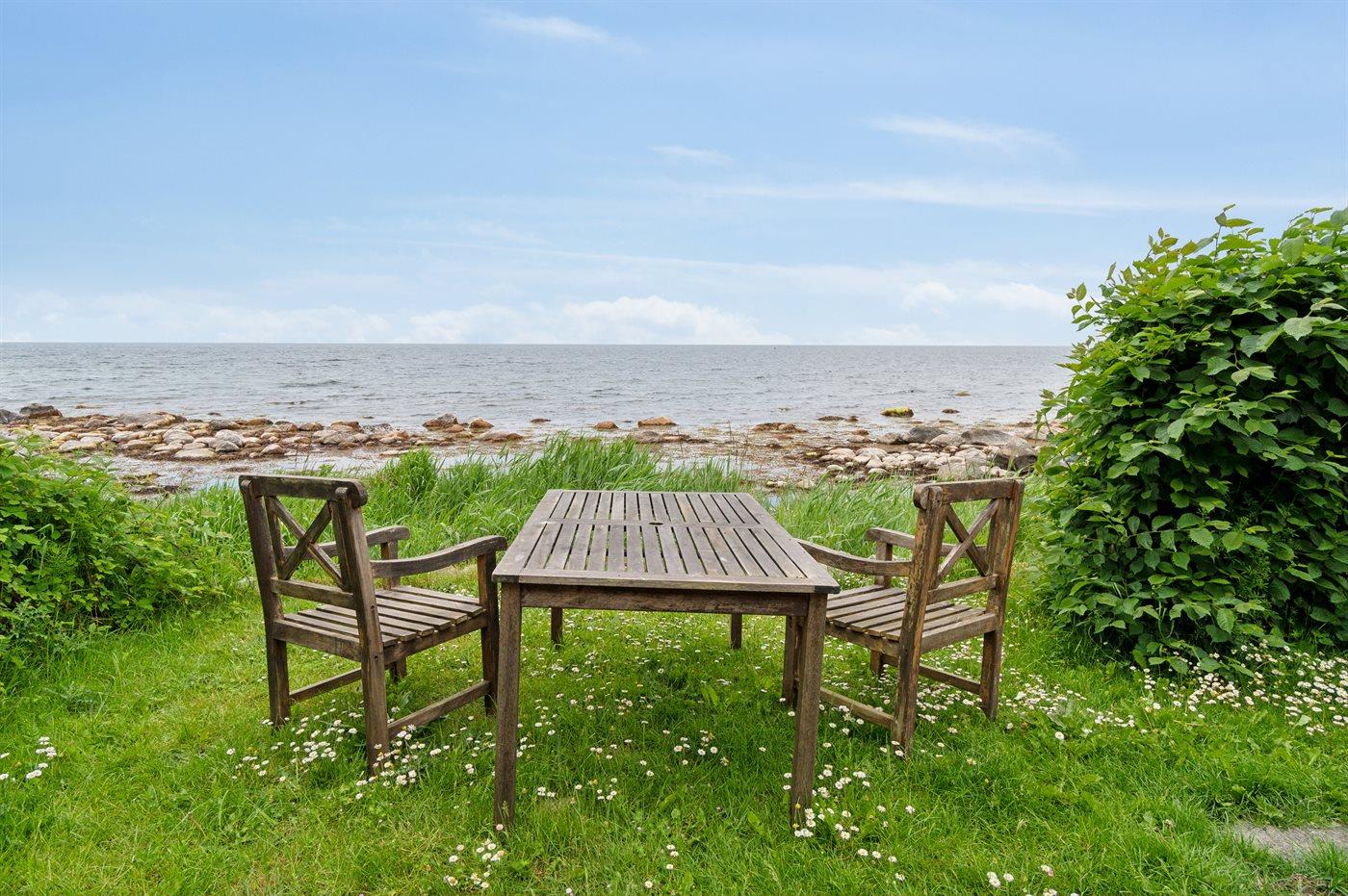 Husets grund går helt ned til vandet, hvor der også findes en lille, simpel indrettet siddeplads, således man kan nyde solnedgangen eller solen i fri natur til lyden af bølgerne.