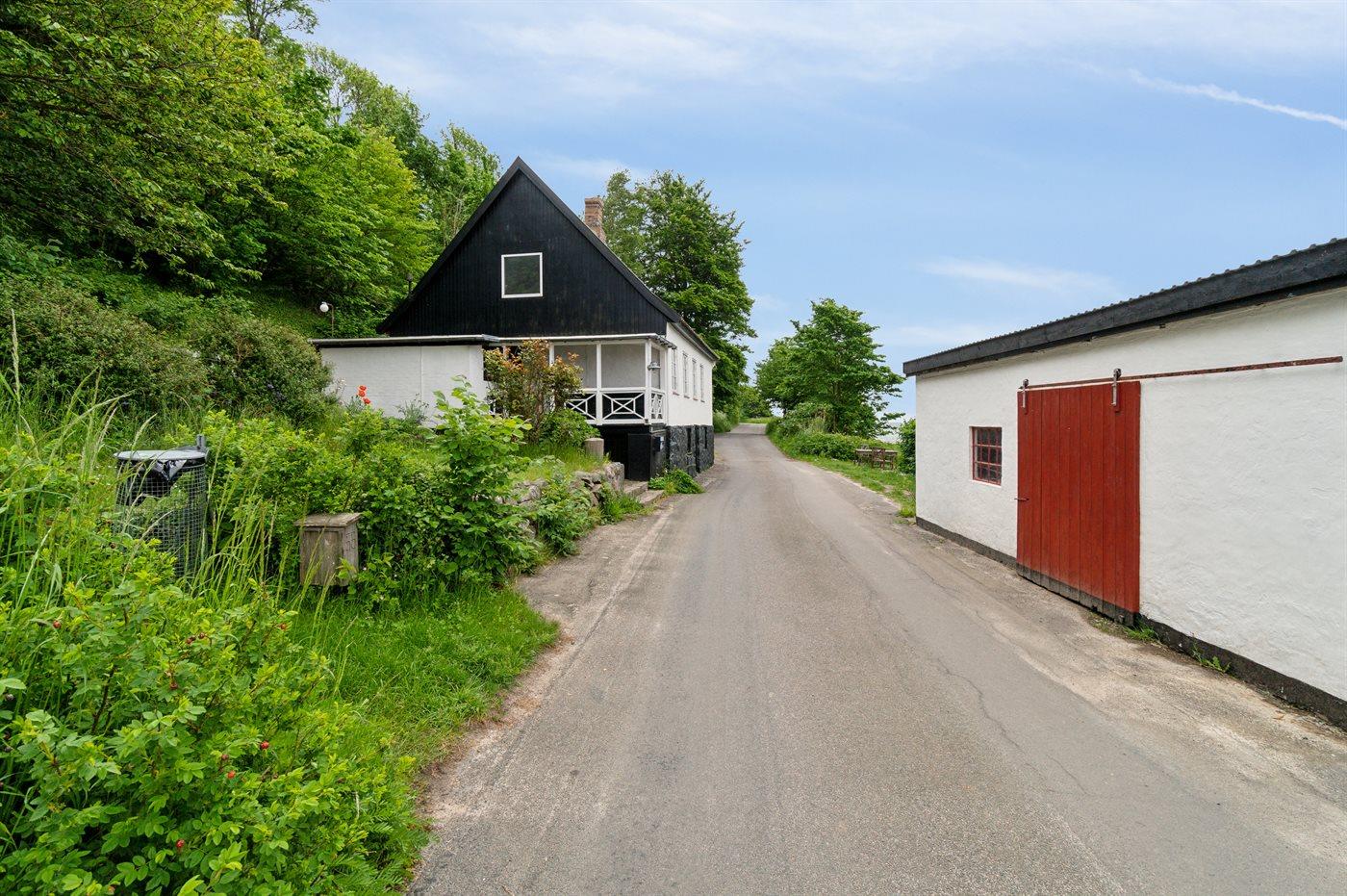 Selve grunden er stærkt kuperet - dog er adgangen til huset ukompliceret fra den lille vej, der fører videre hen til Helligpeder Havn.