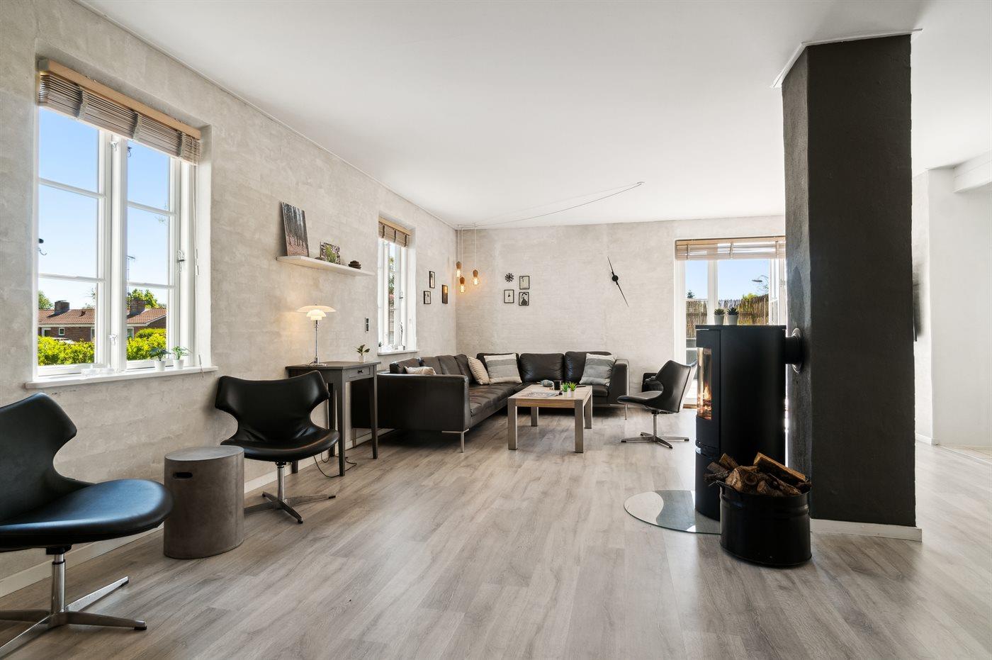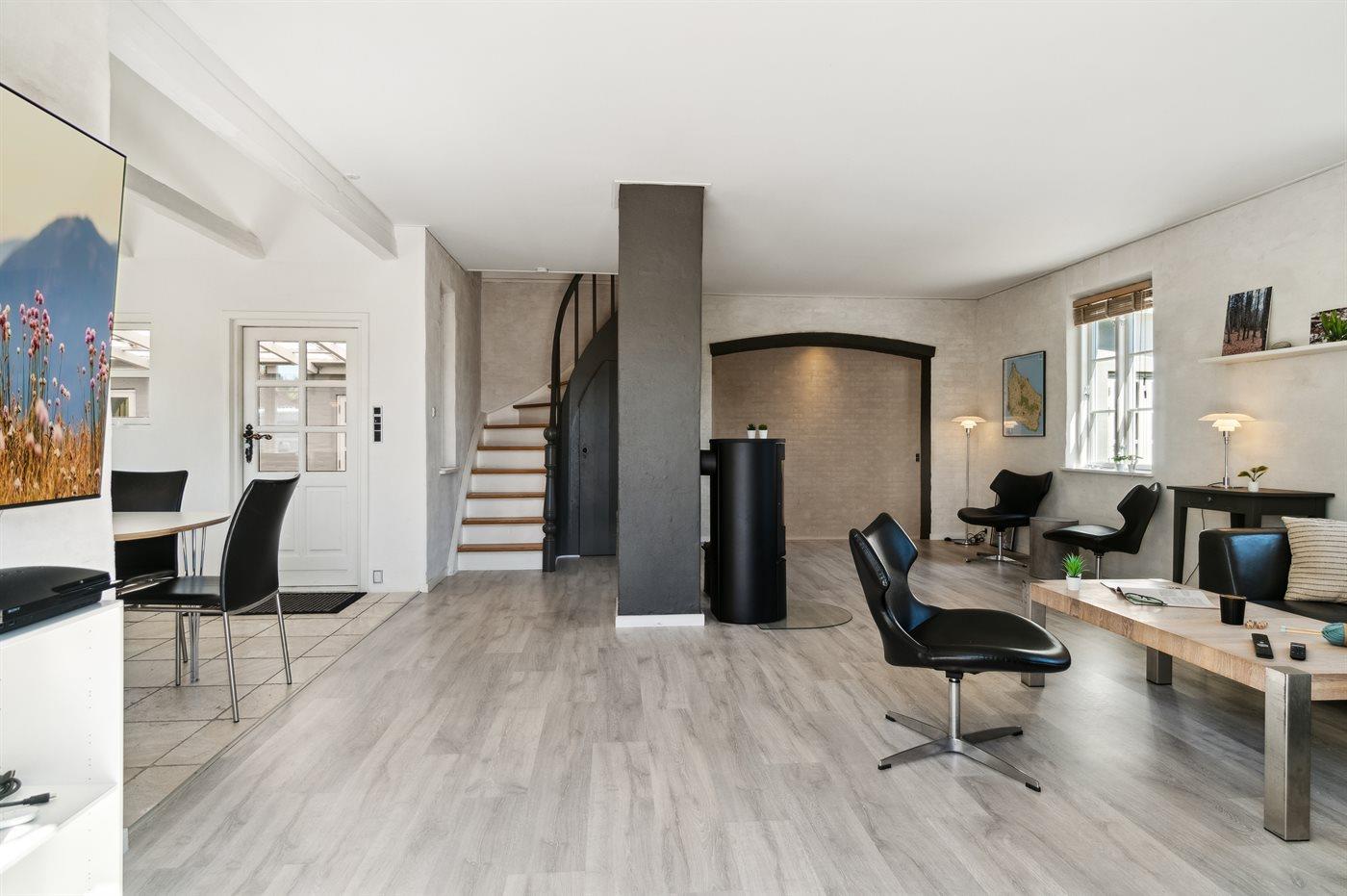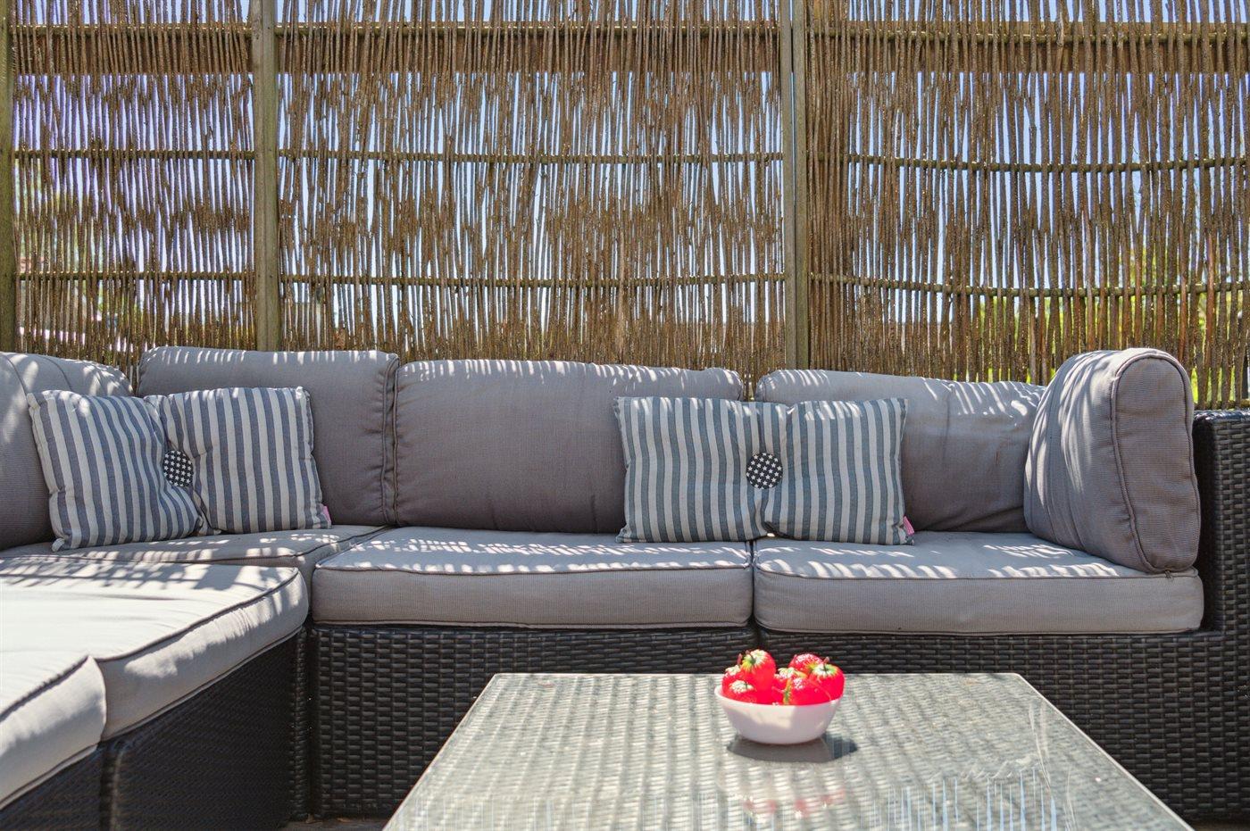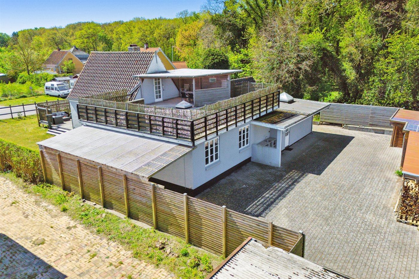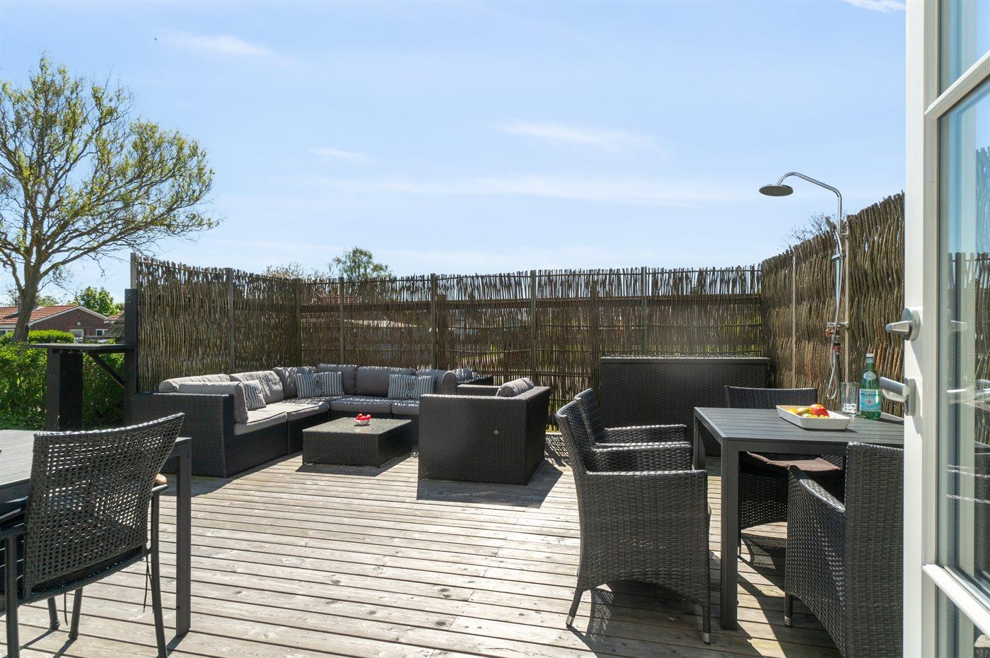 Stor afskærmet terrasse med direkte udgang fra stue og adgang til plænen foran huset suppleres med stor terrasse på 1. sal - delvis overdækket - giver mulighed for ugeneret at nyde solen eller hinandens selskab, når der grilles og hygges.