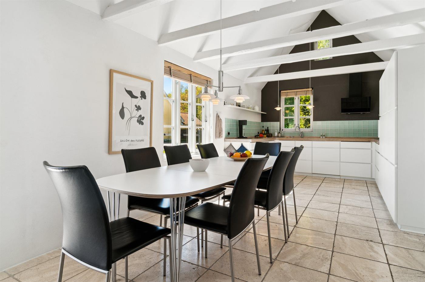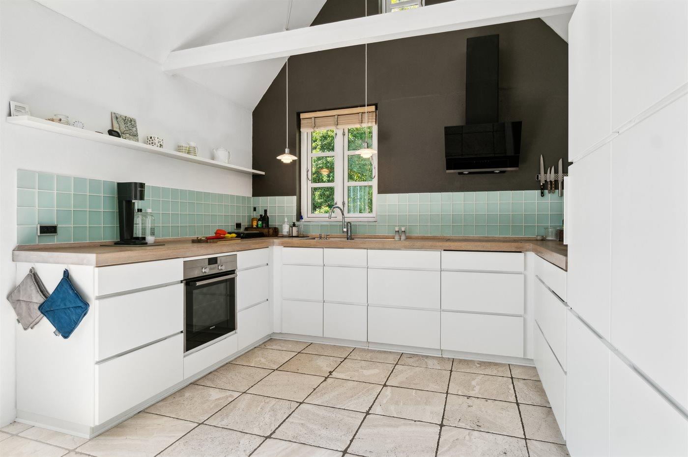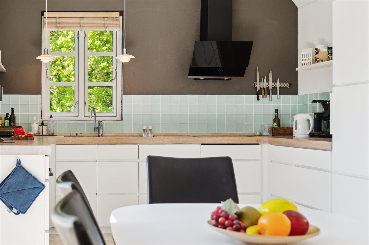 Køkkenet er udstyret med 1 køleskab. Der er 4 induktionskogeplader, varmluftovn, mikrobølgeovn samt opvaskemaskine Der er gulvvarme i køkkenet.