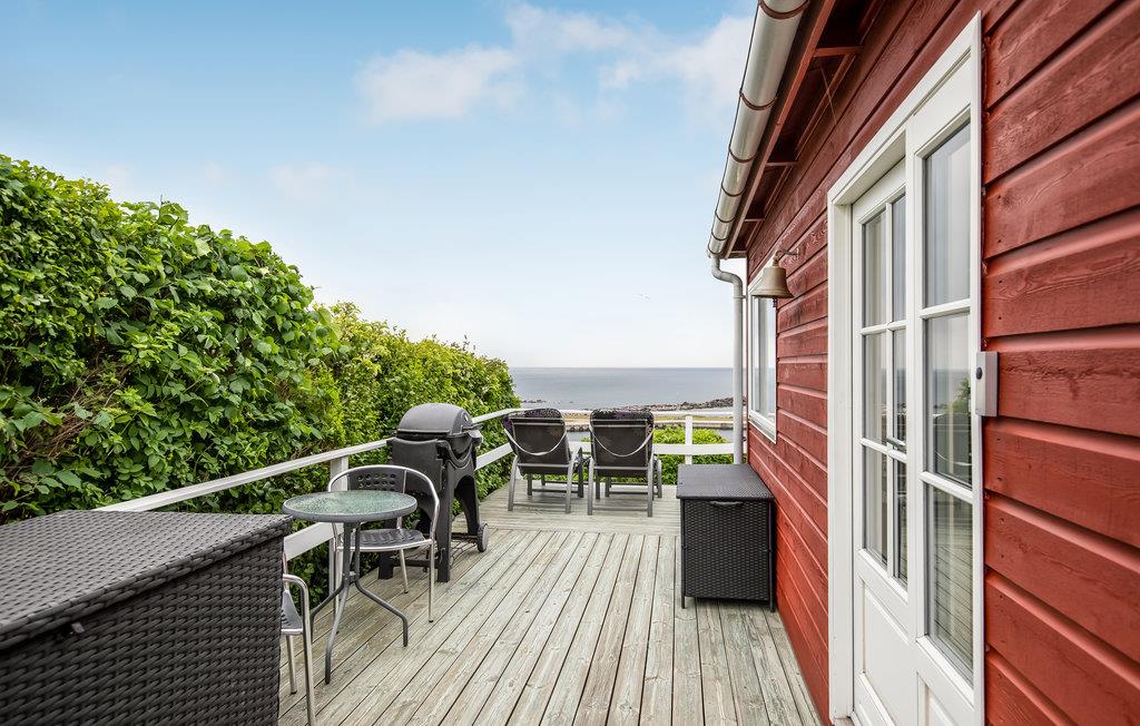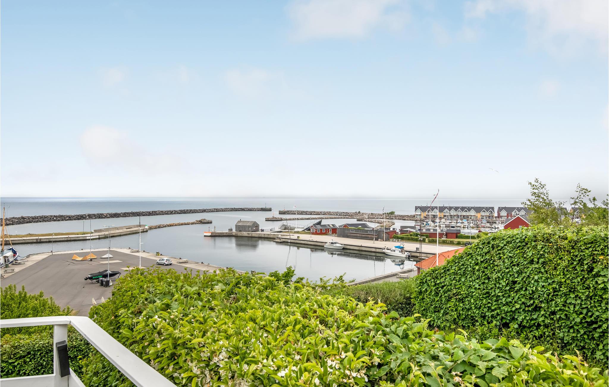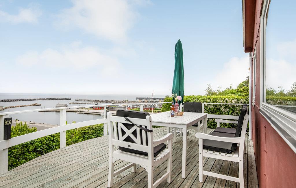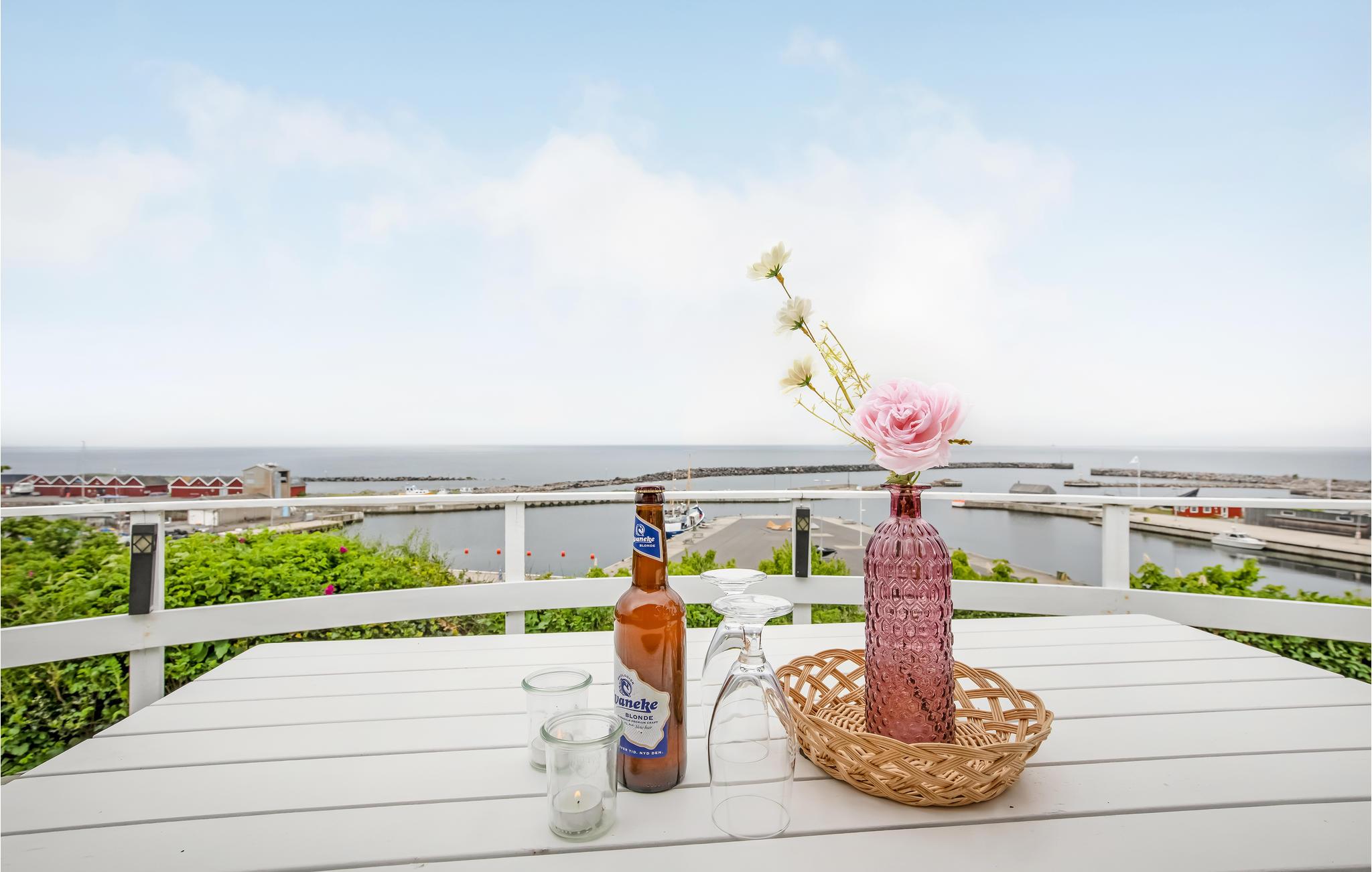 Hyggeligt træhus med panoramaudsigt over Hasle havn og Østersøen samt stor terrasse og nærhed til strand og byliv.