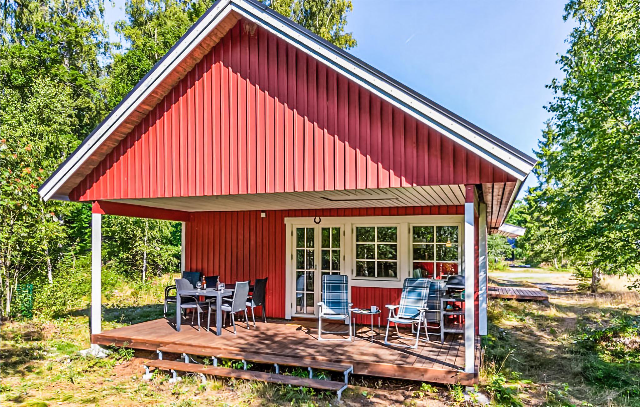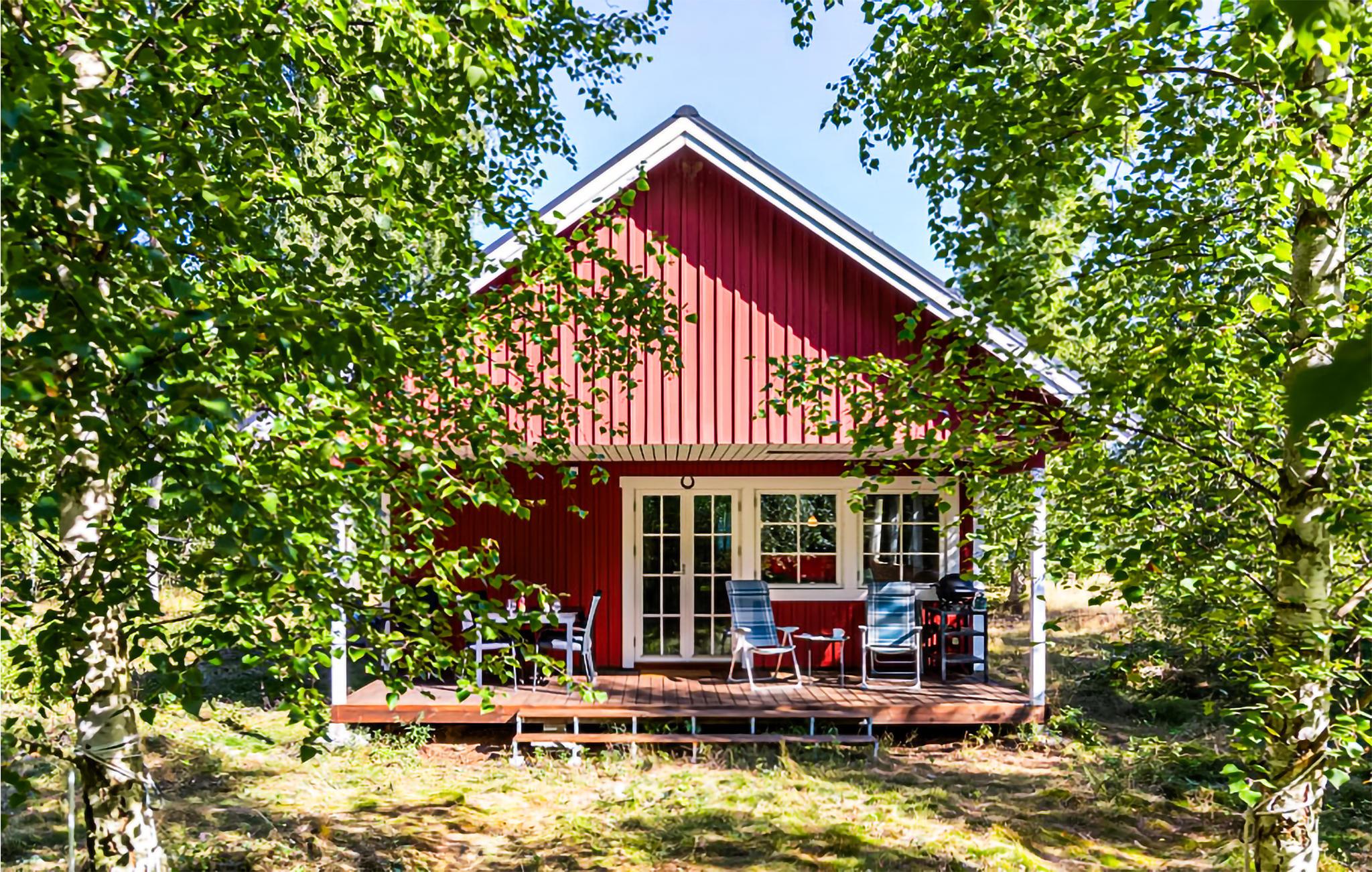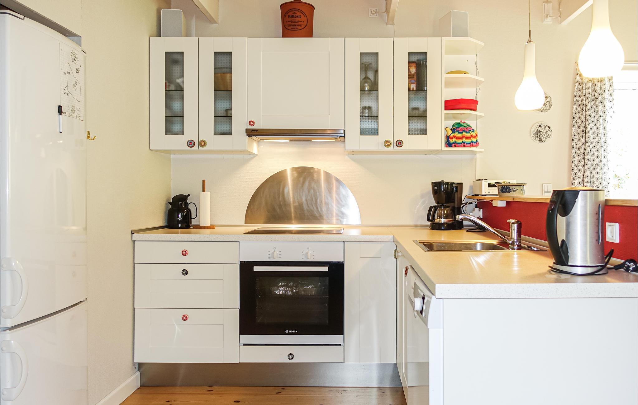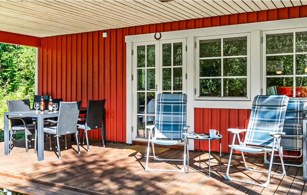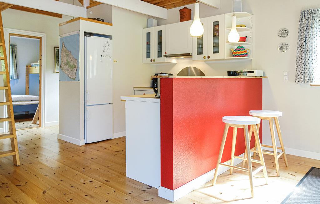 Hyggeligt sommerhus i træ nær børnevenlig strand og Hasle med terrasse, brændeovn og gratis WiFi.