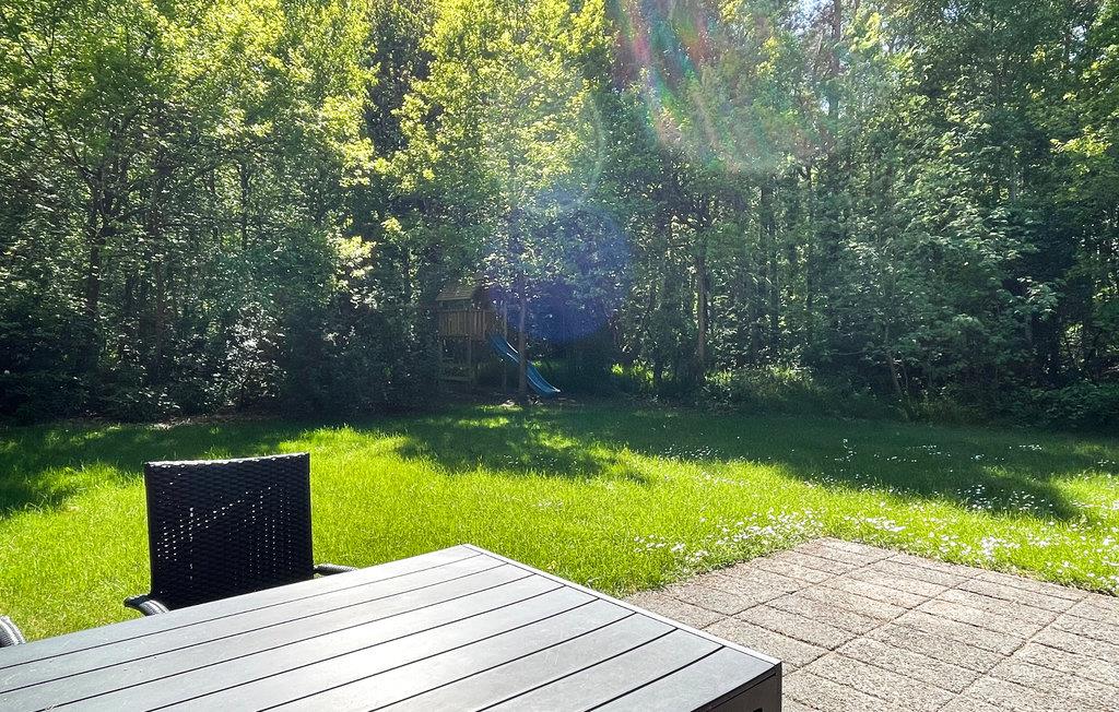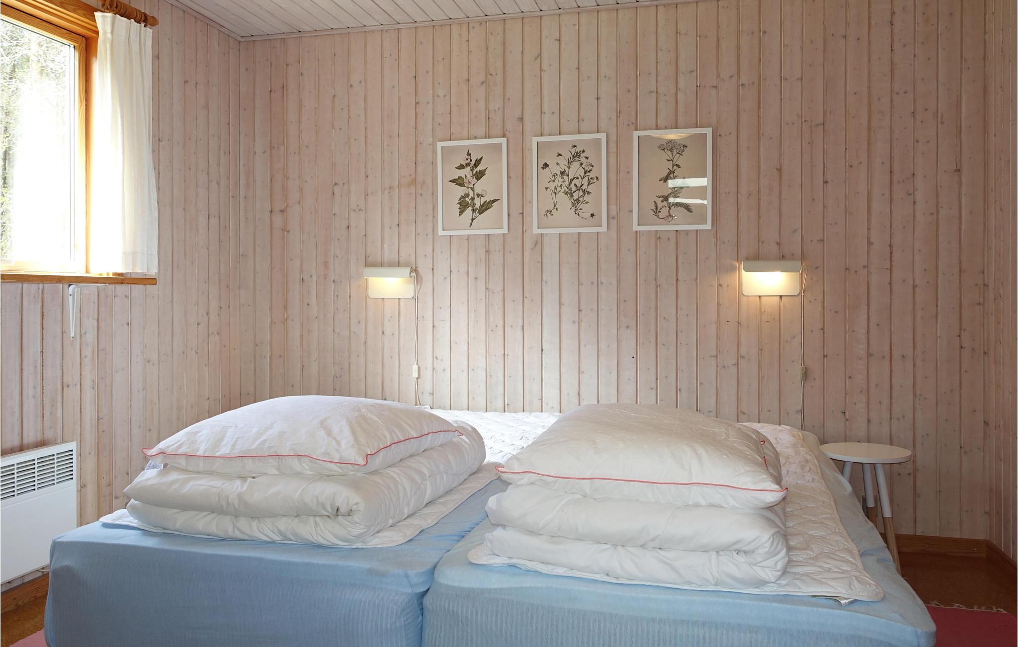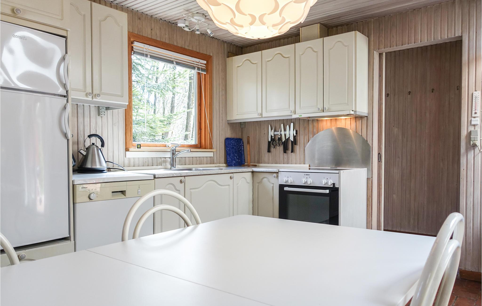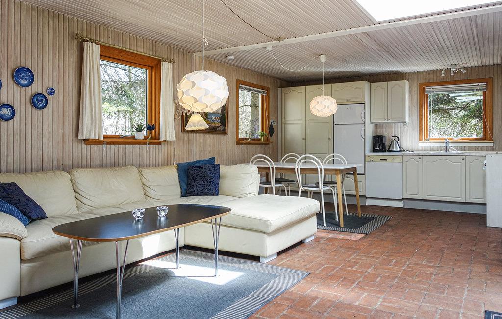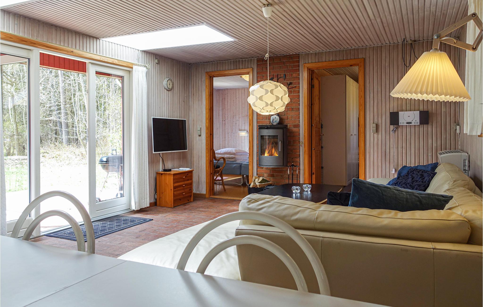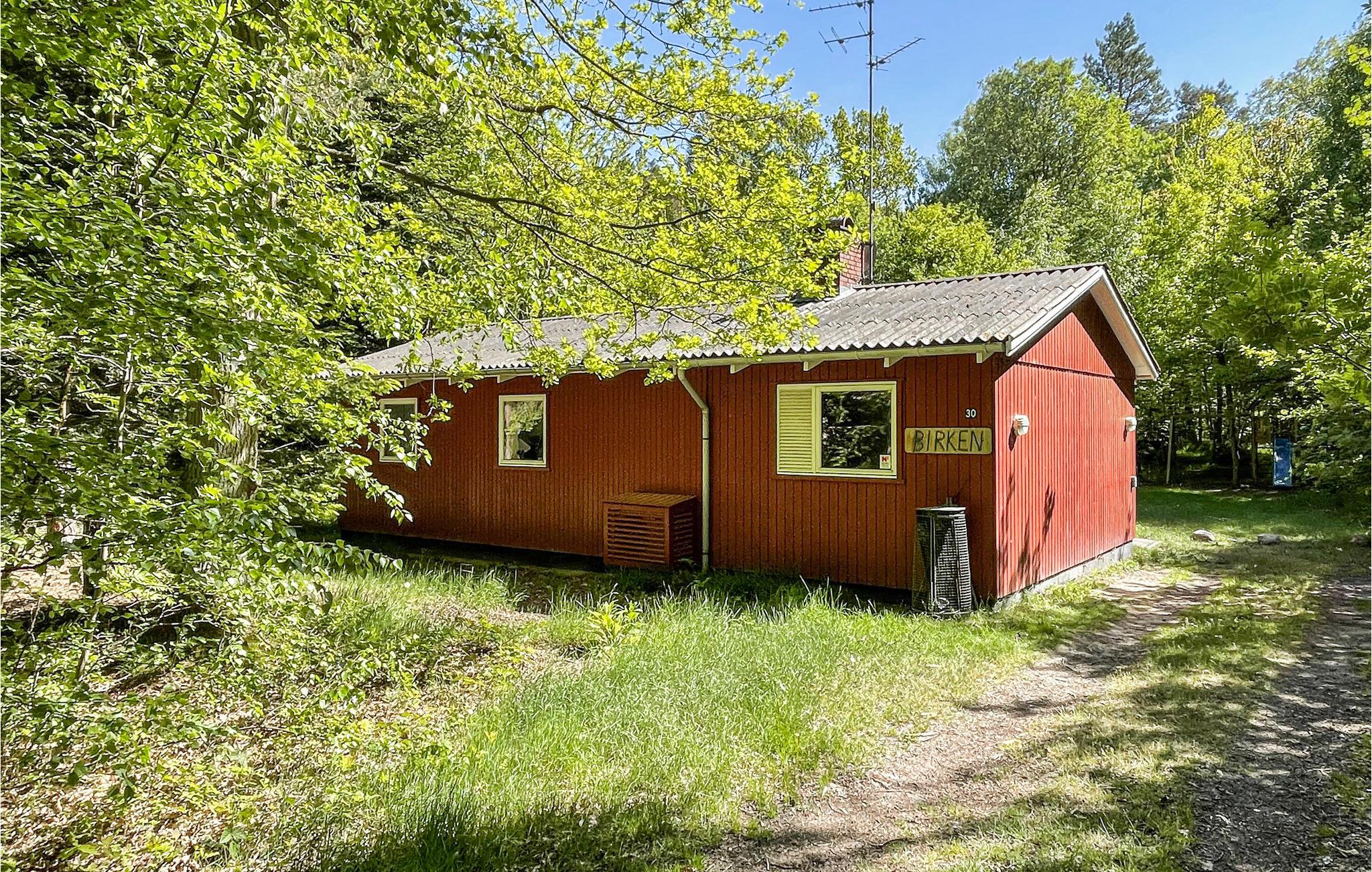 Dette indbydende sommerhus, som ligger på en skovklædt grund med græsplæne, er hjemligt og hyggeligt indrettet . Det består af en opholdsstue med brændeovn, TV og Apple-TV, et åbent, veludstyret køkken, to gode soveværelser og et badeværelse med vaskemaskine og gulvvarme. Der er gratis trådløst internet i huset. På den dejlige, solrige og delvist overdækkede terrasse med havemøbler kan I slappe dejligt af og tilberede lækre feriemåltider på grillen. I haven finder I et legetårn med gynger og en rutsjebane til børnenes underholdning.