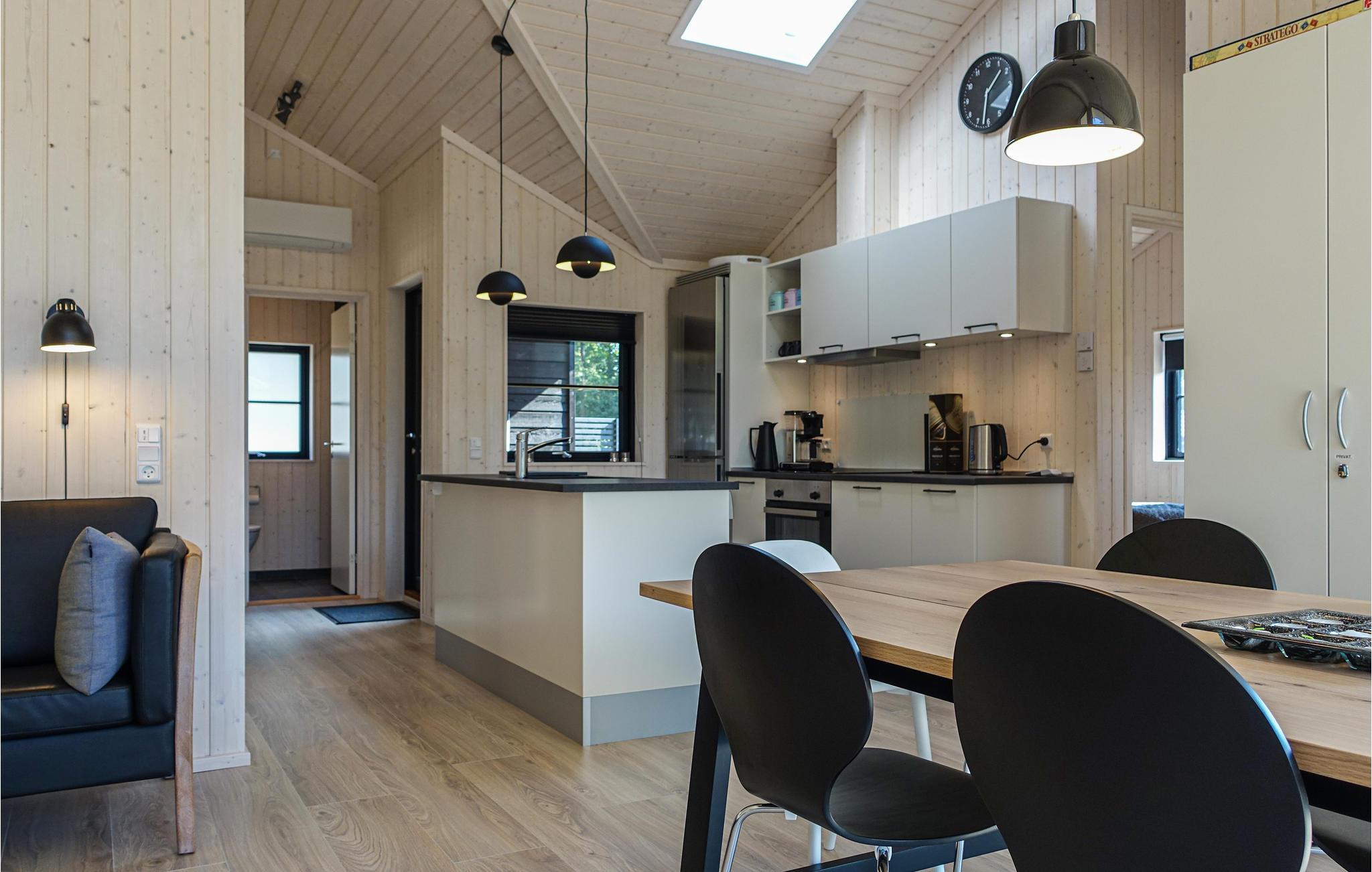 Husets hjerte er den rummelige, lyse opholdsstue med åbent køkken, hvor I kan tilberede indbydende måltider, slappe dejligt af med hyggesnak, kortspil, ferielæsning eller bare se fjernsyn. Om efteråret og vinteren kan I nyde varmen fra brændeovnen. Der er også en hyggelig alkove i stuen med to sovepladser (b=160 cm).