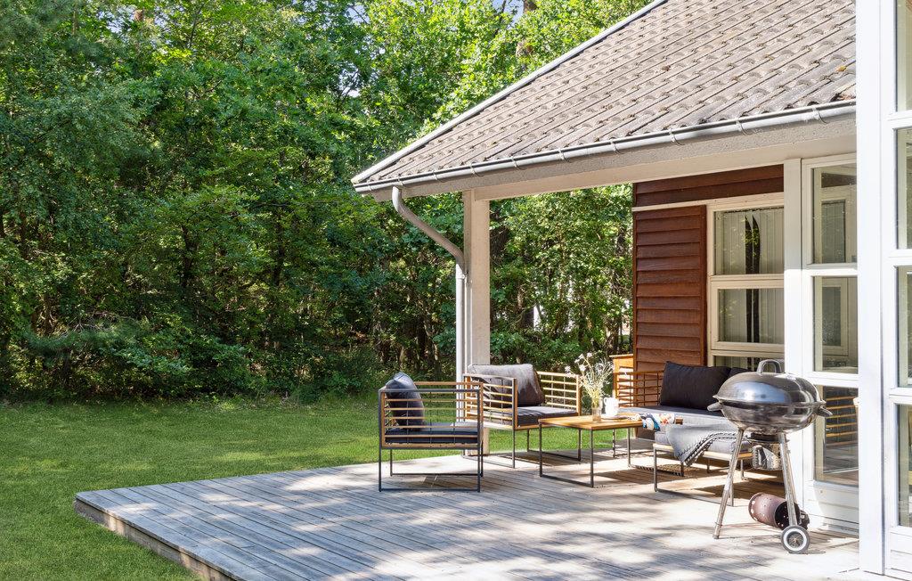 Moderne sommerhus nær skov og strand med sauna, spabad, brændeovn og stor terrasse.