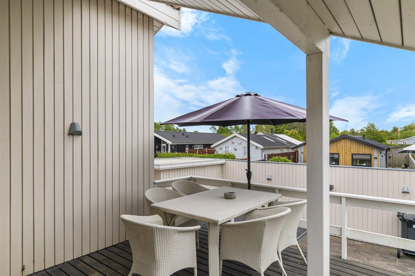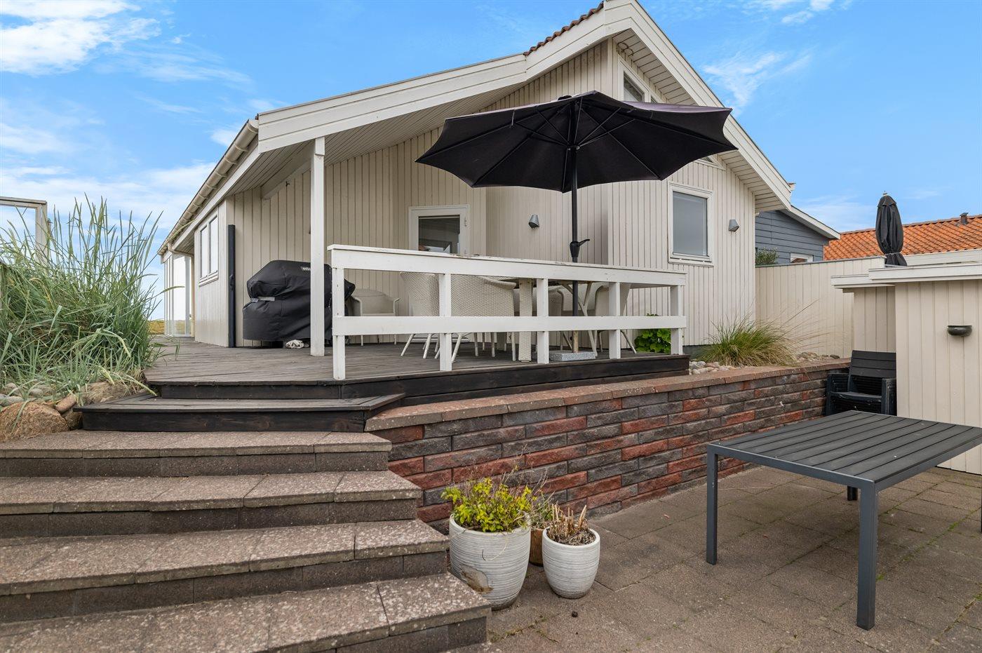 Huset har terrasser både foran og bag huset. Foran med havudsigt, som kan nydes hele dagen og solnegang. Bag huset et mere ugenert dejligt sydvendt terrasseområde.