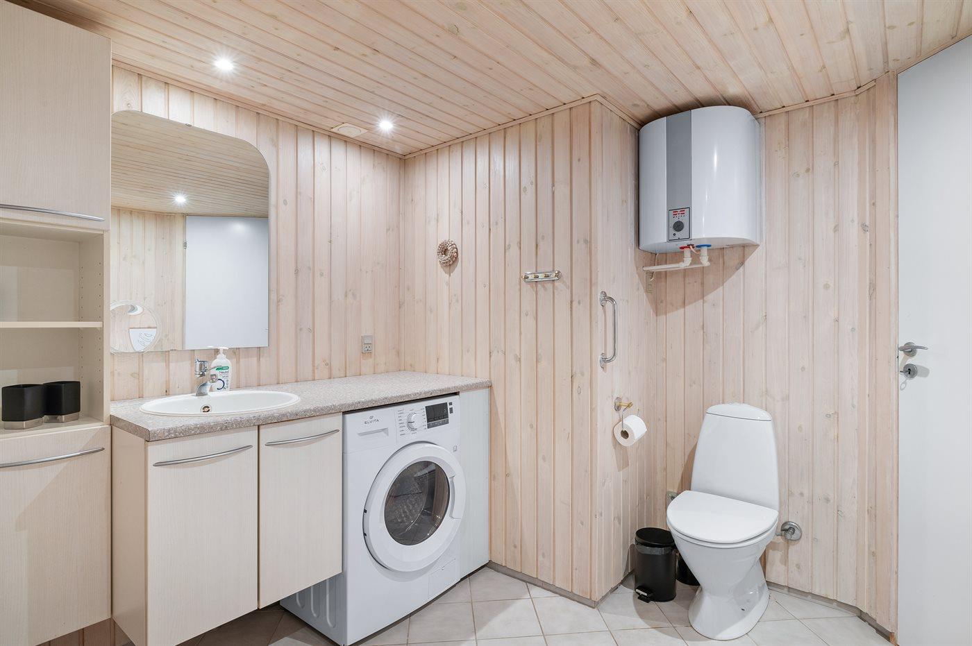 Der er 1 badeværelse med bruser og 1 toilet.. Der er gulvvarme på 1 badeværelse. I saunaen er der mulighed for afslapning.