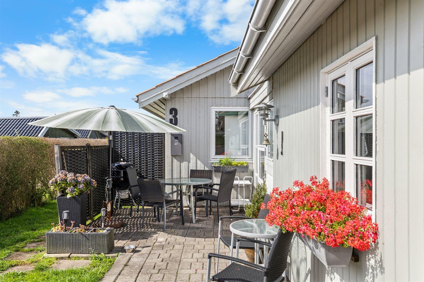 Ferieboligen er beliggende på en 734 m² stor havegrund. Grunden er indhegnet. Der er 100 m til havet. Nærmeste forretning er beliggende i en afstand af 3700 m. Til ferieboligen hører åbent terrasseareal. Desuden er der overdækket terrasse. Ligeledes er der adgang til udestue. Gynge. Sandkasse. Legehus. Bålsted. Udendørs bruser. Grill til rådighed. Der er carport til rådighed. Parkering ved ferieboligen.