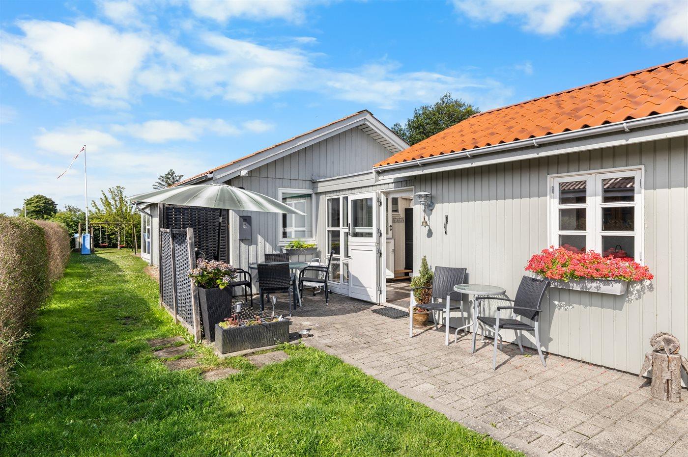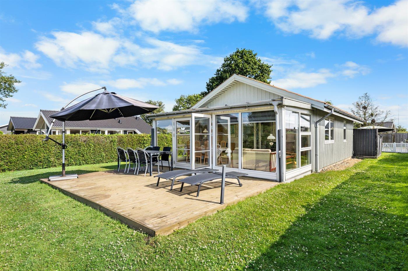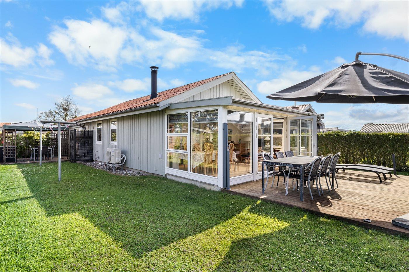 Hyggeligt sommerhus ved Hasmark med stor udestue og skøn sydvendt have med aktiviteter.