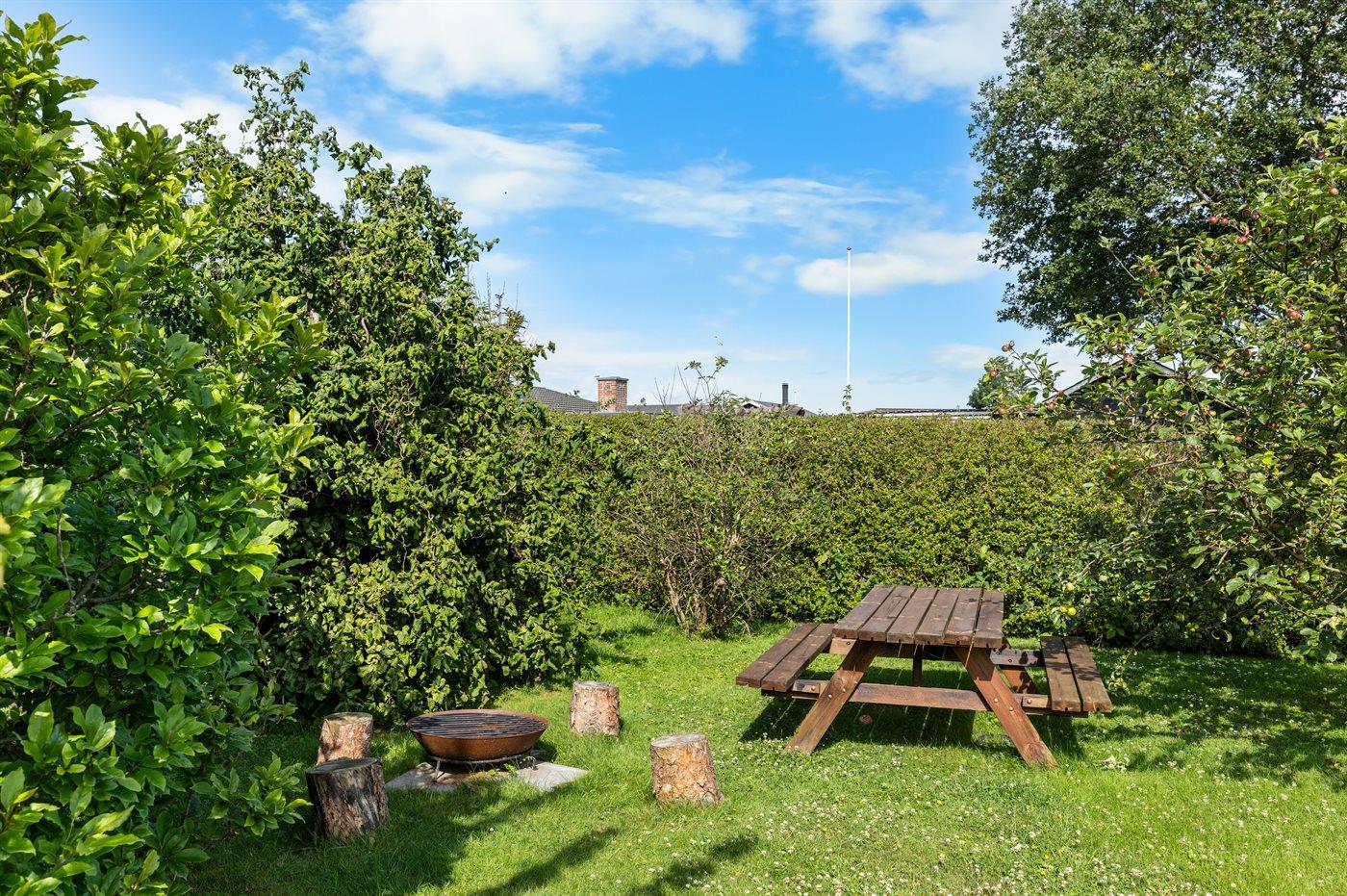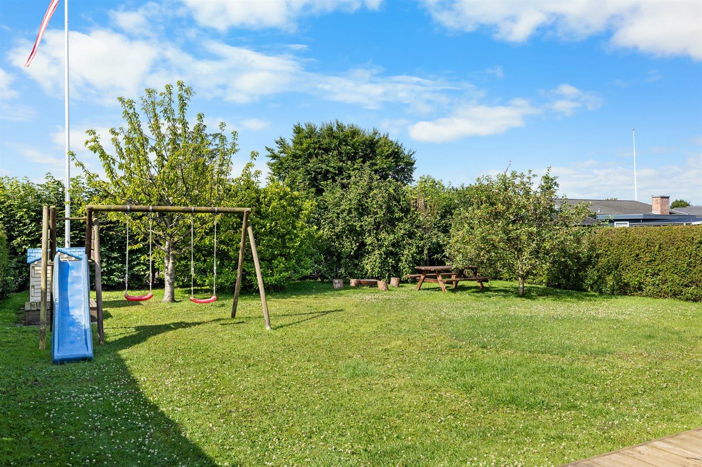 Der findes en skøn sydvendt have med flere aktiviteter for børn og voksne, og flere gode terrasseområder, hvoraf det ene er overdækket ved hjælp af en pavillon.
