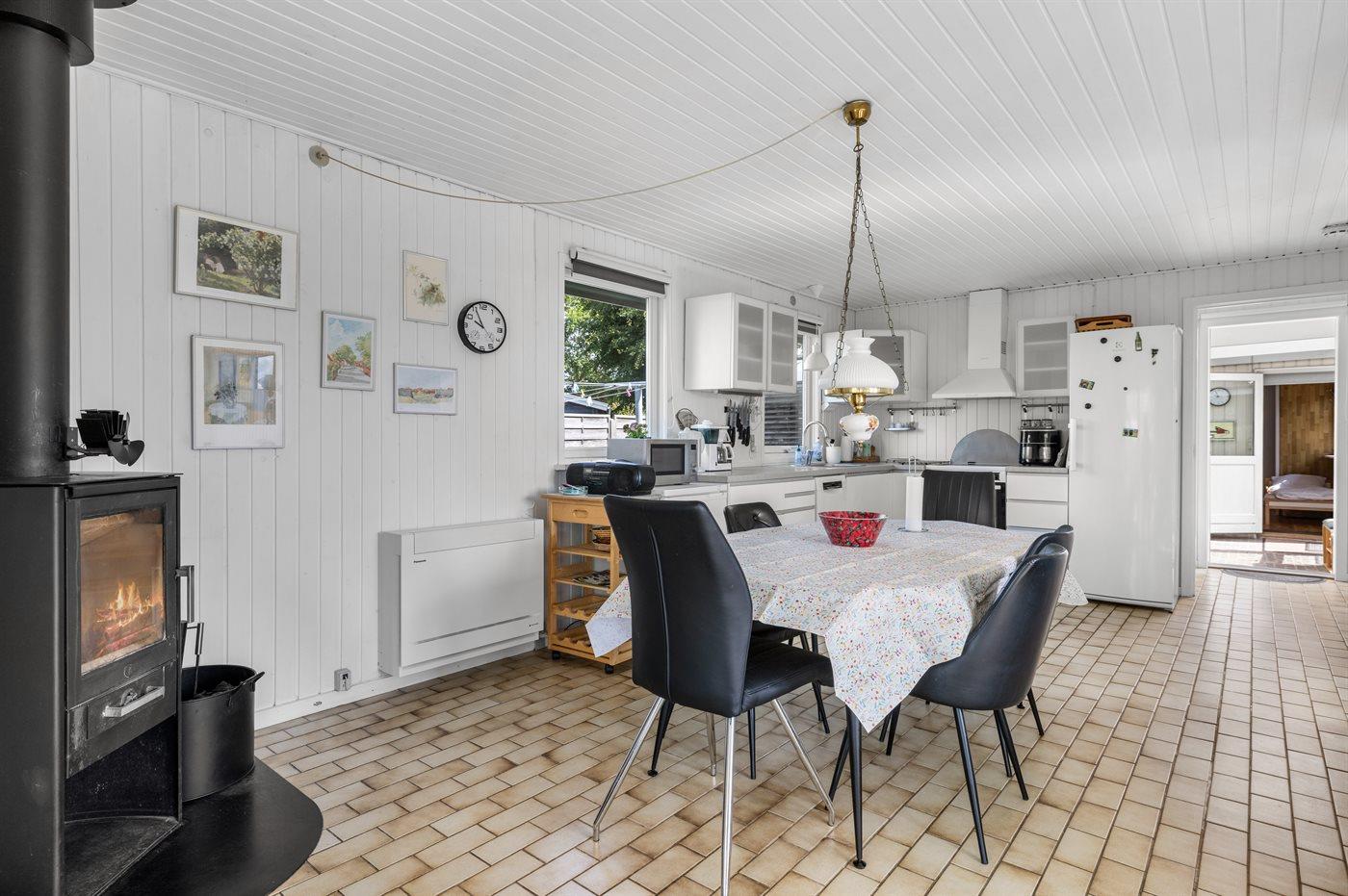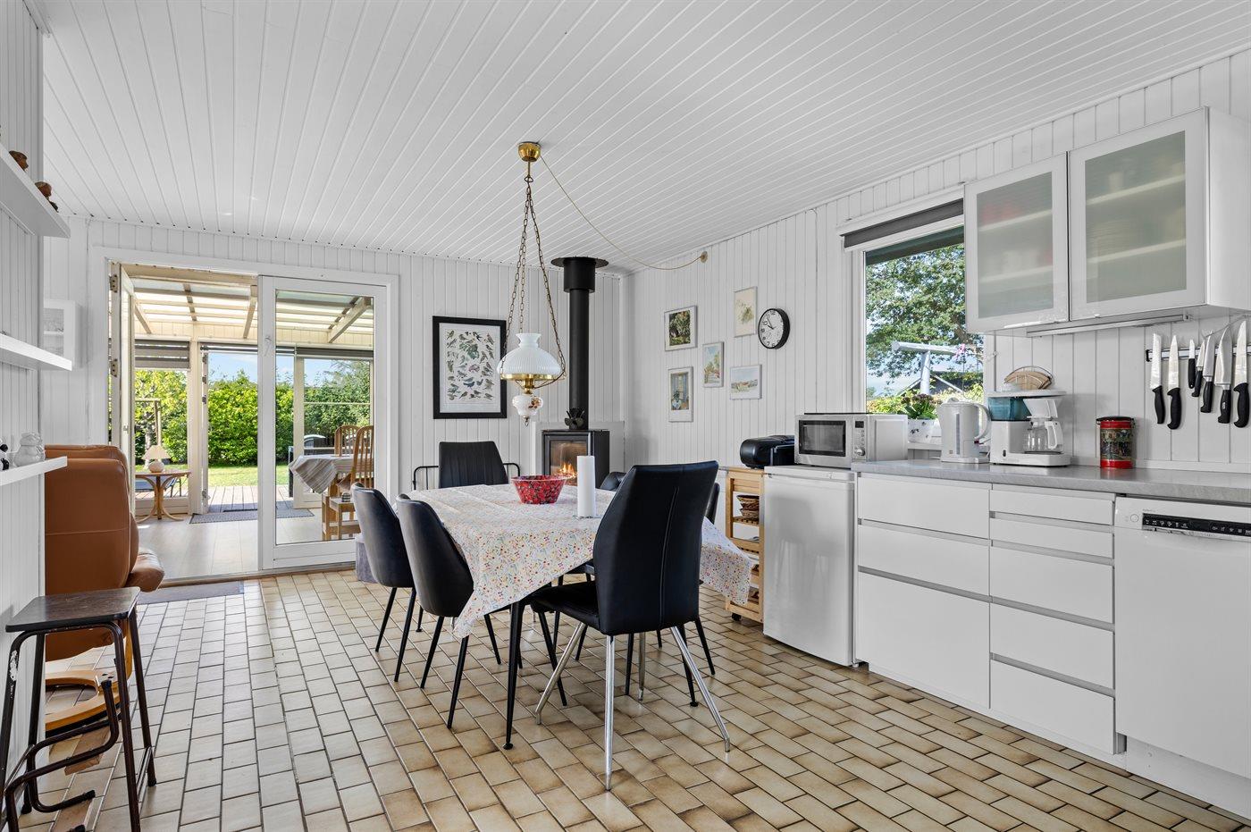 Køkkenet er udstyret med 1 køleskab. Der er 4 keramiske kogeplader, varmluftovn, mikrobølgeovn, Airfryer samt opvaskemaskine.