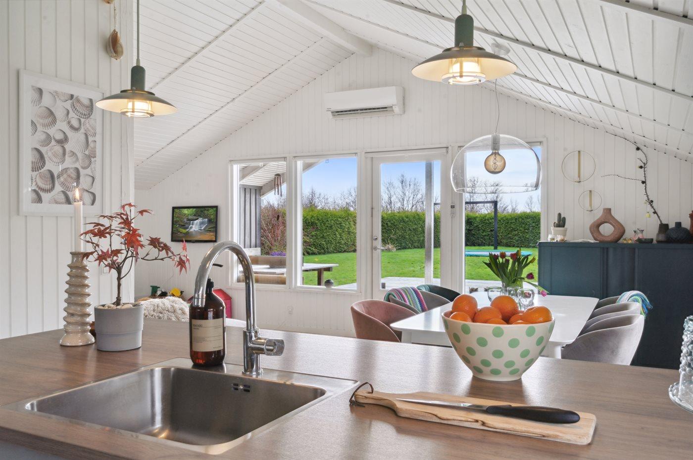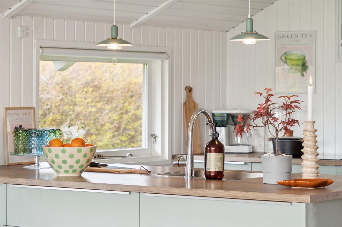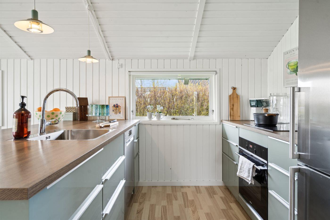 Køkkenet er udstyret med 1 køleskab. Der er 4 induktionskogeplader, varmluftovn samt opvaskemaskine.