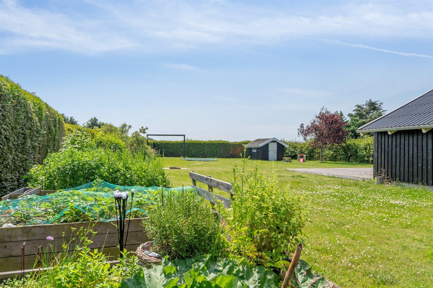 Bag huset er der et stort og ugenert, sydvendt terrasseareal, hvor man kan nyde dejlige timer i solen, men også hyggelige aftener på den overdækkede del af terrassen.
