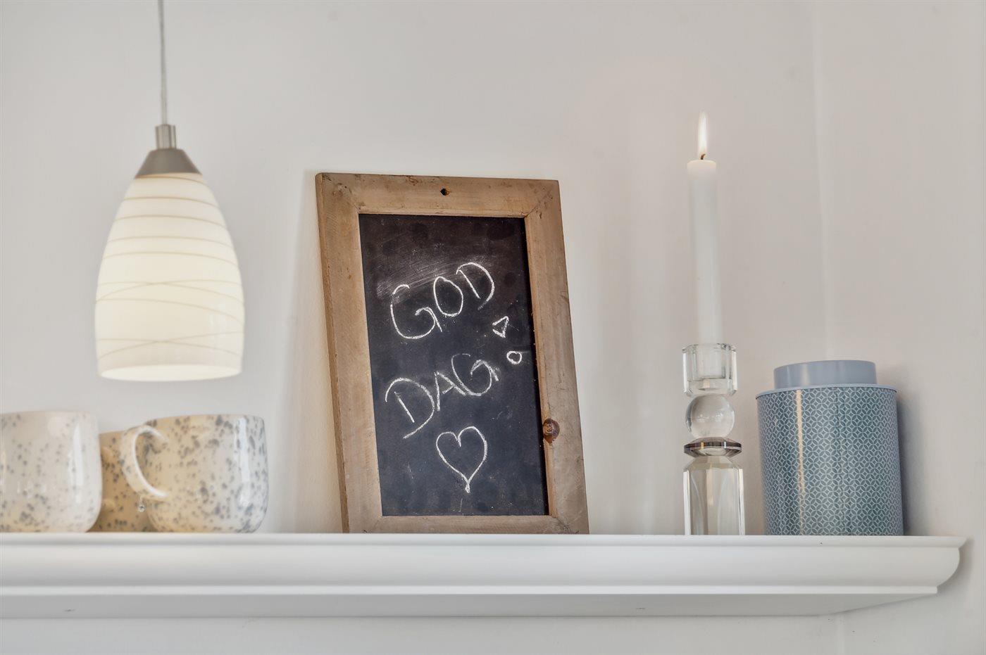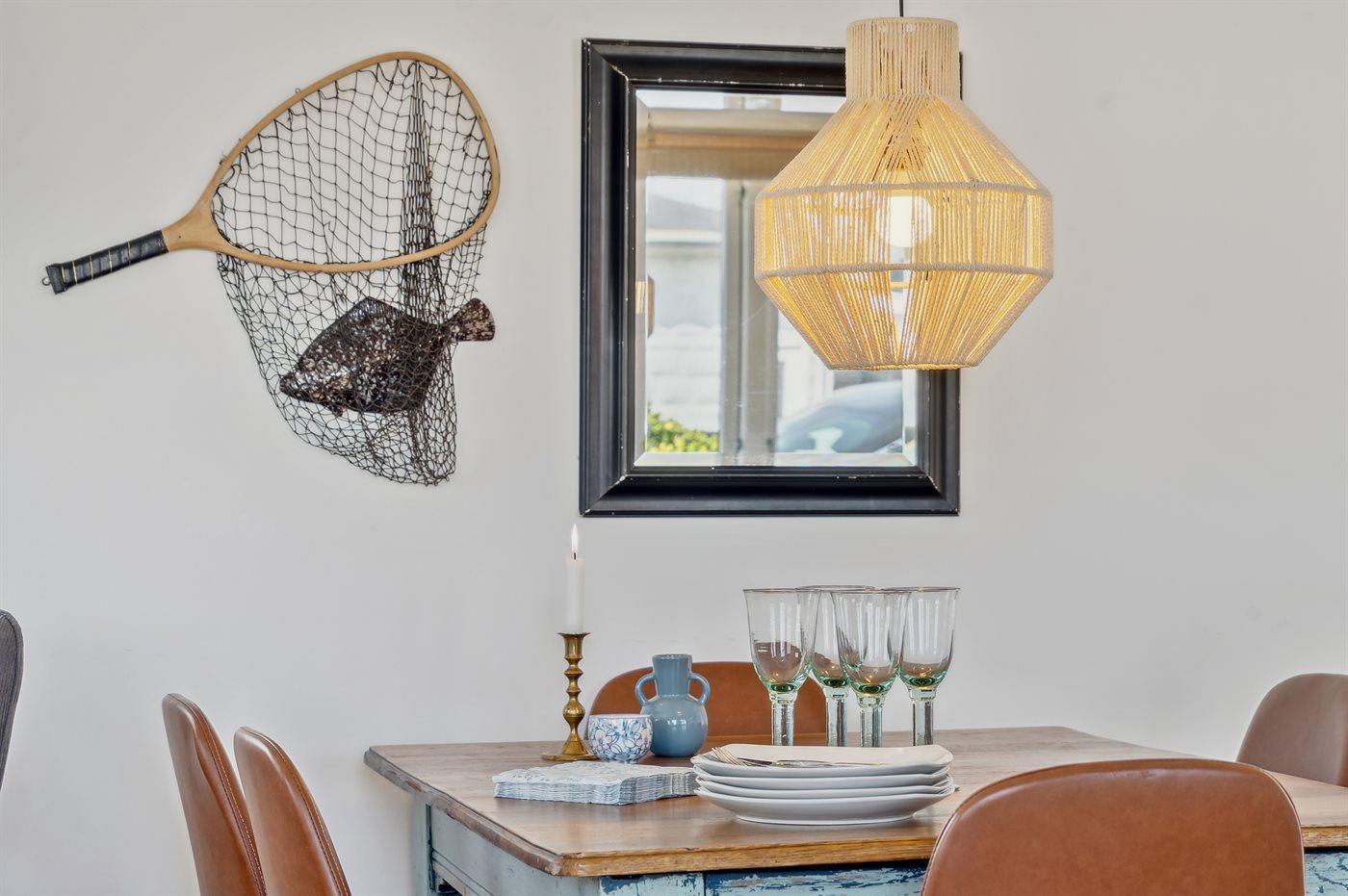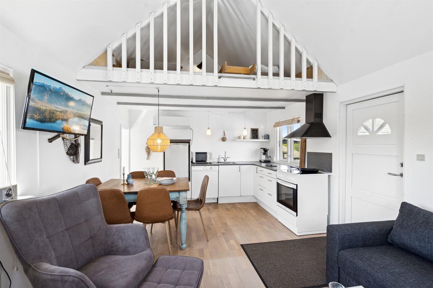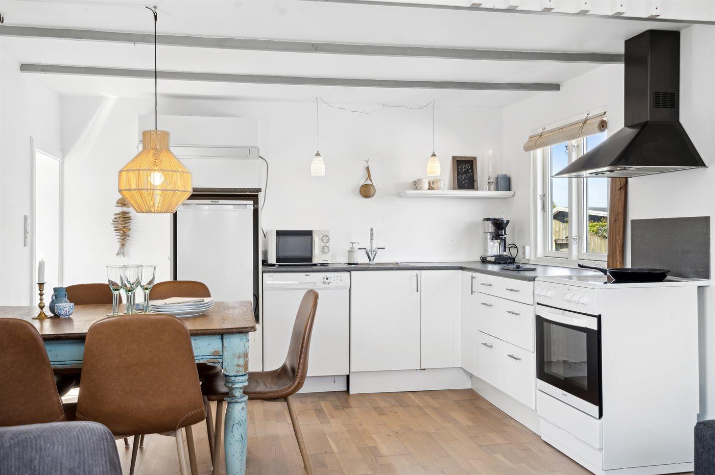 Køkkenet er udstyret med 1 køleskab. Der er 4 keramiske kogeplader, varmluftovn, mikrobølgeovn samt opvaskemaskine.