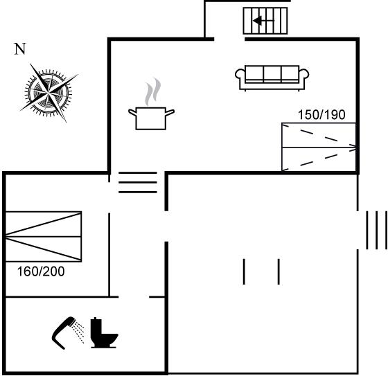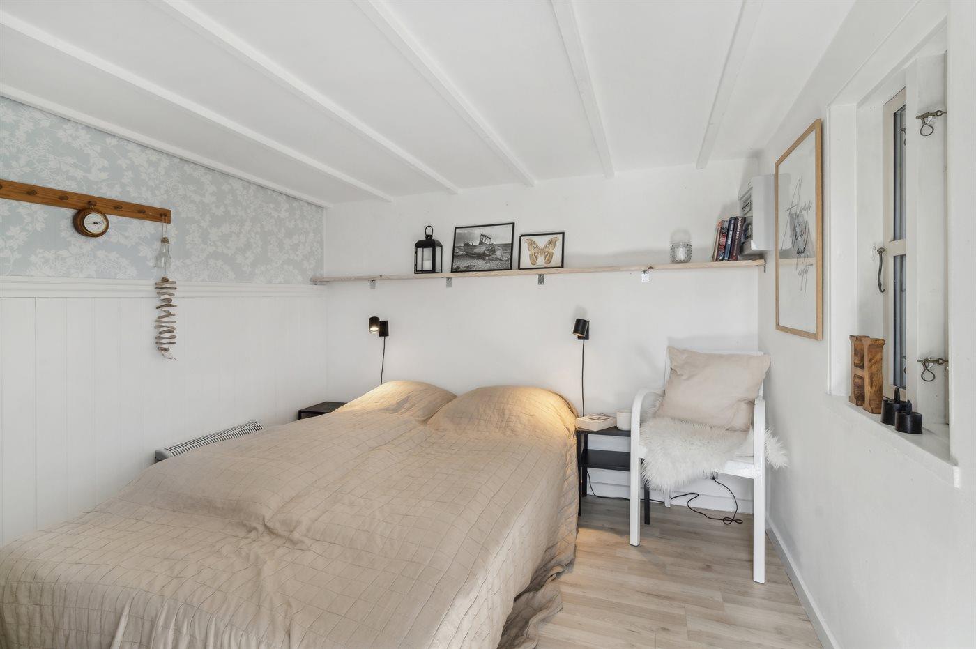 Der er i alt 1 soveværelse. Sovepladserne fordeler sig på: 2 sovepladser i dobbeltseng. 2 sovepladser i sovesofa (dobbelt). 2 sovepladser på madrasser. 2 af disse sovepladser befinder sig på husets hems, og 2 andre af disse sovepladser befinder sig i stuen.