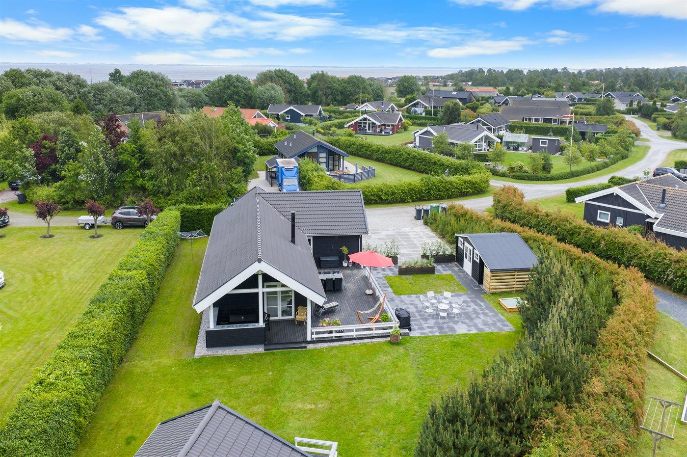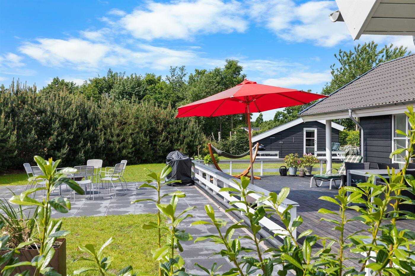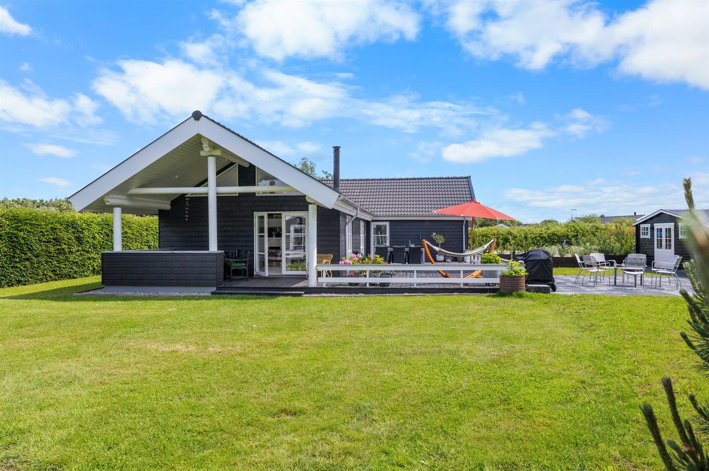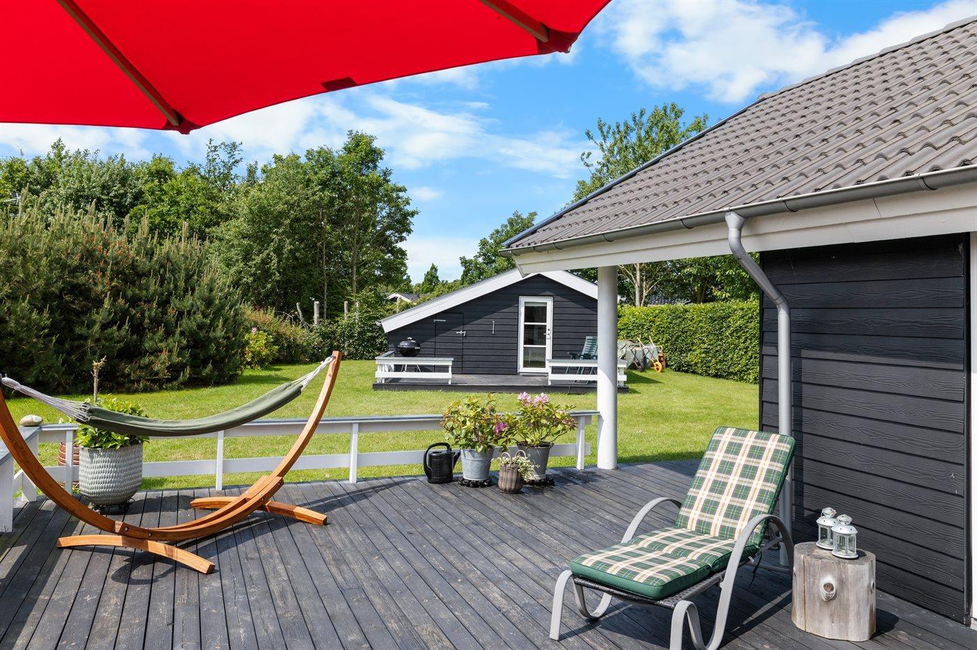 Ferieboligen er beliggende på en 1173 m² stor havegrund. Der er 320 m til havet. Nærmeste forretning er beliggende i en afstand af 4500 m. Til ferieboligen hører åbent terrasseareal. Desuden er der overdækket terrasse. Gynge. Sandkasse. Bålsted. Grill til rådighed. Der er installeret stik til opladning af elbil. Parkering ved ferieboligen.