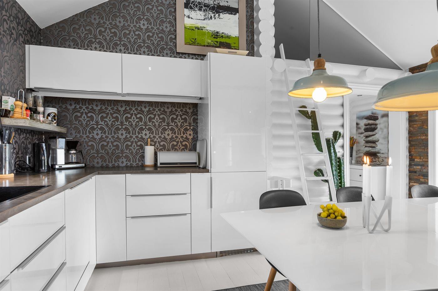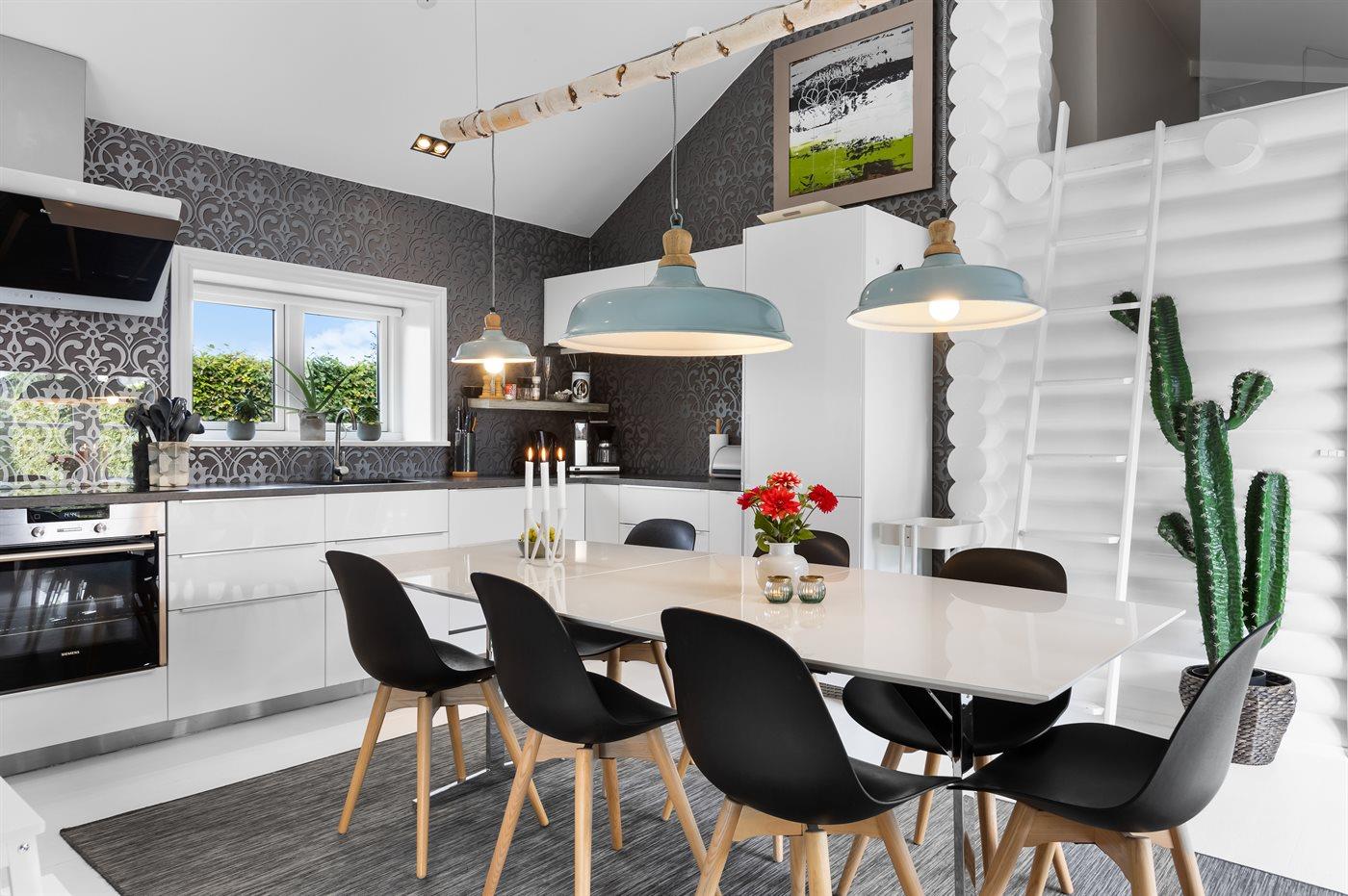 Køkkenet er udstyret med 1 køleskab. Der er 4 induktionskogeplader, varmluftovn, mikrobølgeovn samt opvaskemaskine.