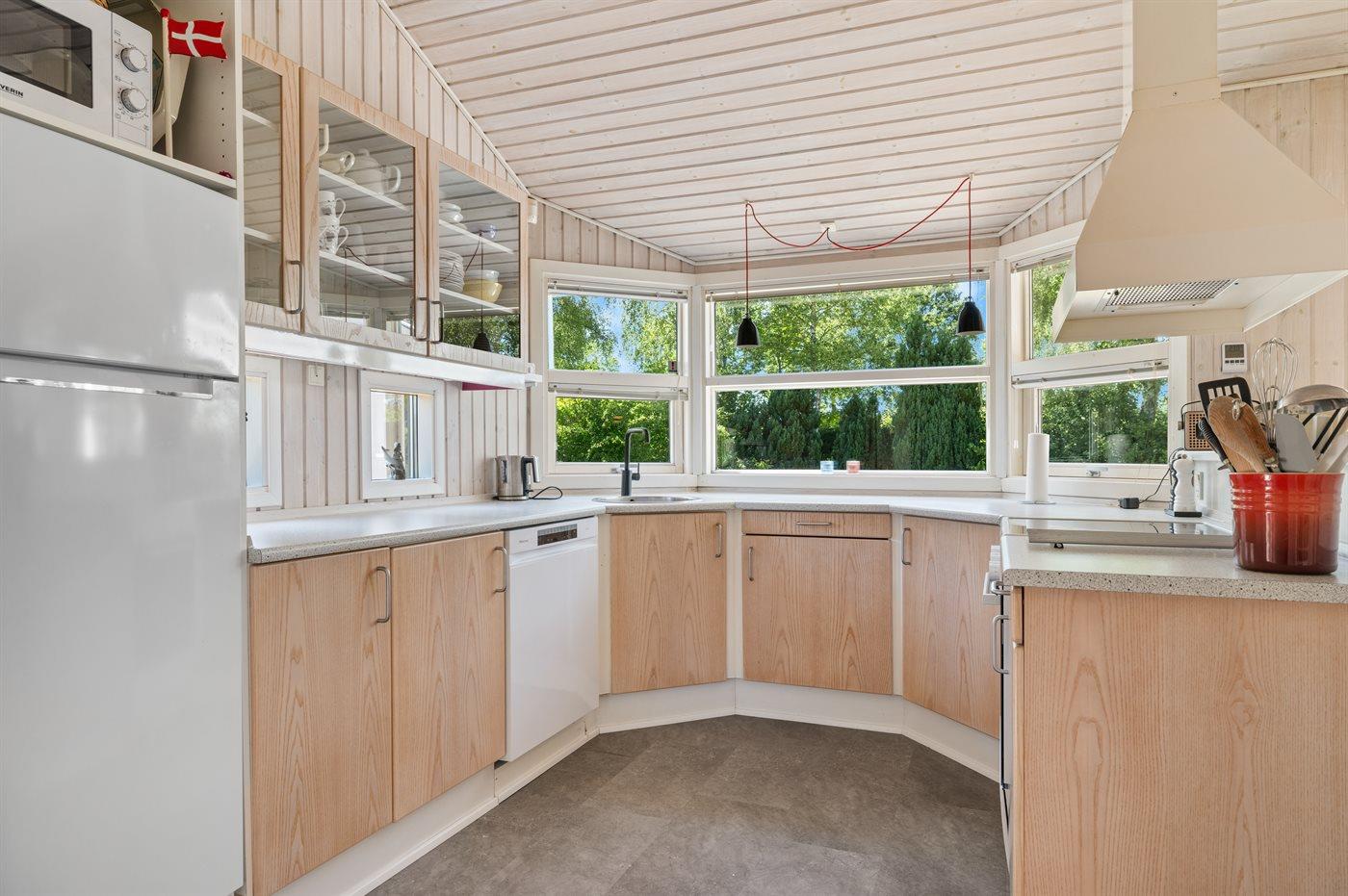 Køkkenet er udstyret med 1 køleskab. Der er 4 keramiske kogeplader, varmluftovn, mikrobølgeovn samt opvaskemaskine.
